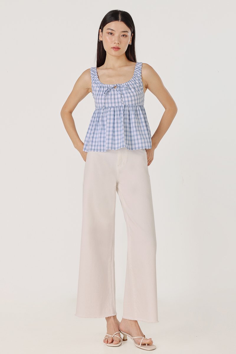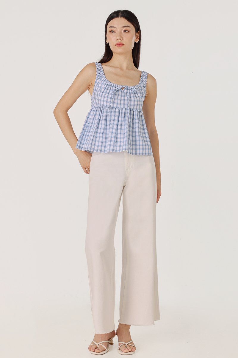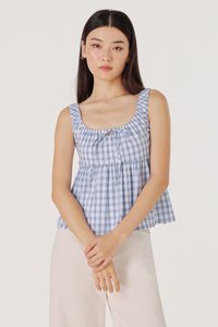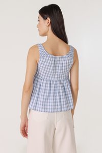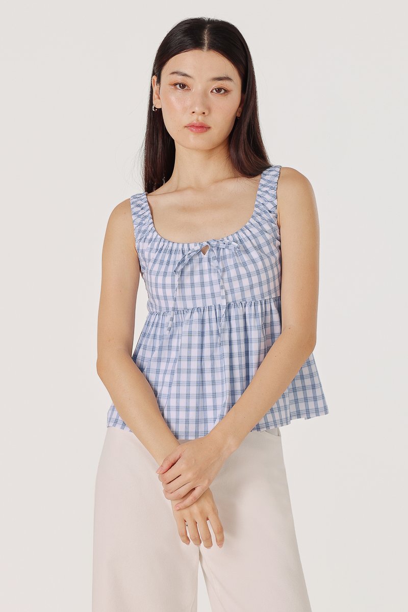 ALISHA SCOOP NECK RIBBON-TIE BABYDOLL TOP (BLUE PLAID)