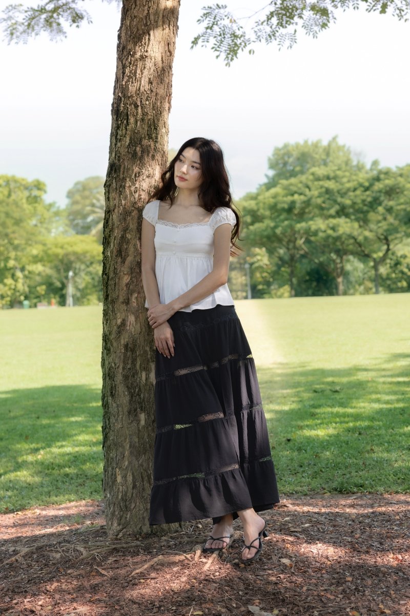 A modern take on romantic femininity. Amaria is a maxi skirt designed with lace inserts that create a graceful contrast against soft polyester blend. Made to flatter, her subtle front slit and flowy tiered silhouette graces with every step. She also features an elastic waistband and pull-on styling, combining comfort with understated elegance. Perfected with functional side pockets for an added touch of practicality. Made for moments from candlelit dinners to garden picnics.