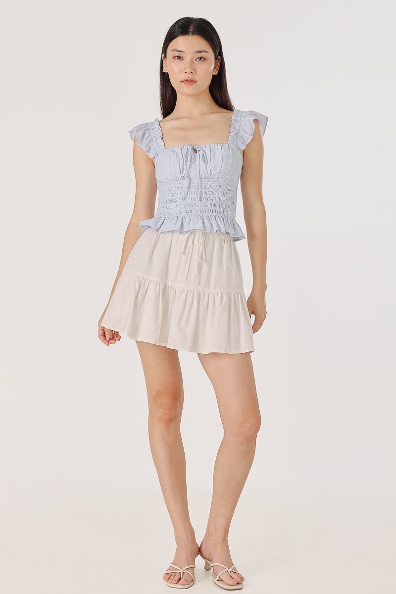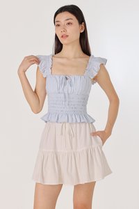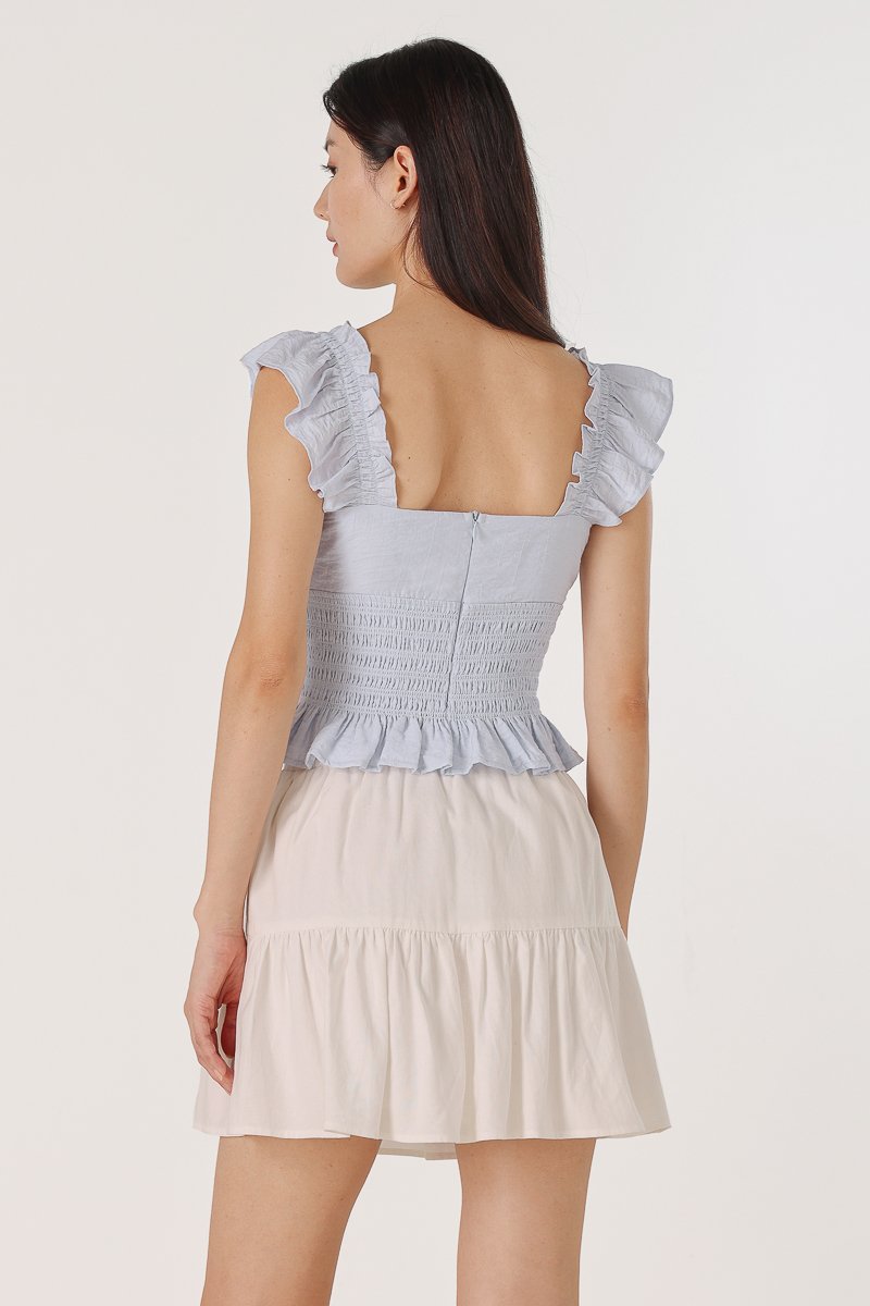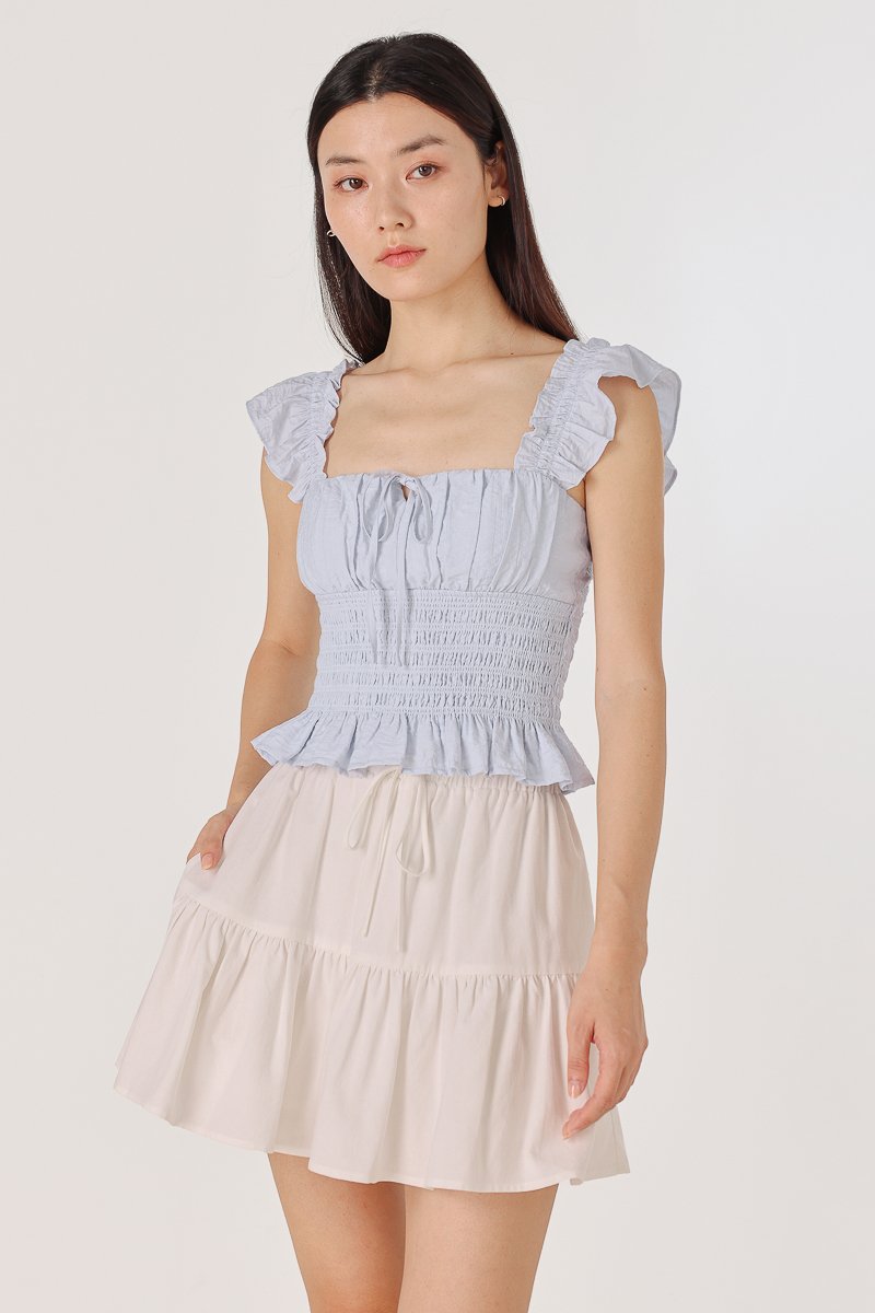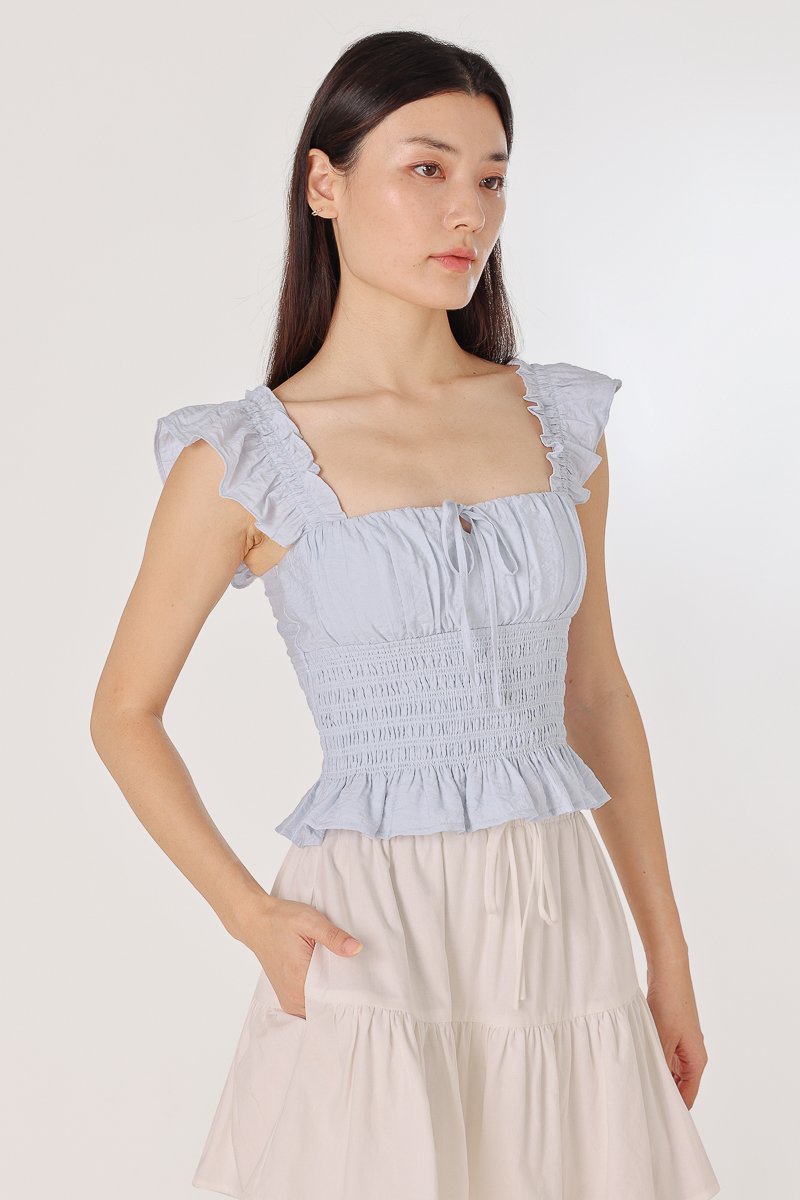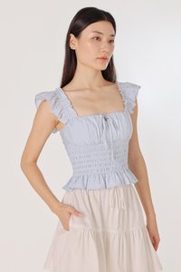 AVENLY PADDED RUFFLE STRAP SMOCKED WAIST TOP (BLUE)