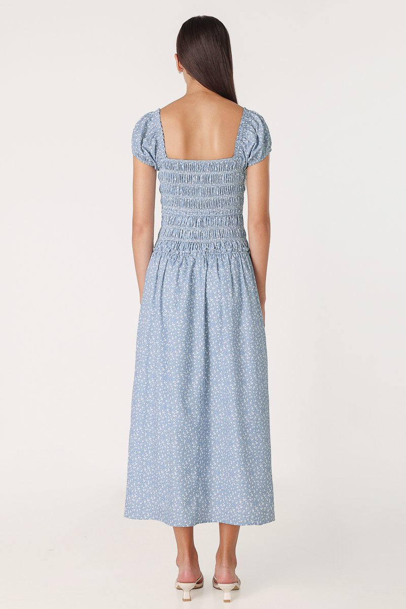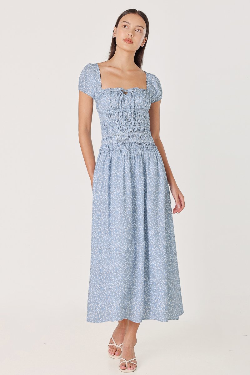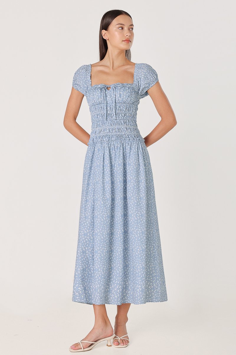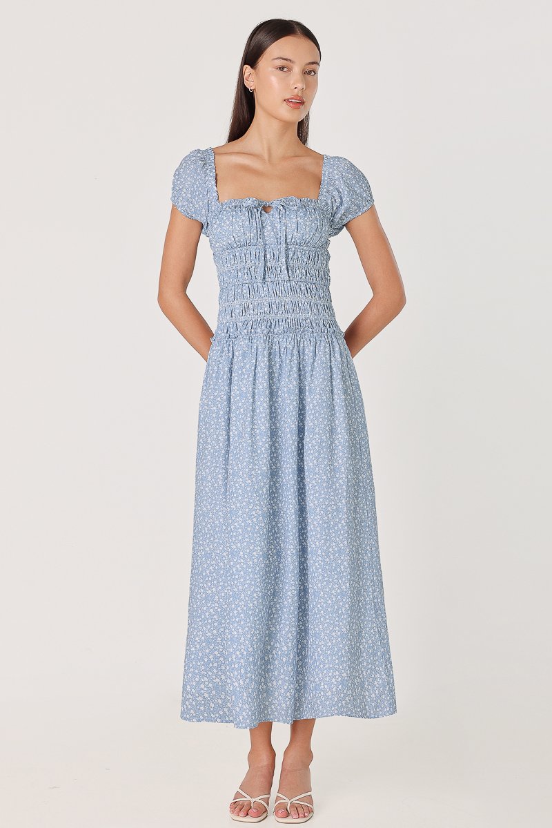 AVIELLE PADDED RUCHED RIBBON-TIE MAXI DRESS (BLUE FLORAL)