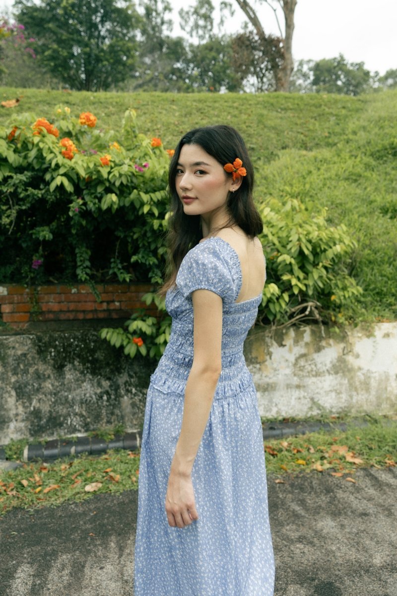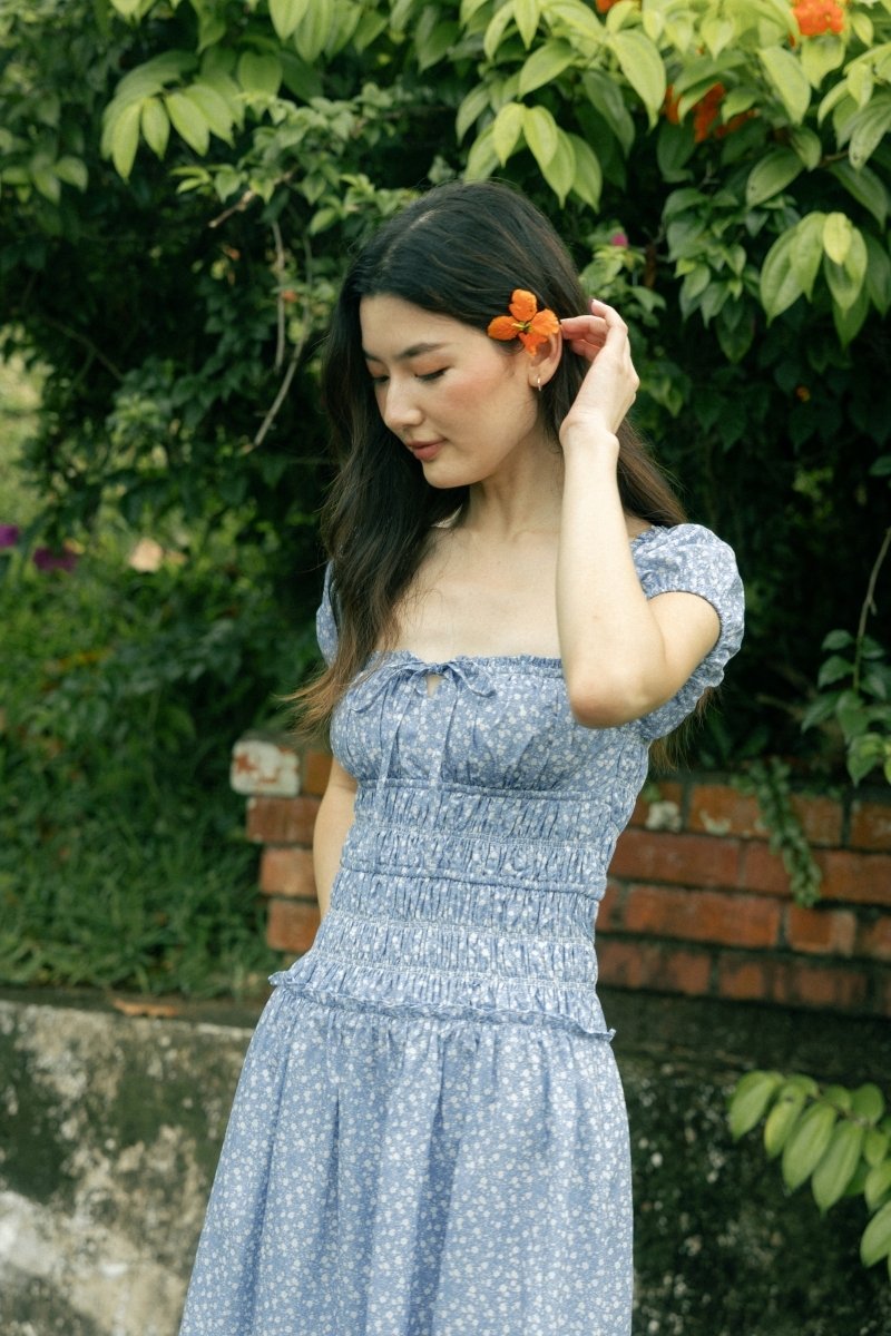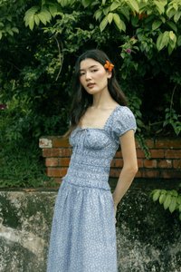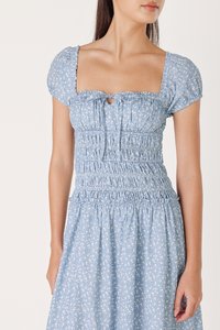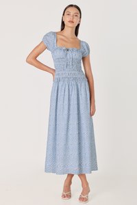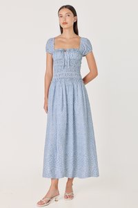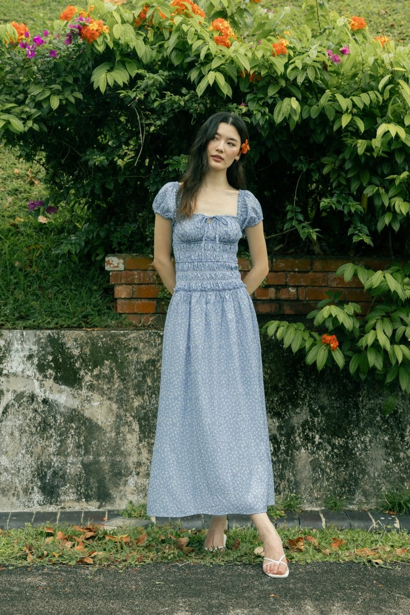 AVIELLE PADDED RUCHED RIBBON-TIE MAXI DRESS (BLUE FLORAL)