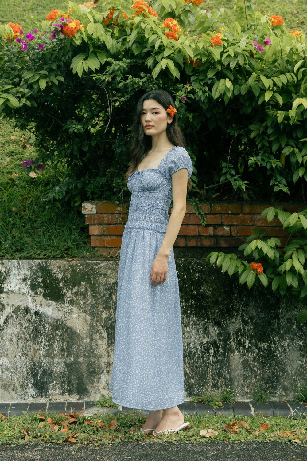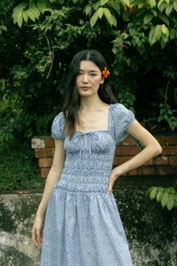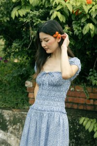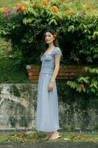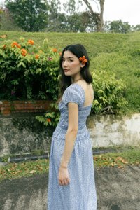 Model Du Yue UK6, 173.5cm (PTP 15.25", Waist 11.5") wears size S for tops/dresses/outerwears/one-pieces and size XS for bottoms.