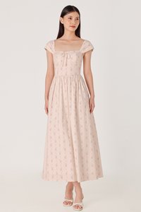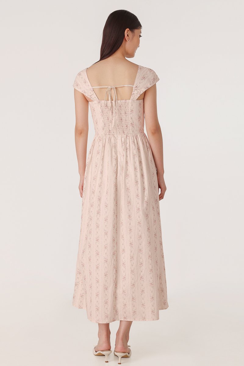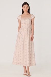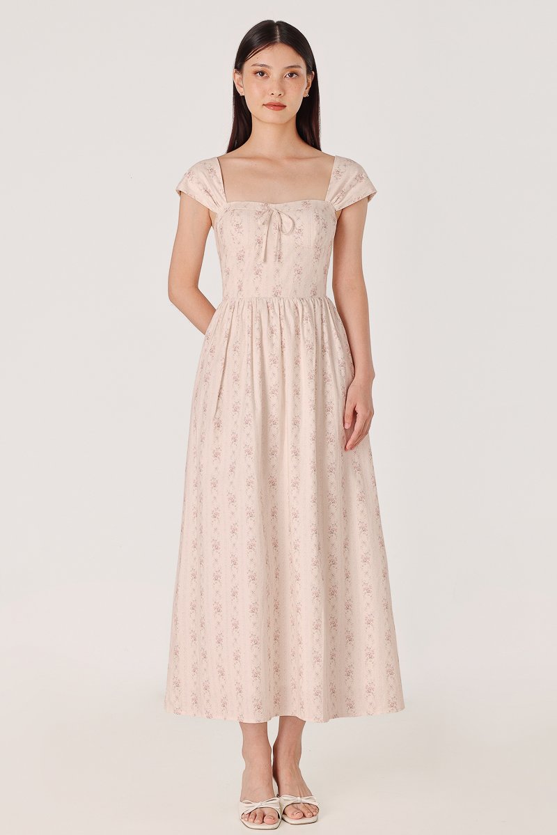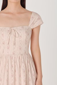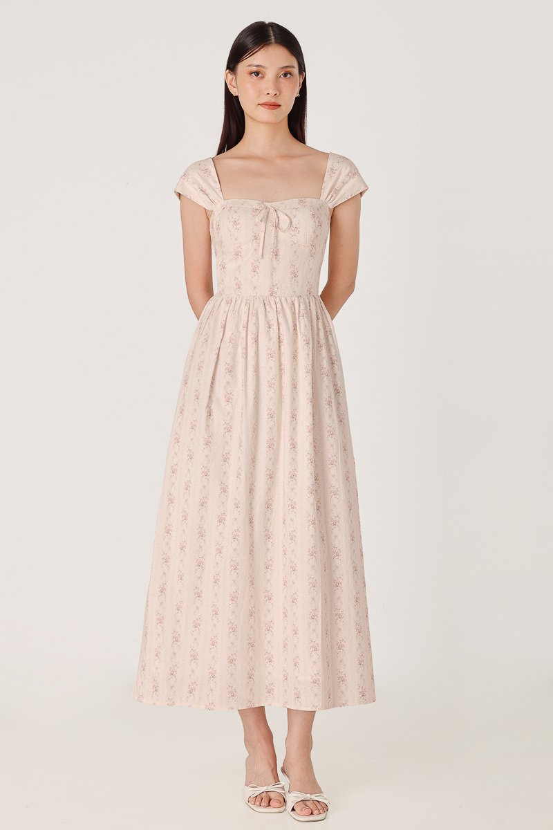 BROOKLYN PADDED FLORAL BUSTIER RIBBON CAP SLEEVE MIDAXI DRESS