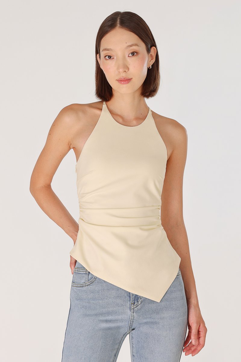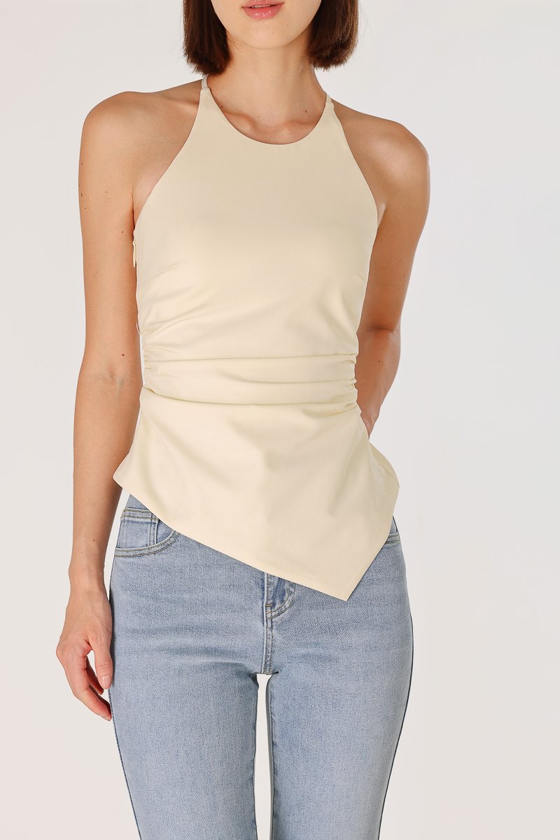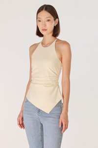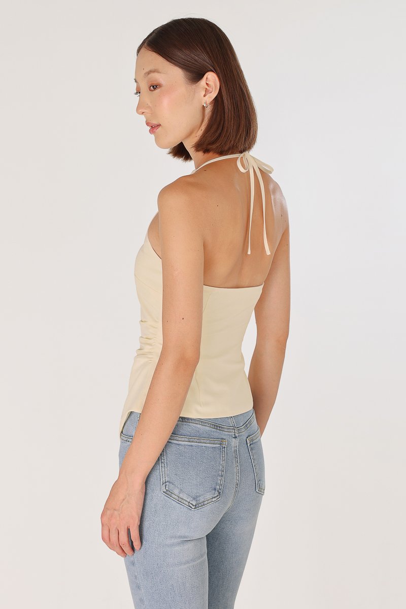 BRYNNE PADDED HALTER TIE RUCHED ASYMMETRICAL HEM TOP (YELLOW)