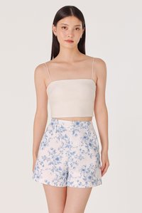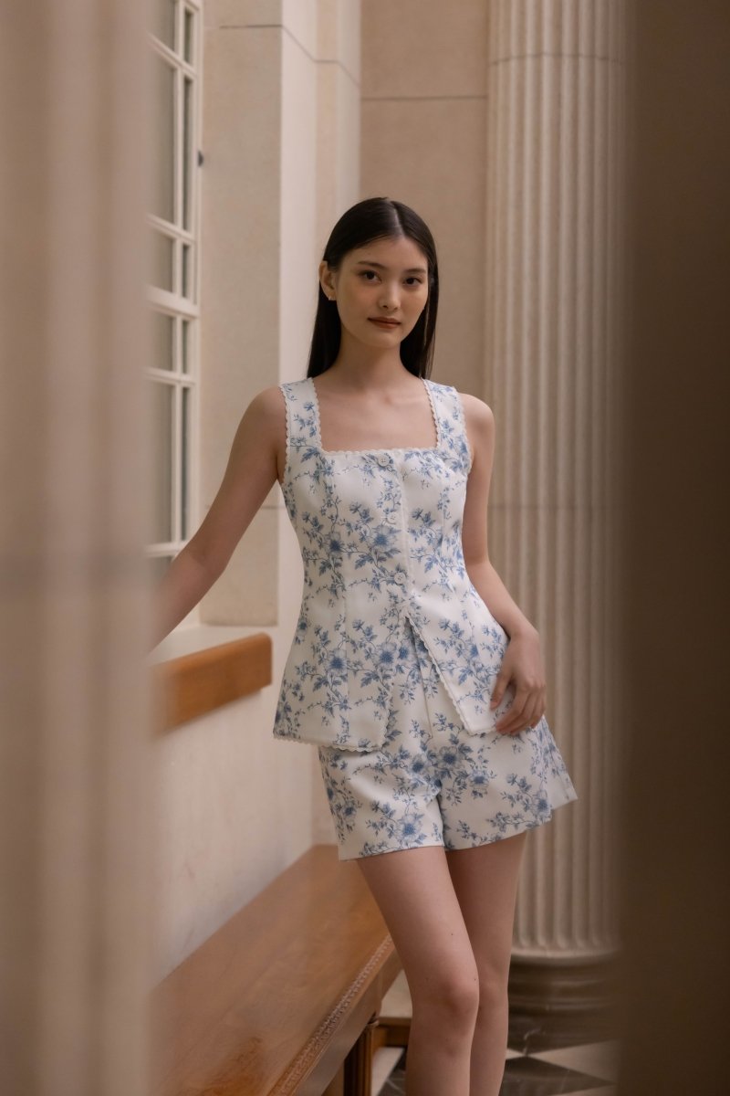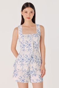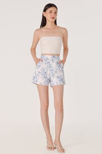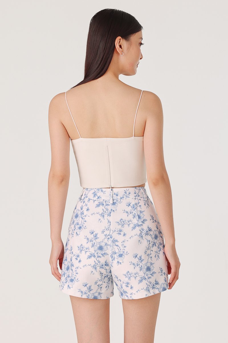 CAMELLIA LINEN PORCELAIN FLORAL FRONT CLASP SHORTS