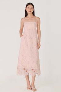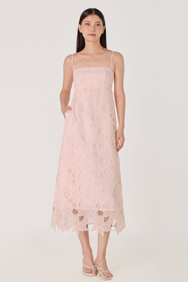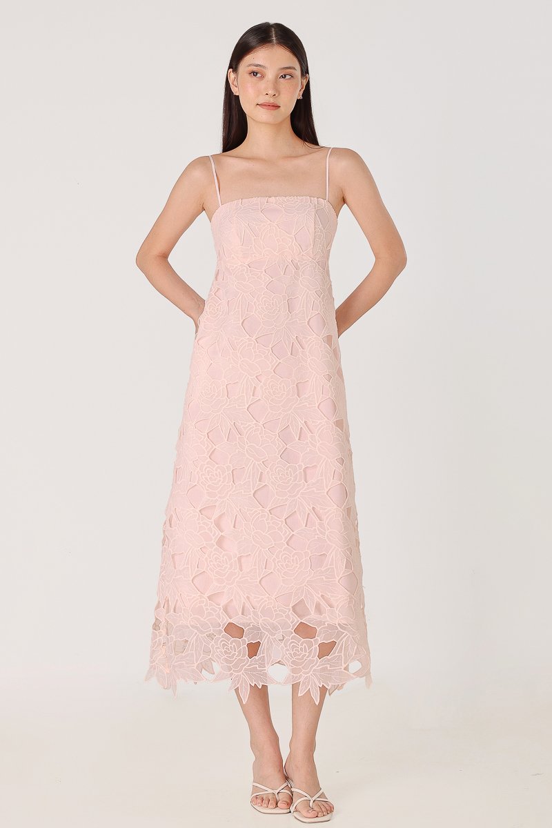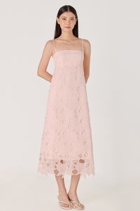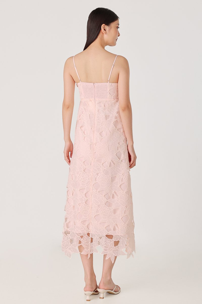 CLARINA PADDED FLORAL EYELET LACE BABYDOLL MIDAXI DRESS (PINK)