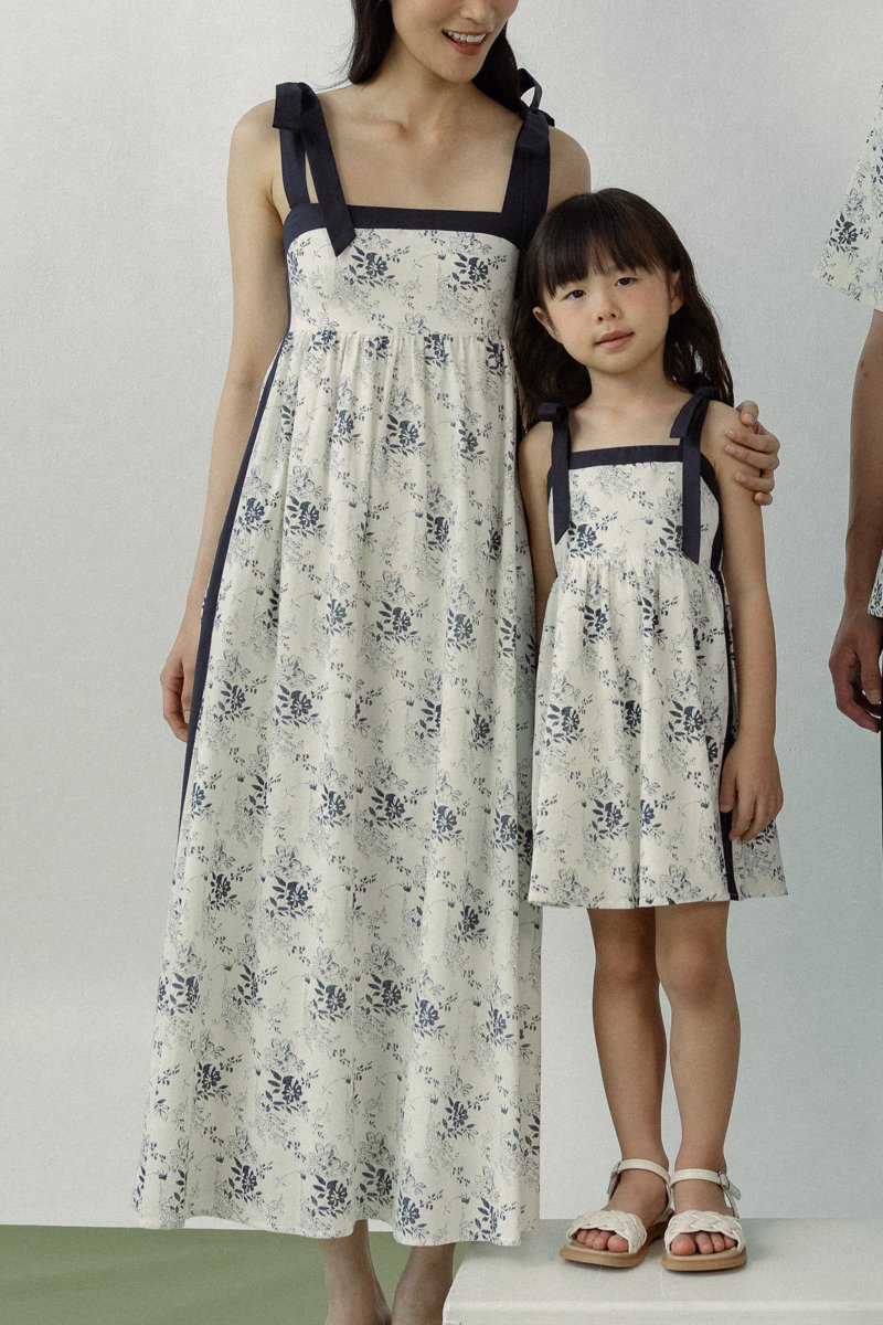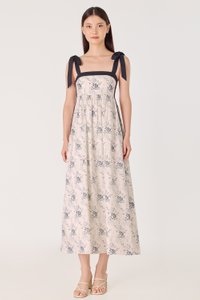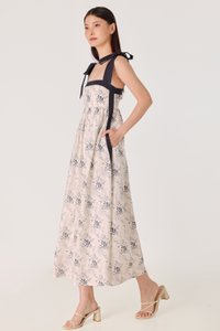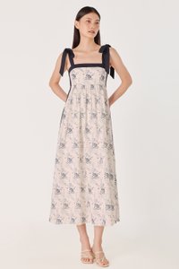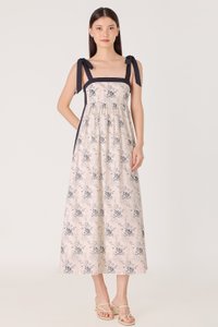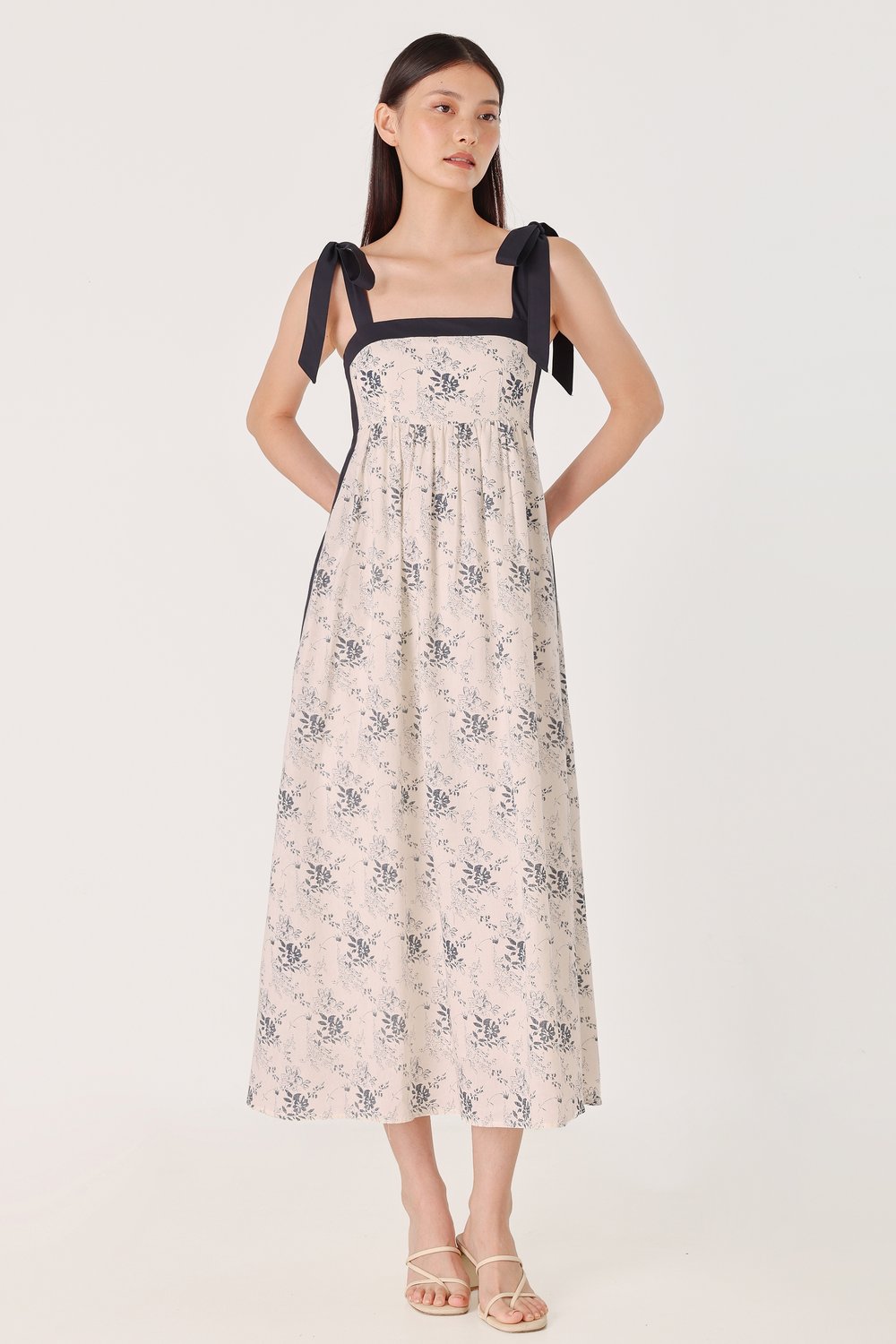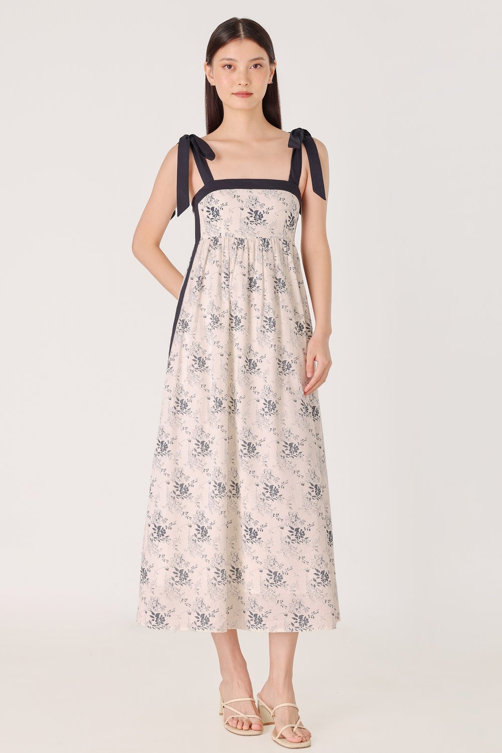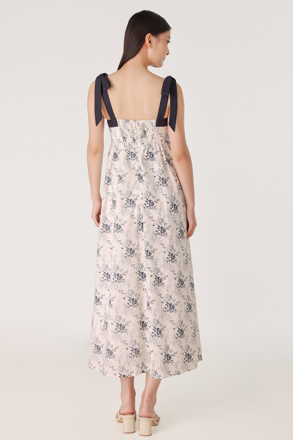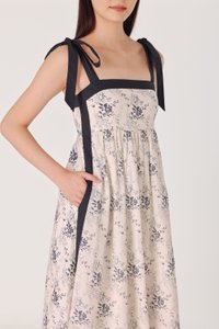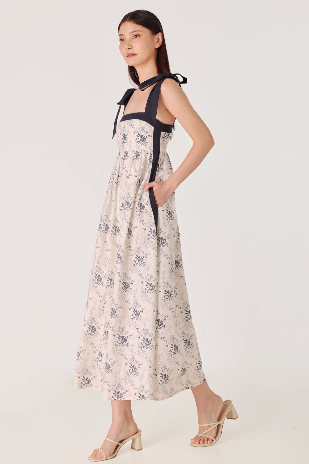 CLOVER PADDED LINEN FLORAL CONTRAST RIBBON-TIE MIDAXI DRESS