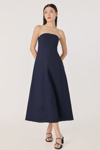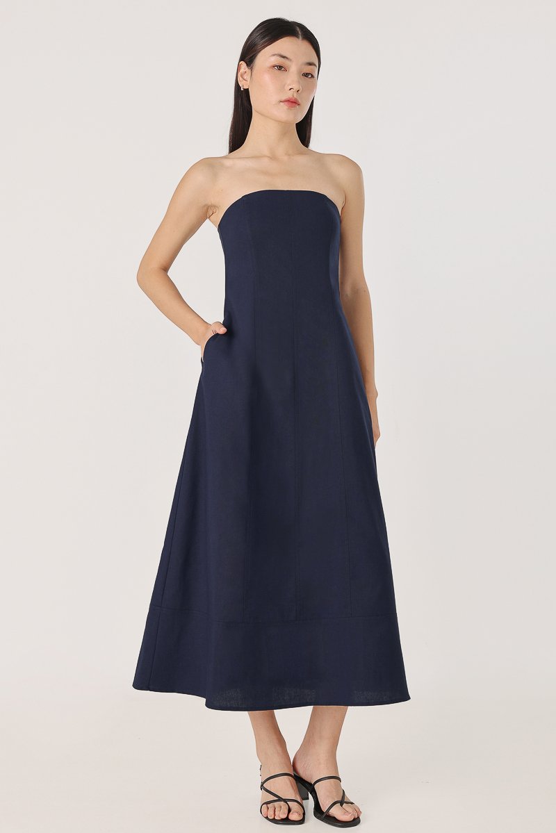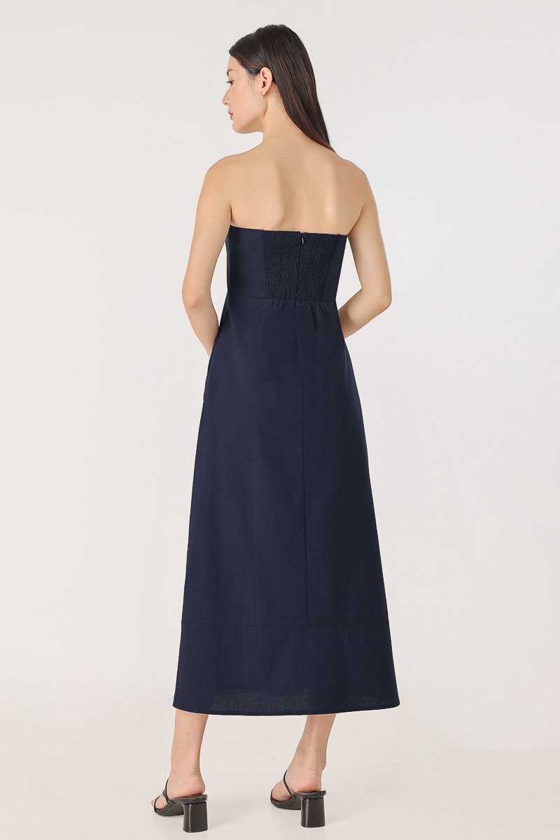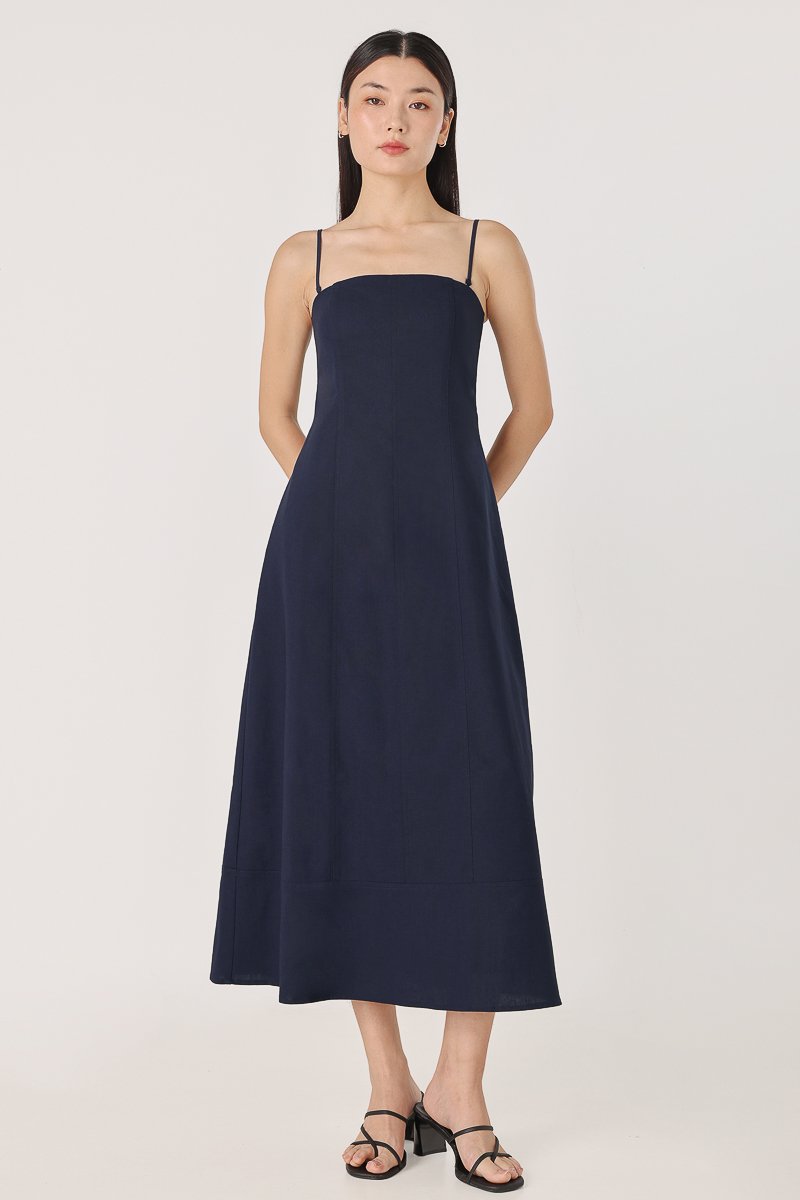 DALIYA PADDED LINEN PANELLED TWO-WAY THICK HEM MIDAXI DRESS (NAVY) *BFF*