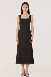 Statement in lace and sophistication. Dasha is a midaxi dress that captures timeless allure with its textured cotton blend material and intricate lace trimming design. Her contoured bodice shapes a flattering silhouette with a self-tie ribbon at the back to add a functional touch. Secured with a concealed back zipper to keep the look sleek and complemented by a non-adjustable back slit for easy movement. She is made for weekend brunches or dressier occasions, the kind of one-piece you will reach for when elegance feels effortless. To perfect it all, she comes with removable padding for ultimate comfort.