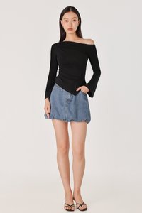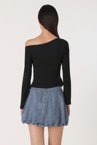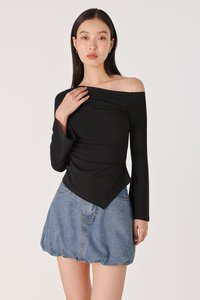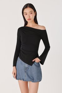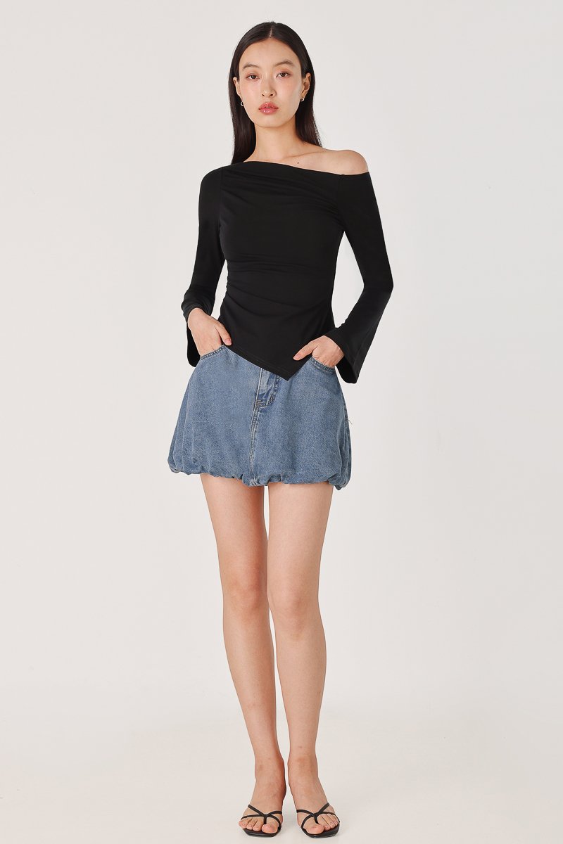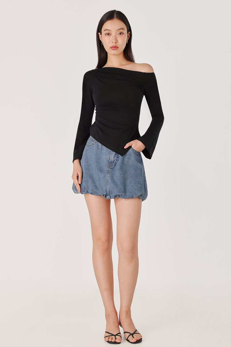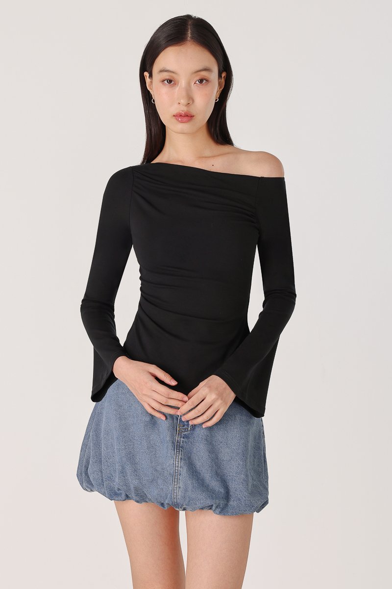 ELDORA FLARE SLEEVE OFF-SHOULDER SLANT HEM TOP (BLACK)