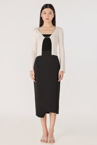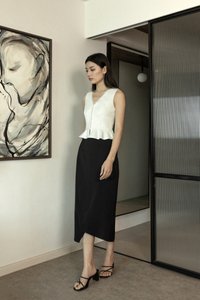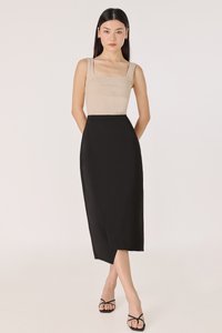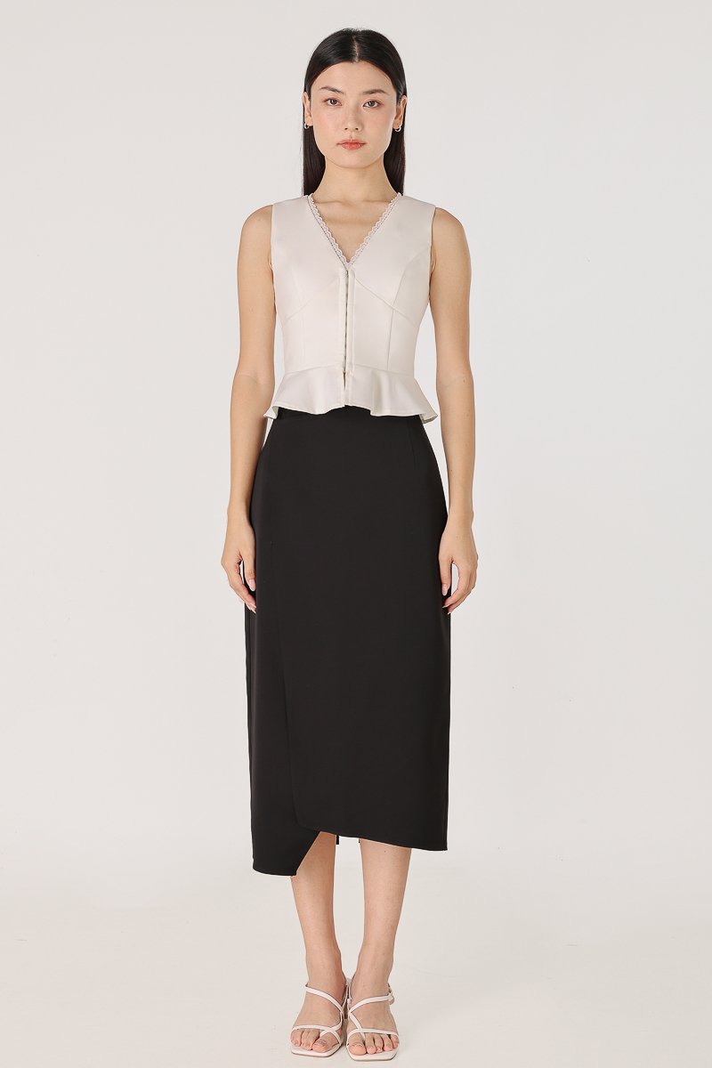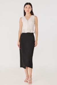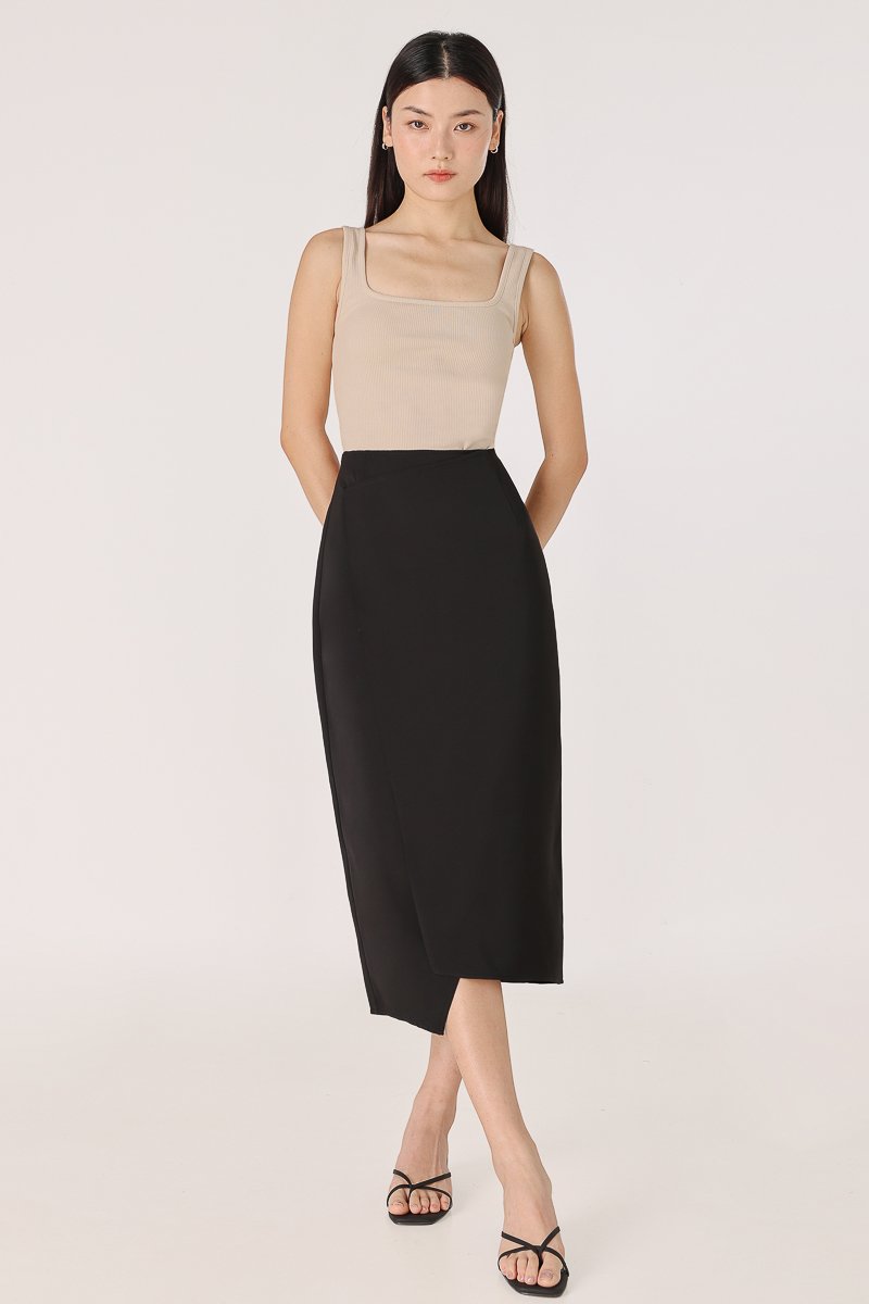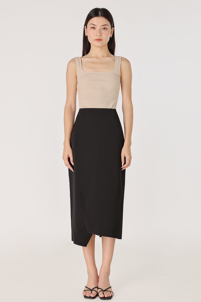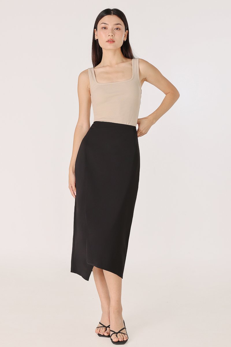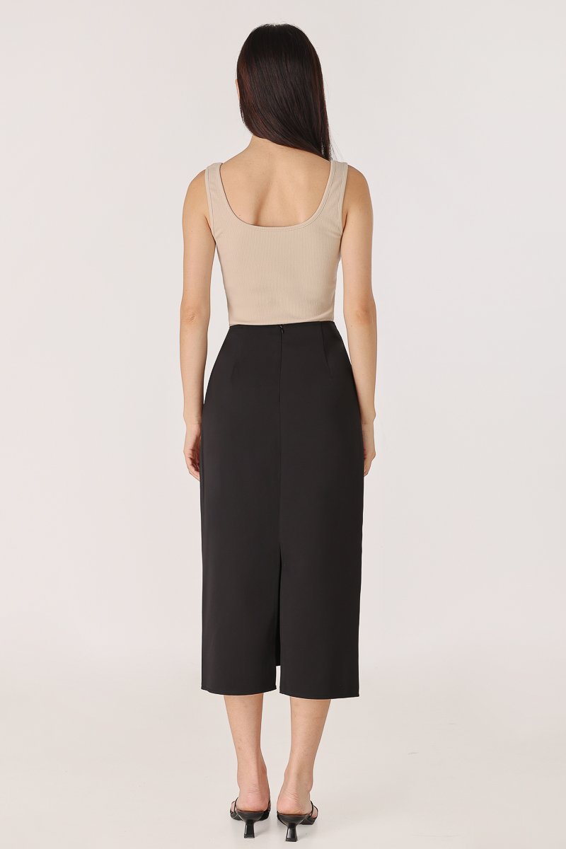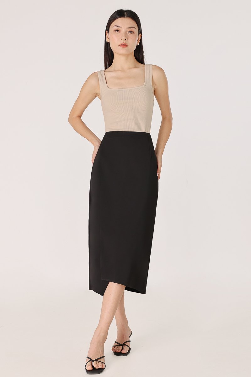 ELIZABETH ASYMMETRICAL BACK SLIT MIDAXI SKIRT (BLACK)