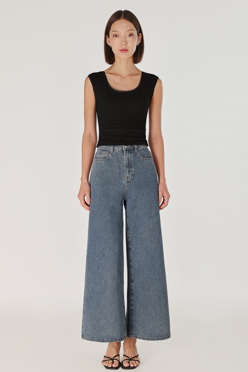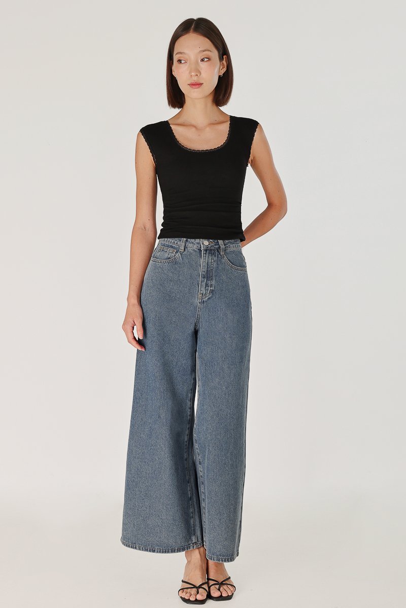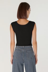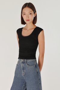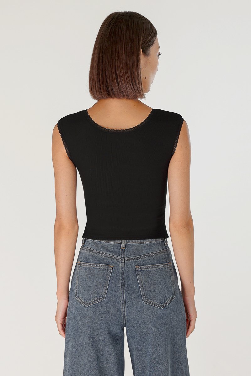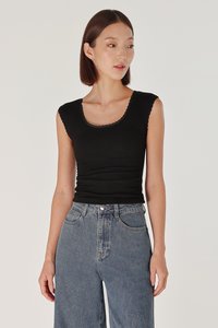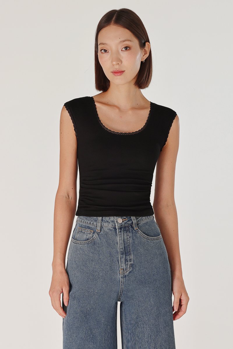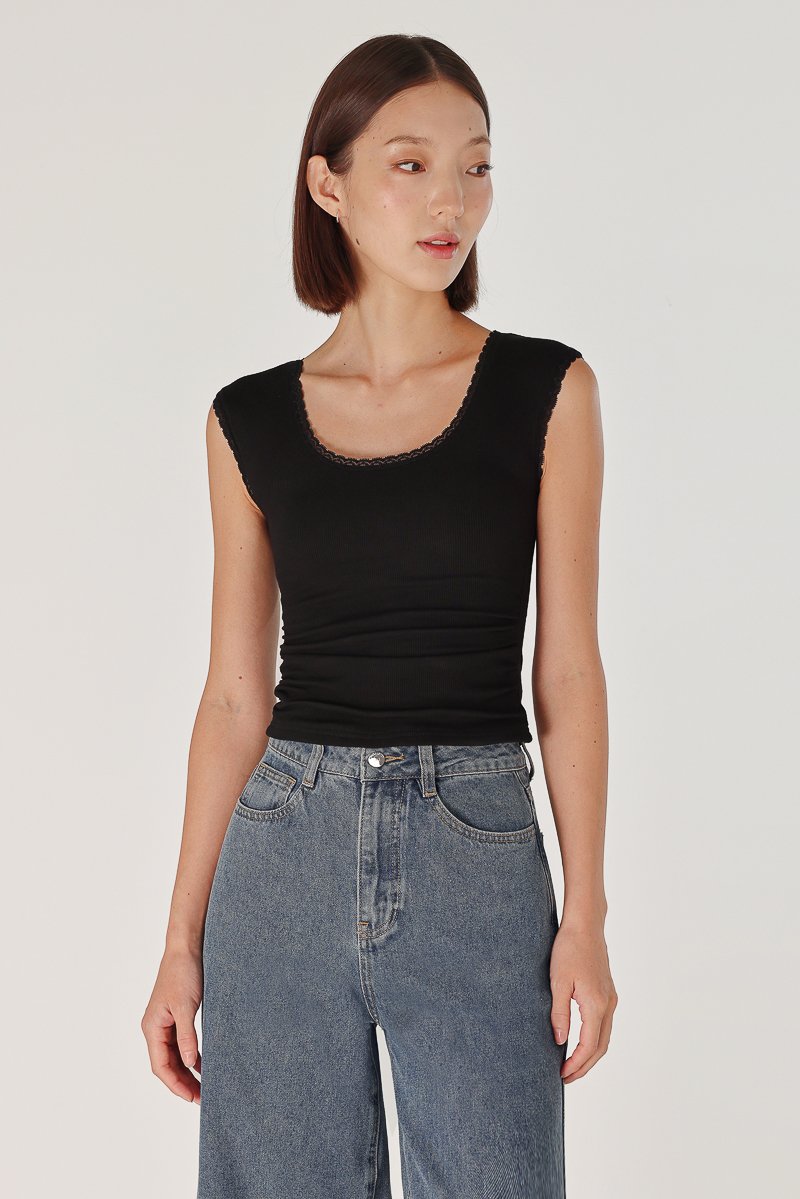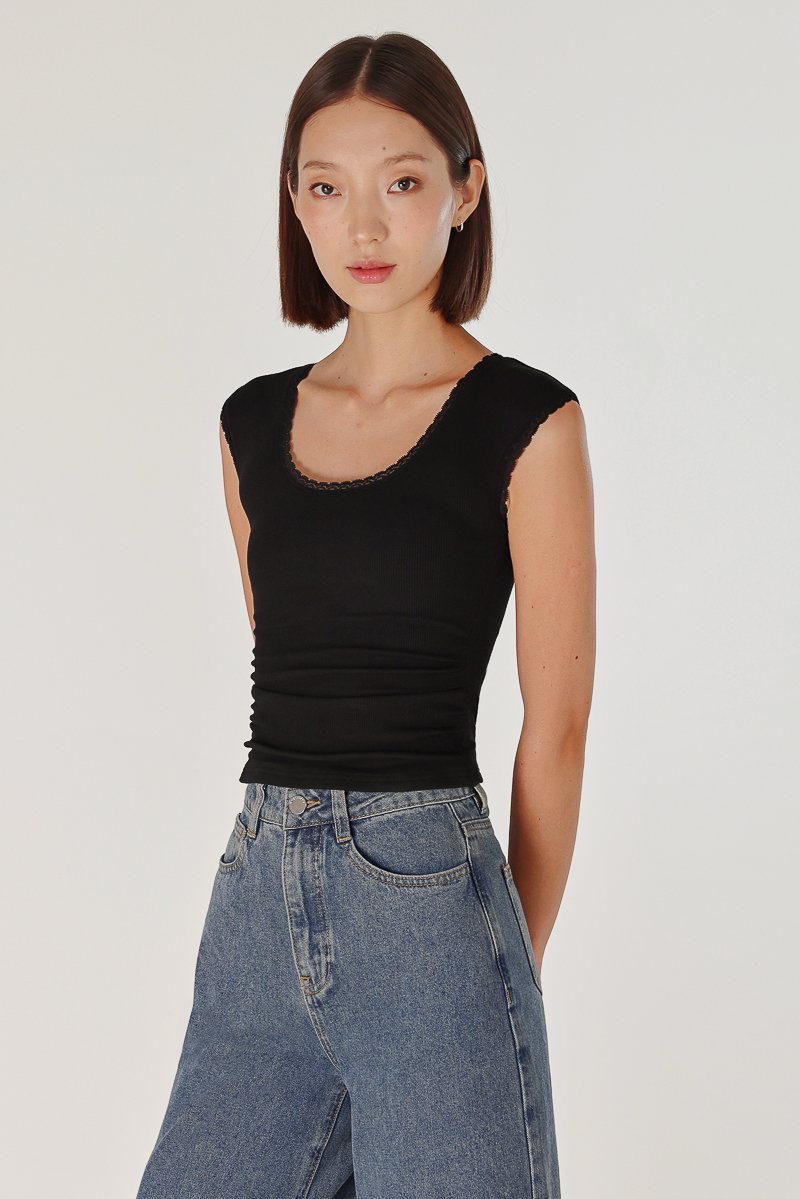 ELLIS PADDED LACE TRIM SCOOP NECK RIBBED TOP (BLACK)