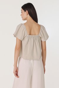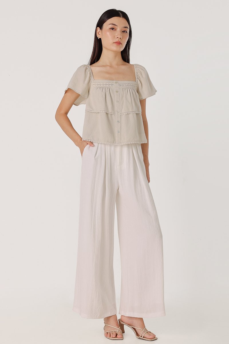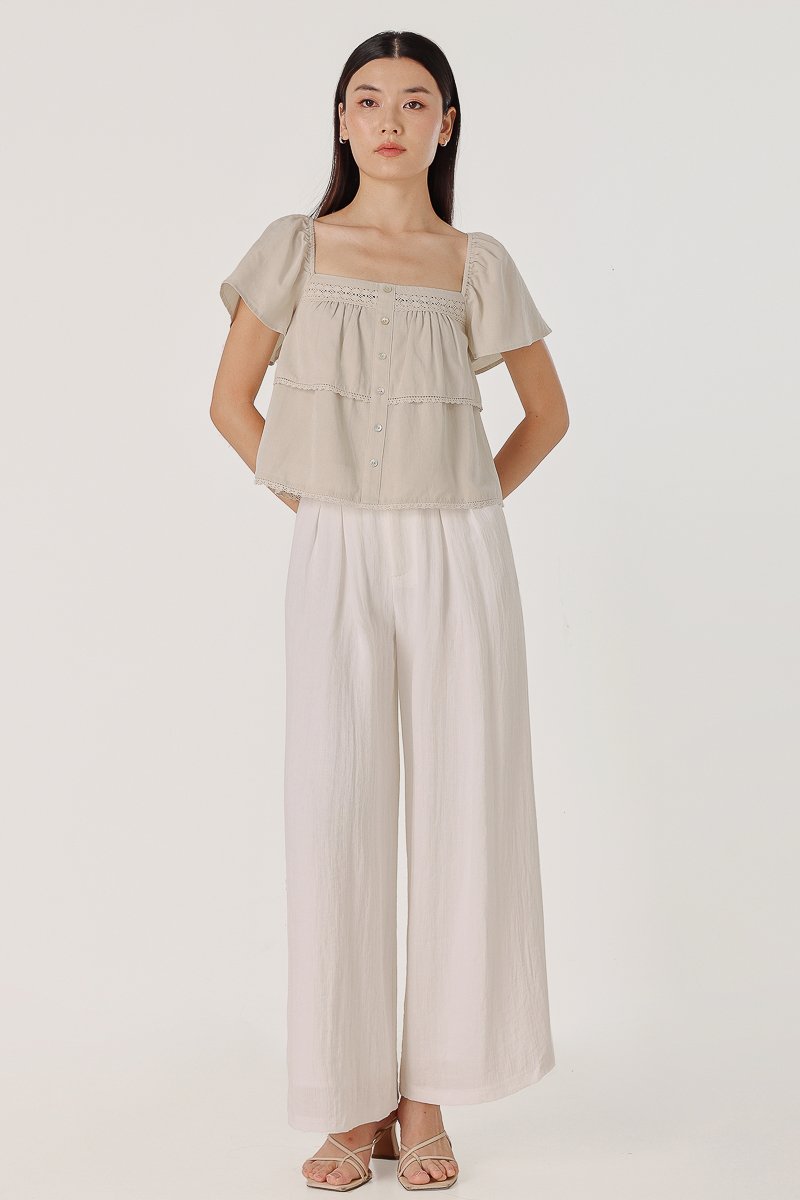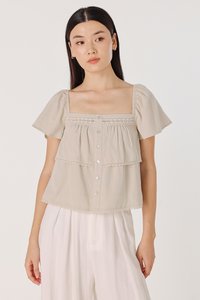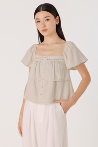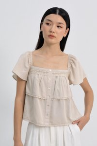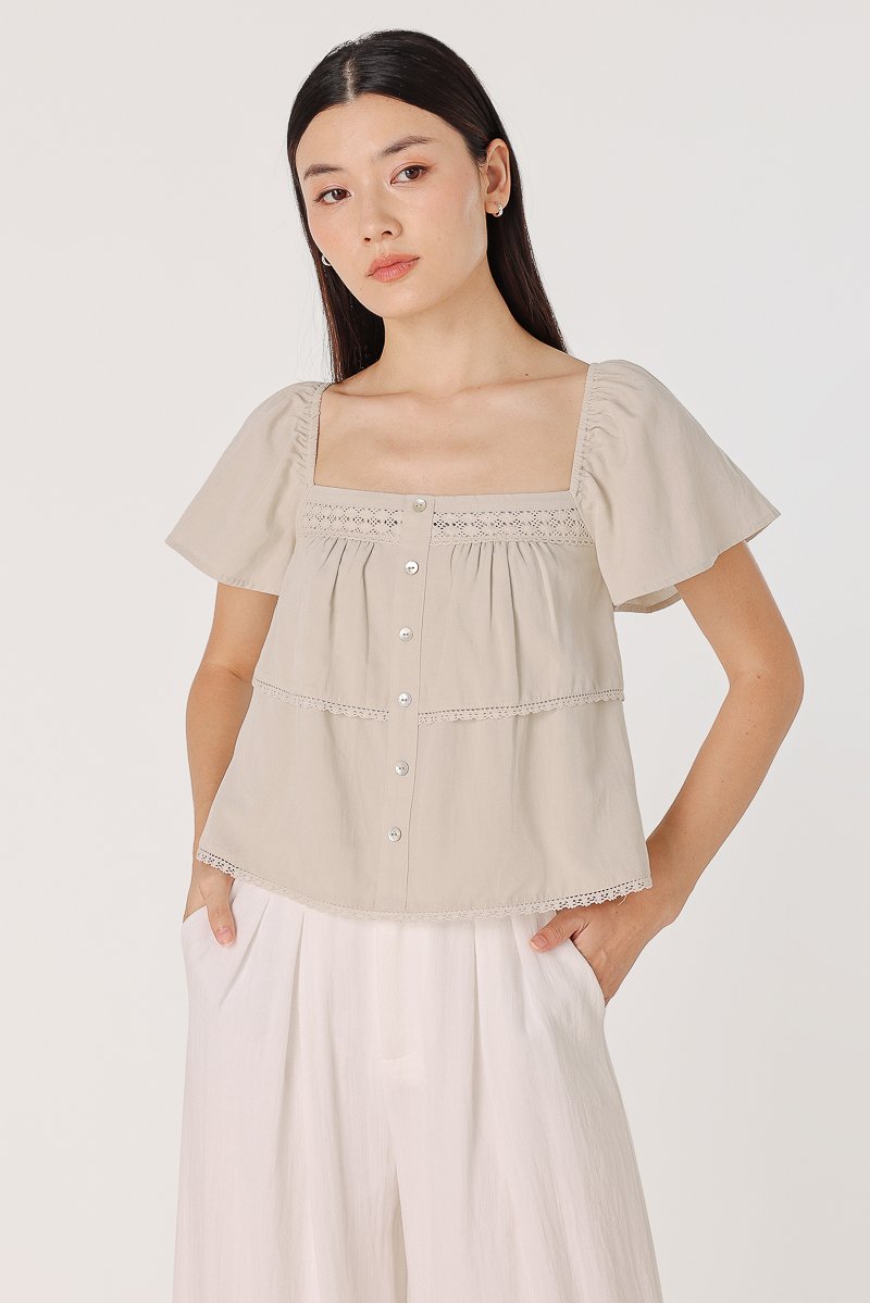 ELVIRA LACE INSERT FLUTTER SLEEVE SHELL BUTTON TOP (OAT)