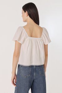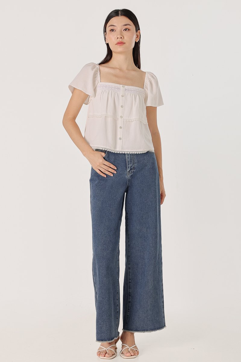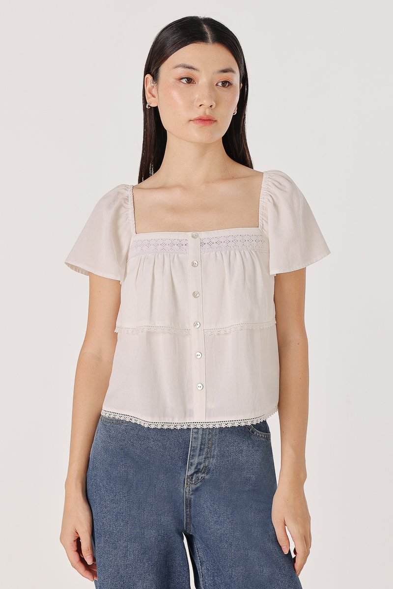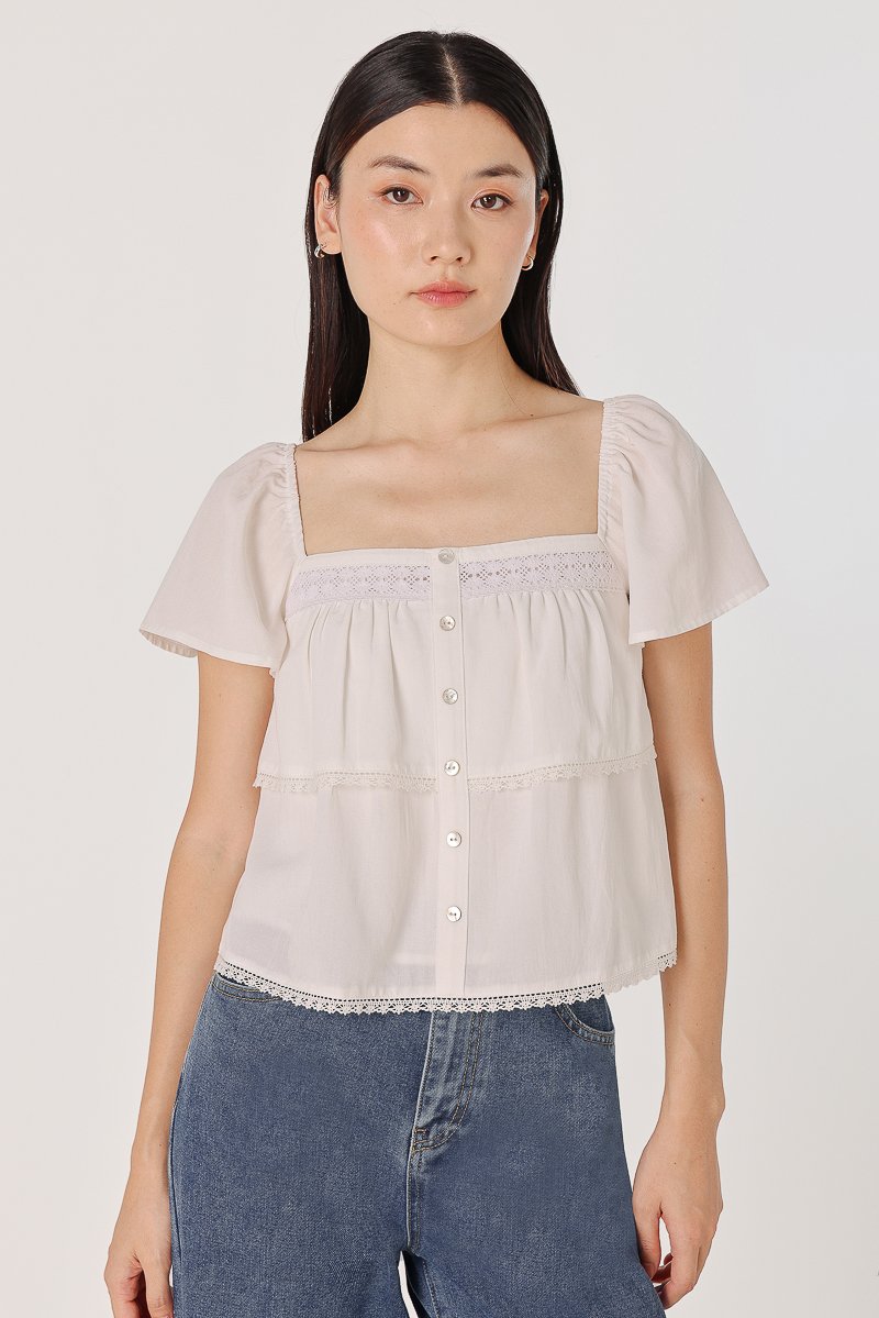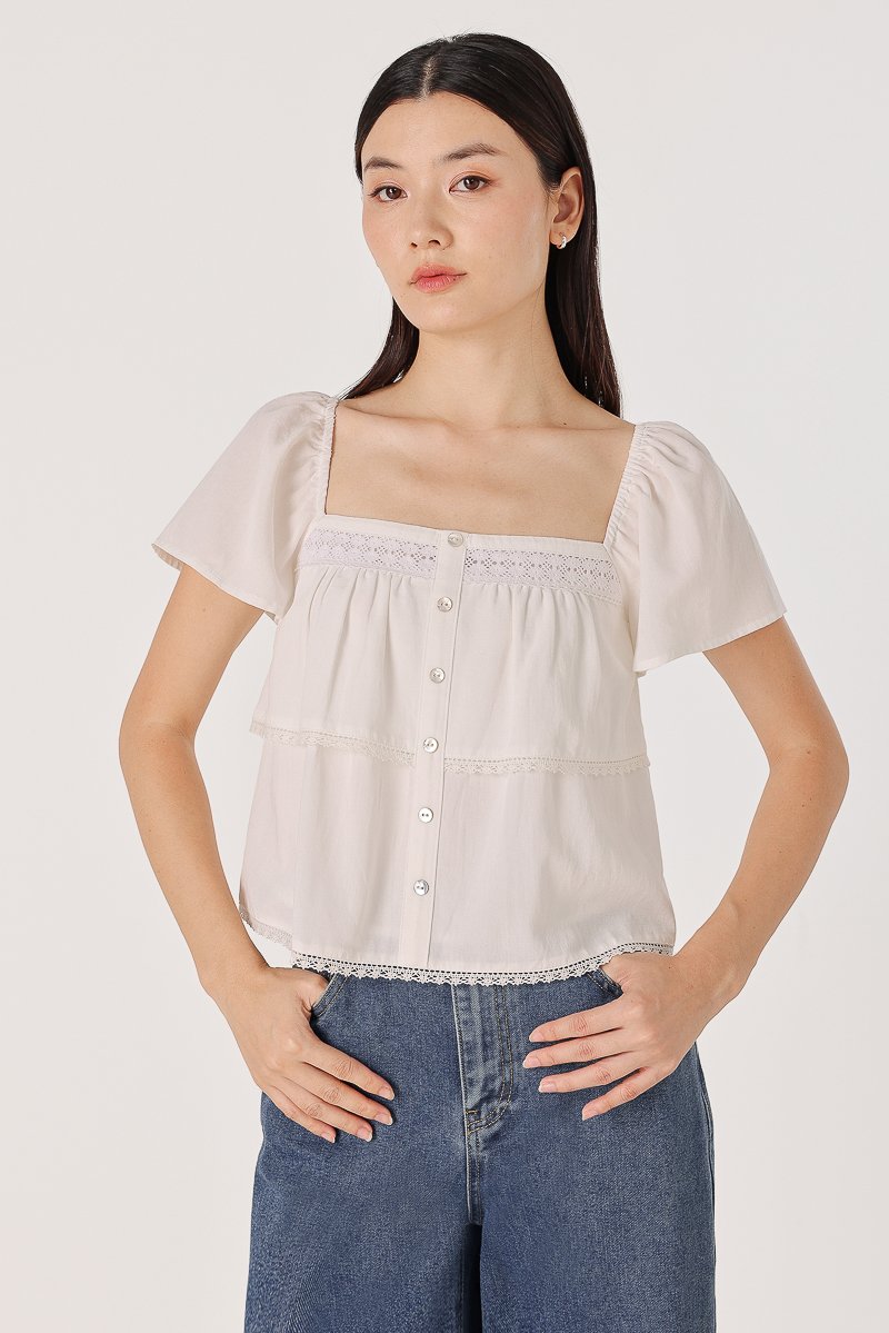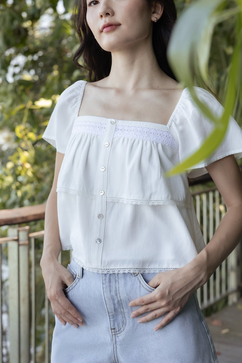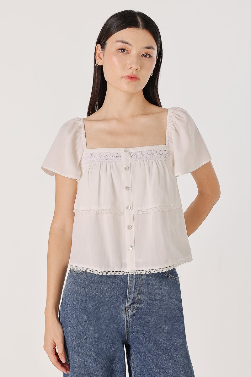 ELVIRA LACE INSERT FLUTTER SLEEVE SHELL BUTTON TOP (WHITE)