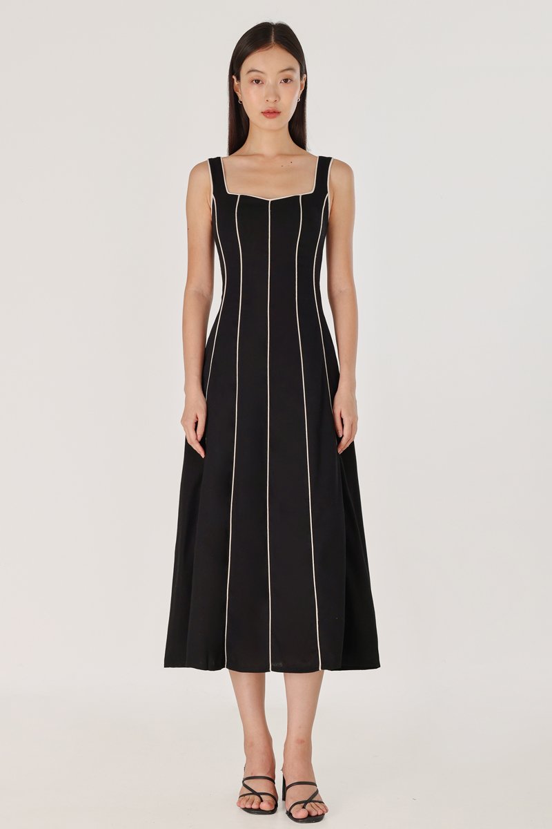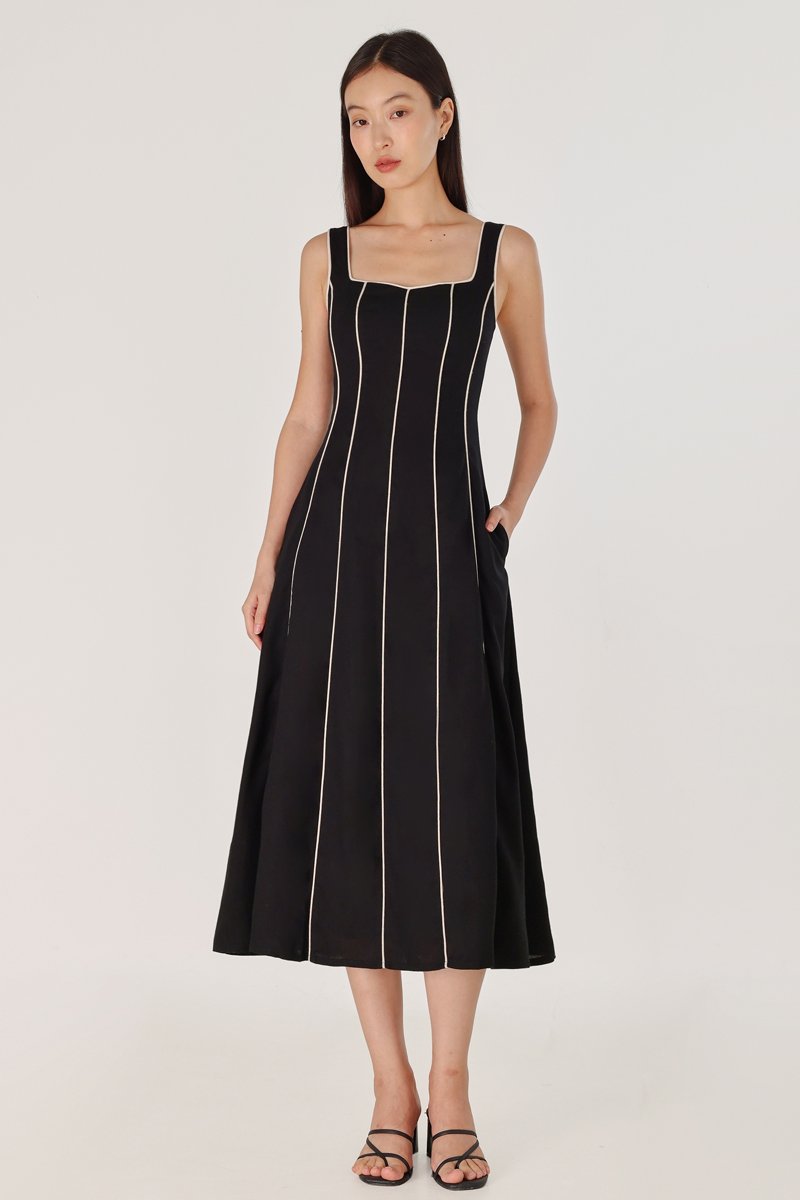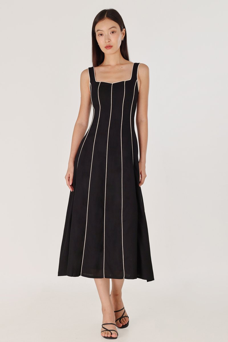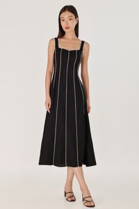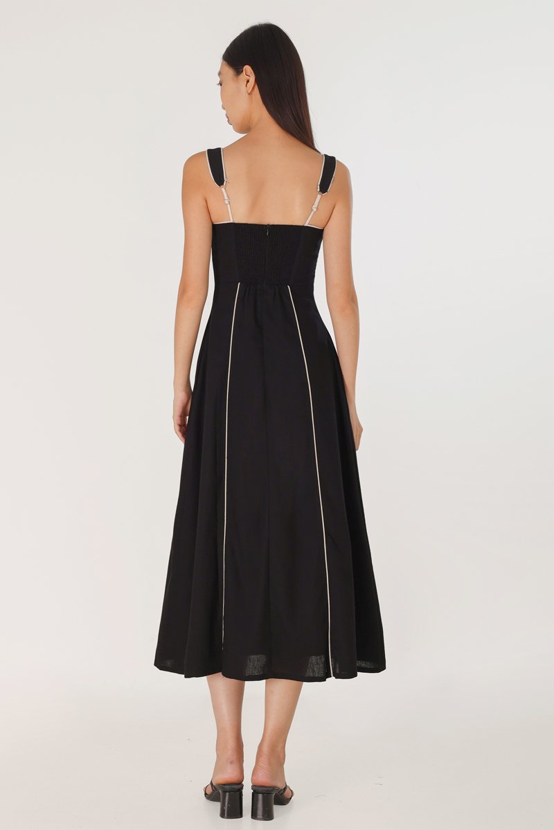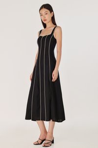 FENNA PADDED LINEN CONTRAST PIPING PANELLED MAXI DRESS (BLACK)
