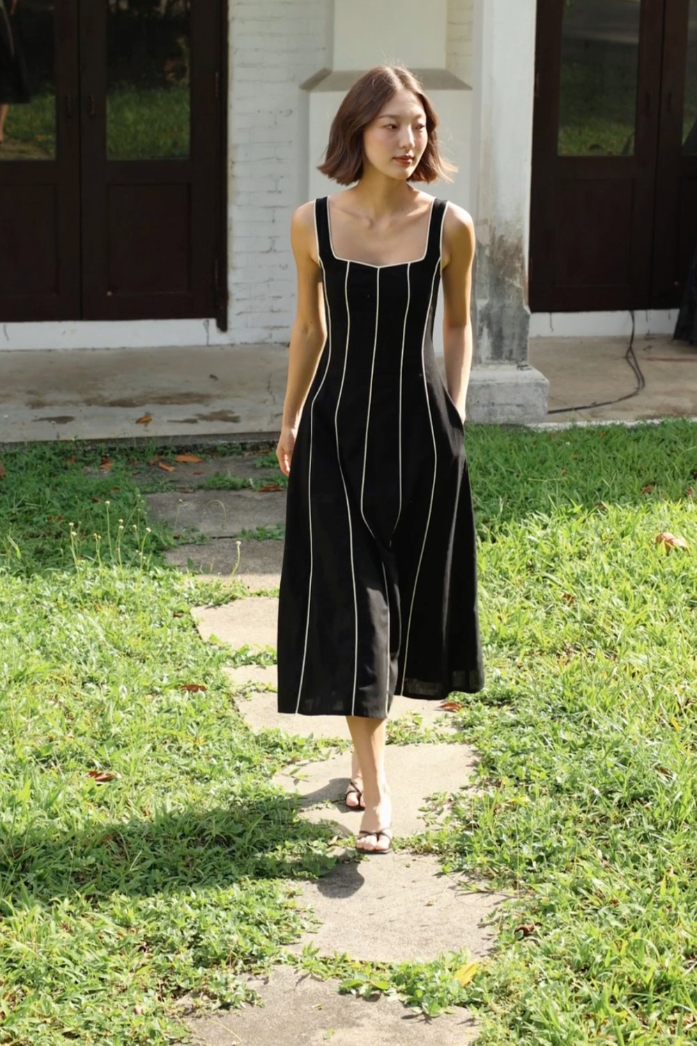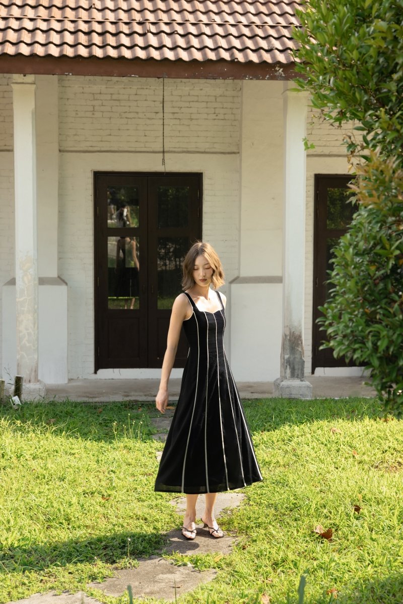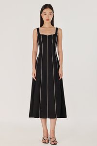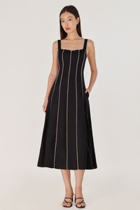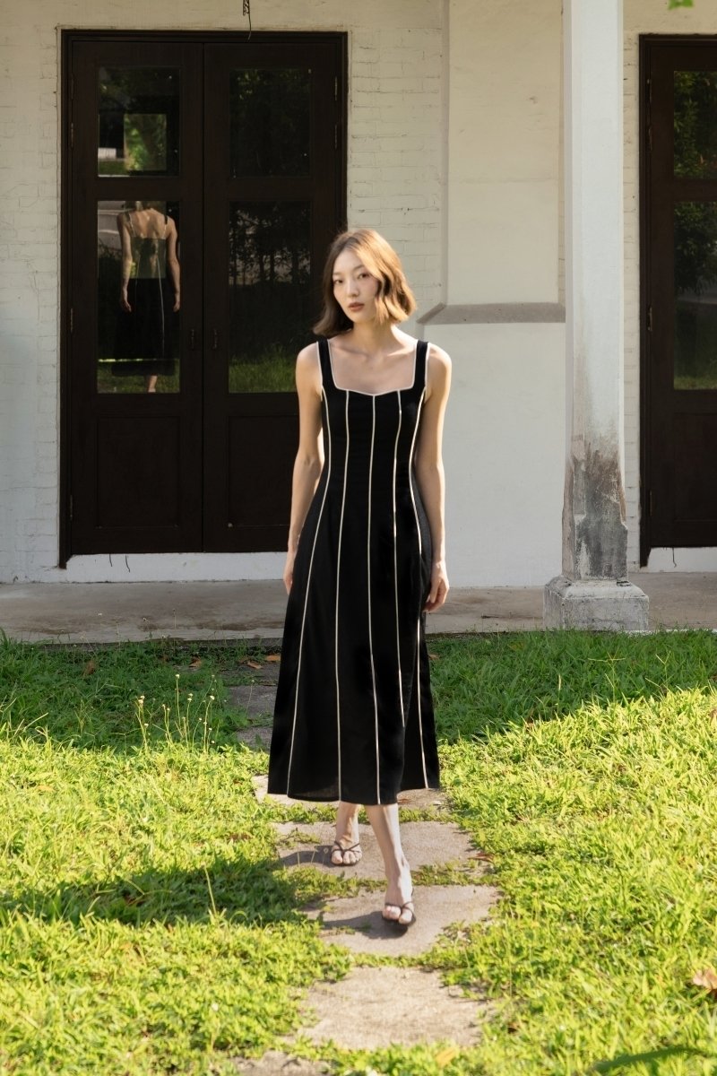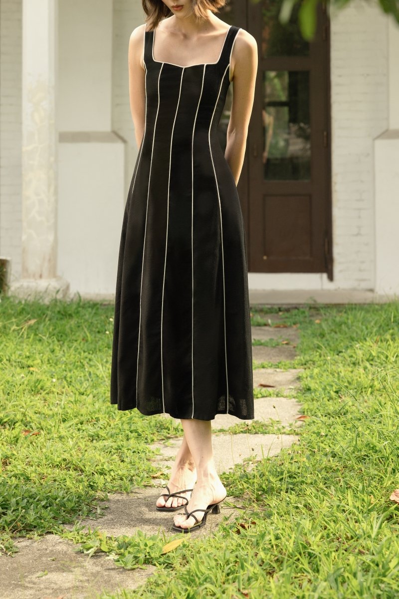 FENNA PADDED LINEN CONTRAST PIPING PANELLED MAXI DRESS (BLACK)