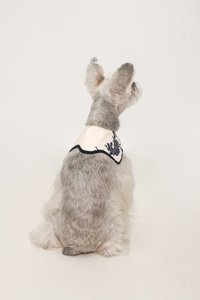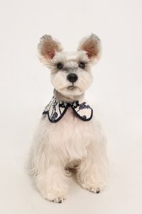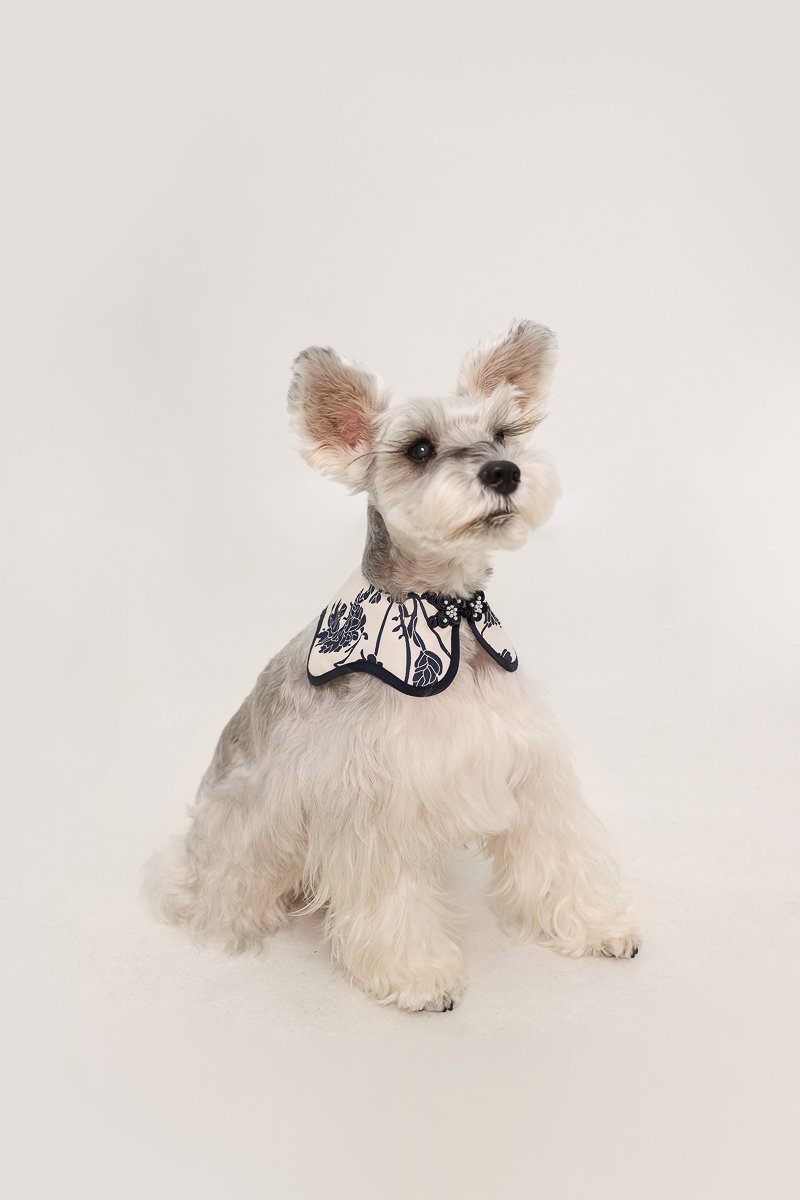 Model Sugar (Miniature Schnauzer), weighs 6.4kg with a 10.5" neck circumference, and wears size S.
