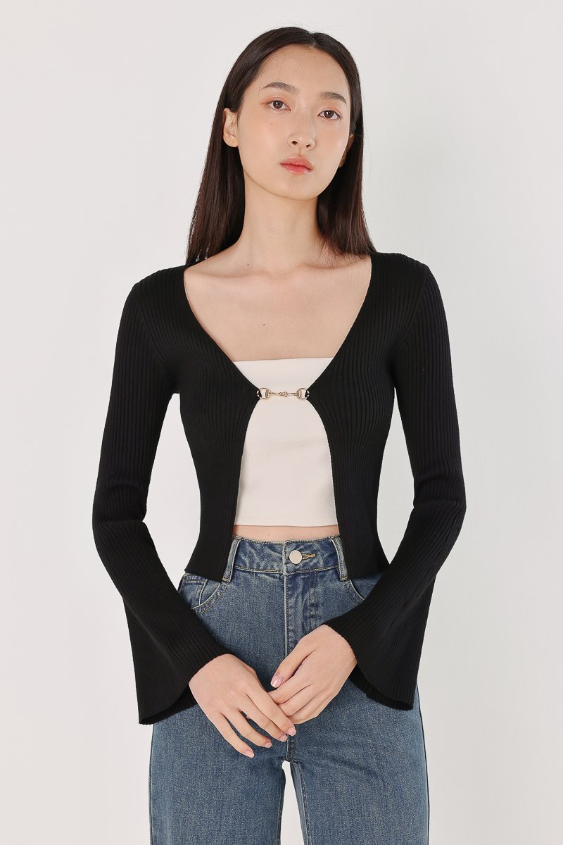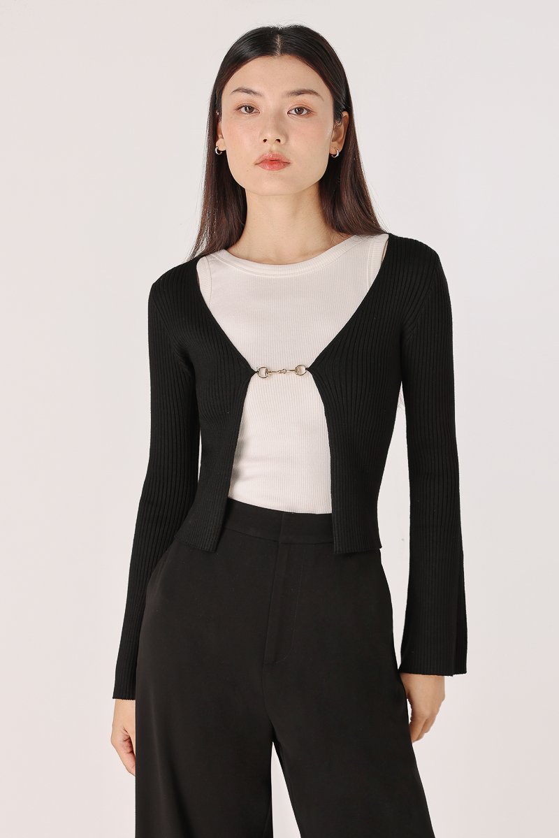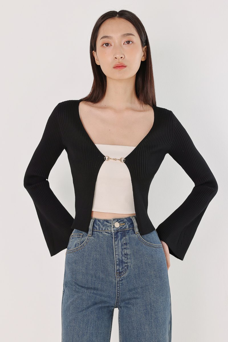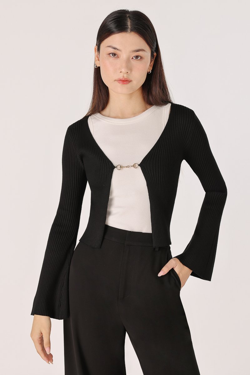 FIO FLARE SLEEVE FRONT BUCKLE KNIT CARDIGAN (BLACK)