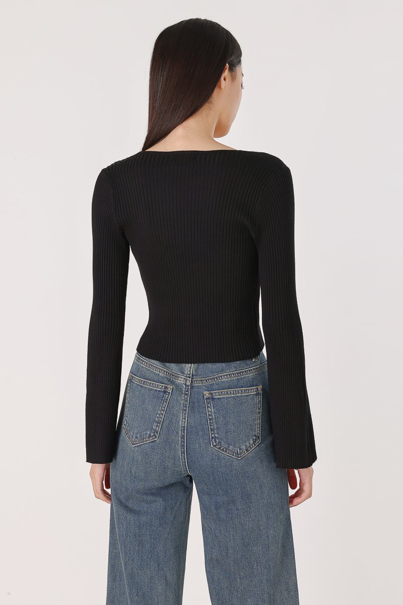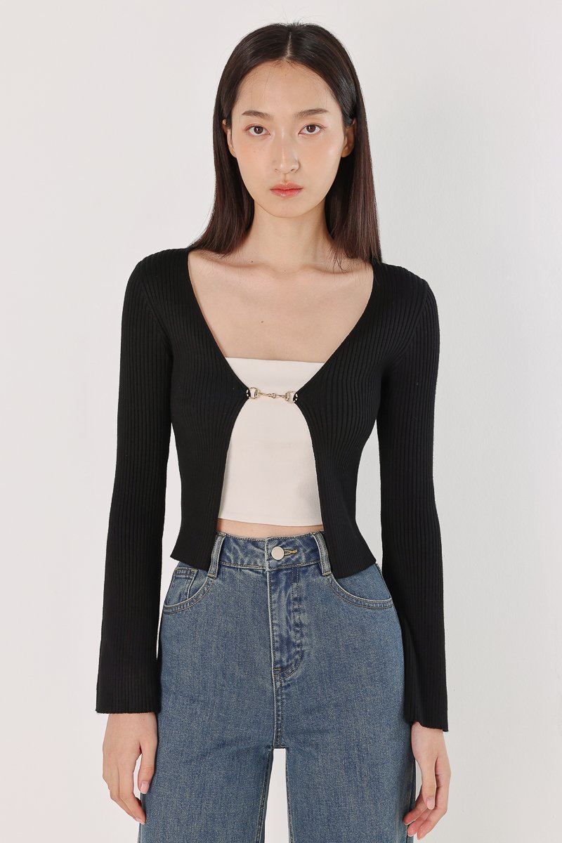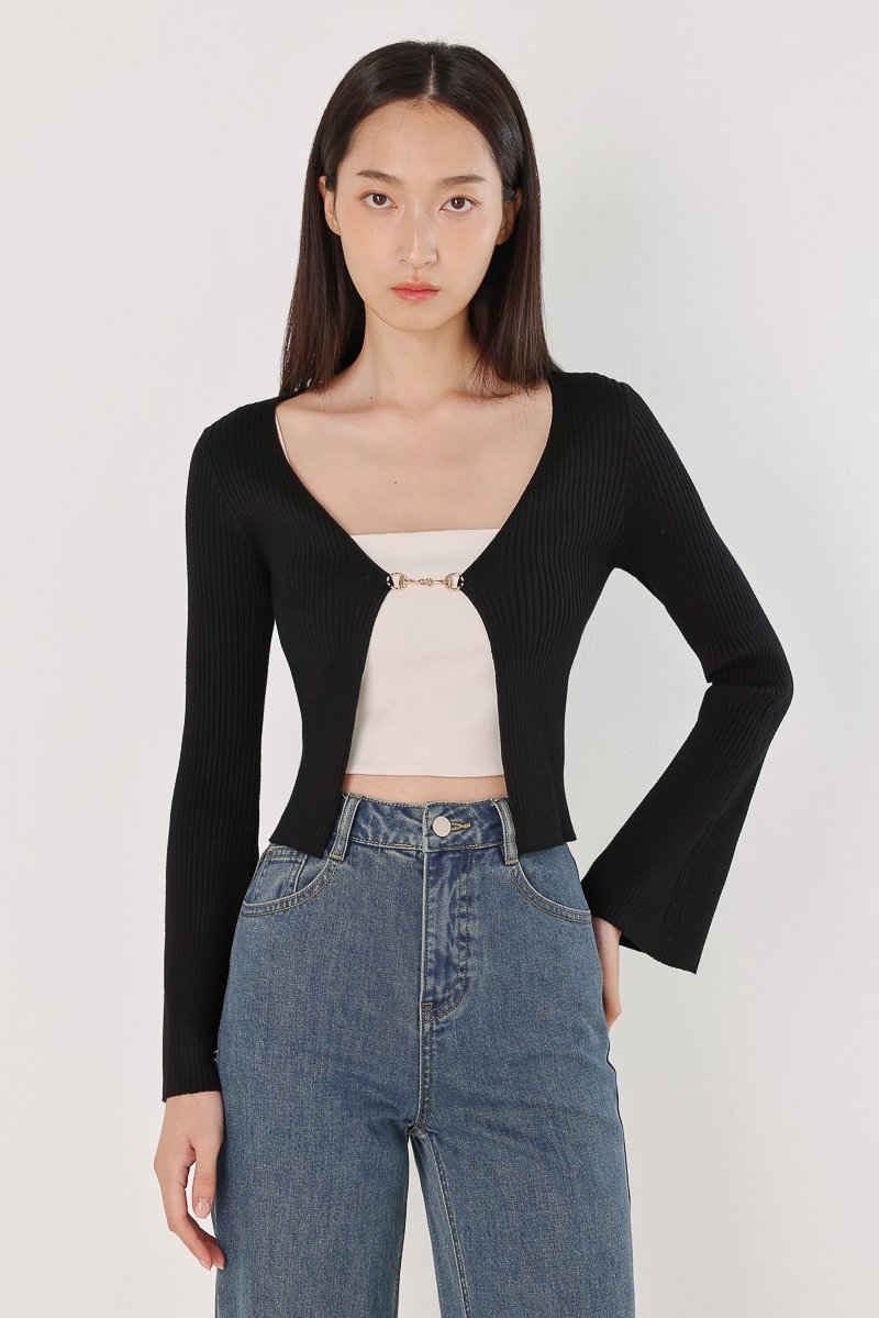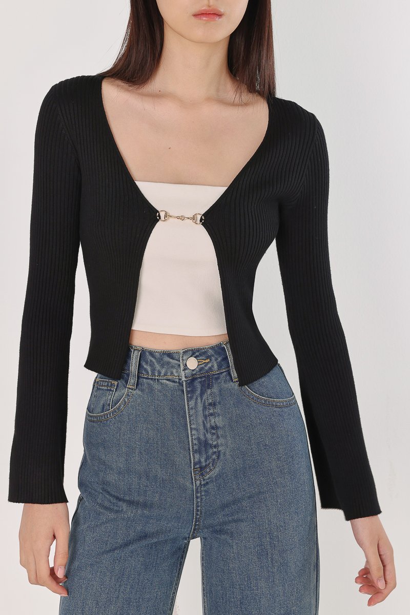 FIO FLARE SLEEVE FRONT BUCKLE KNIT CARDIGAN (BLACK)