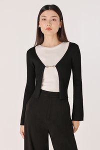 Subtle statement-making at its finest. Fio is a cardigan made from soft, stretchable knit fabric, featuring a V-neckline and a functional front buckle clasp closure. It also showcases flared sleeves and an open-front design. Blend comfort and character in one polished piece.