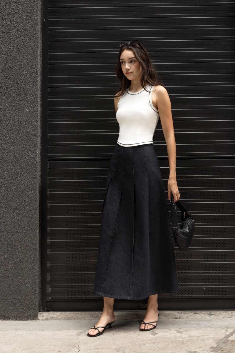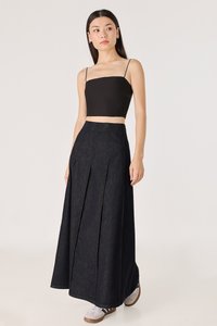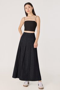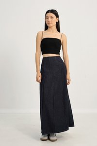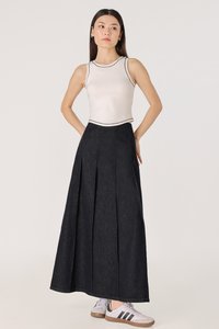 Flare into effortless elegance. Crafted from classic denim with panel detailing, this maxi skirt features a flattering A-line silhouette. It offers a smooth, structured fit without stretch, ensuring both durability and shape retention. Comes with a concealed back zipper for a seamless finish and easy wear.