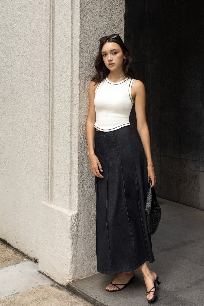 Flare into effortless elegance. Crafted from classic denim with panel detailing, this maxi skirt features a flattering A-line silhouette. It offers a smooth, structured fit without stretch, ensuring both durability and shape retention. Comes with a concealed back zipper for a seamless finish and easy wear.