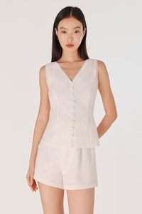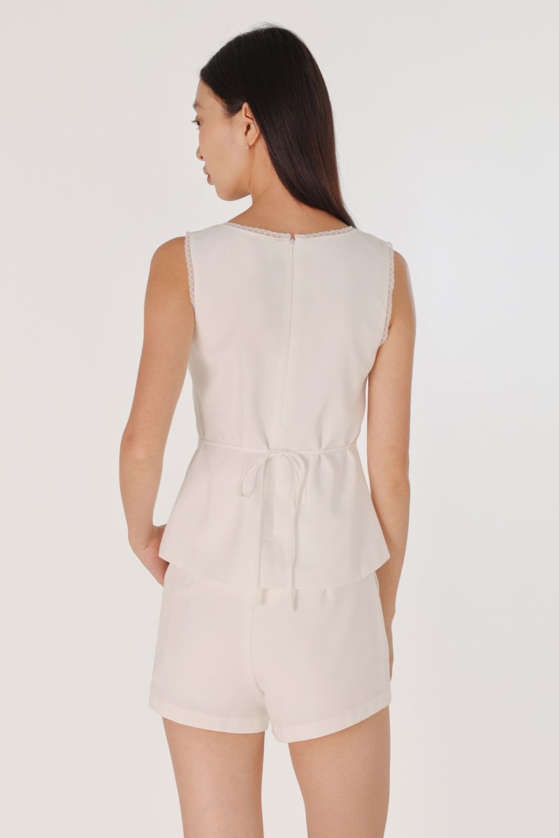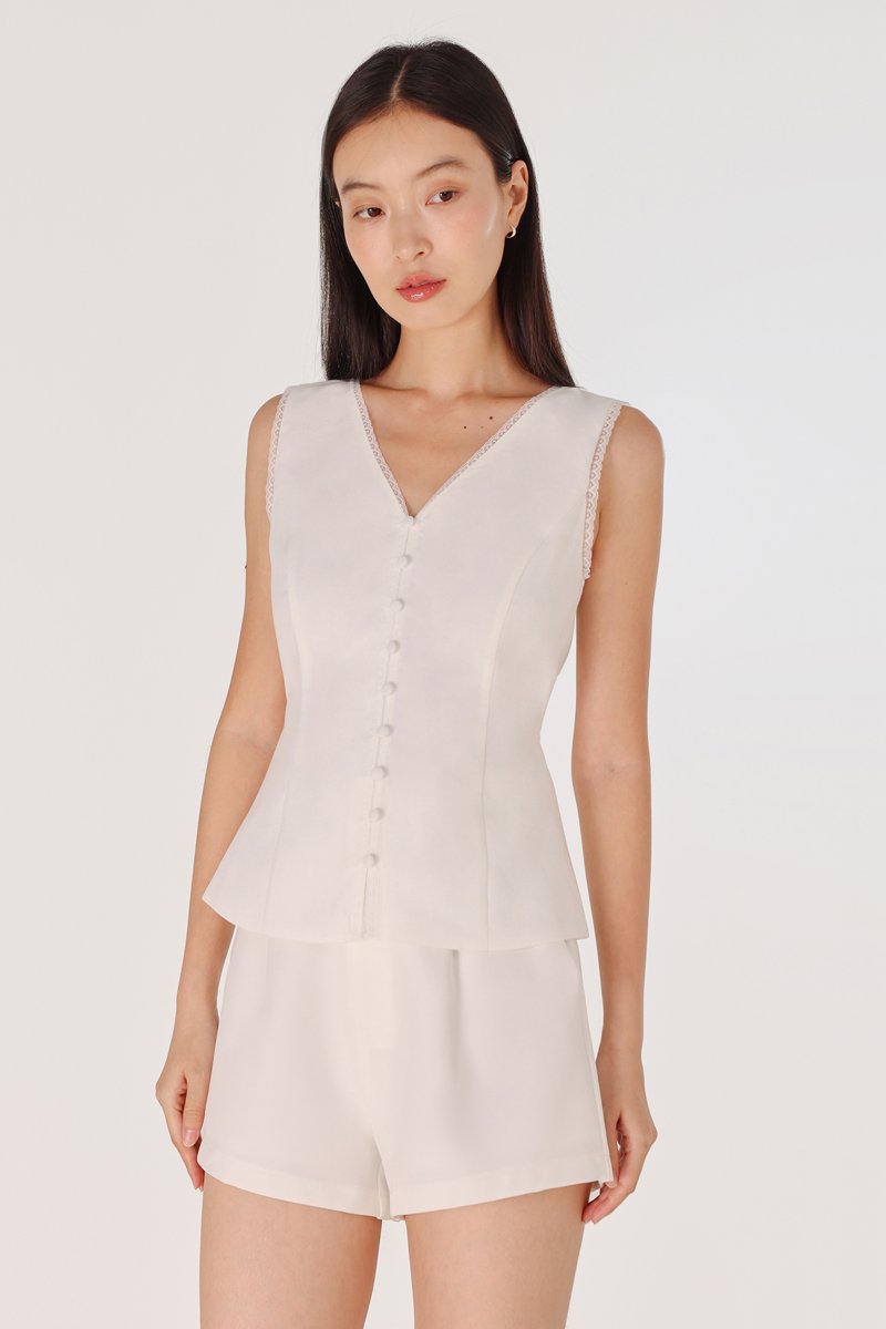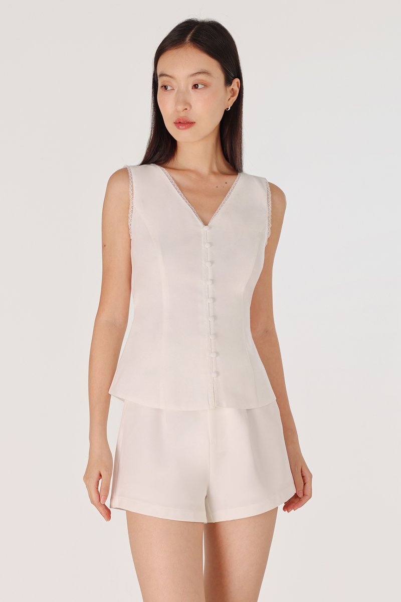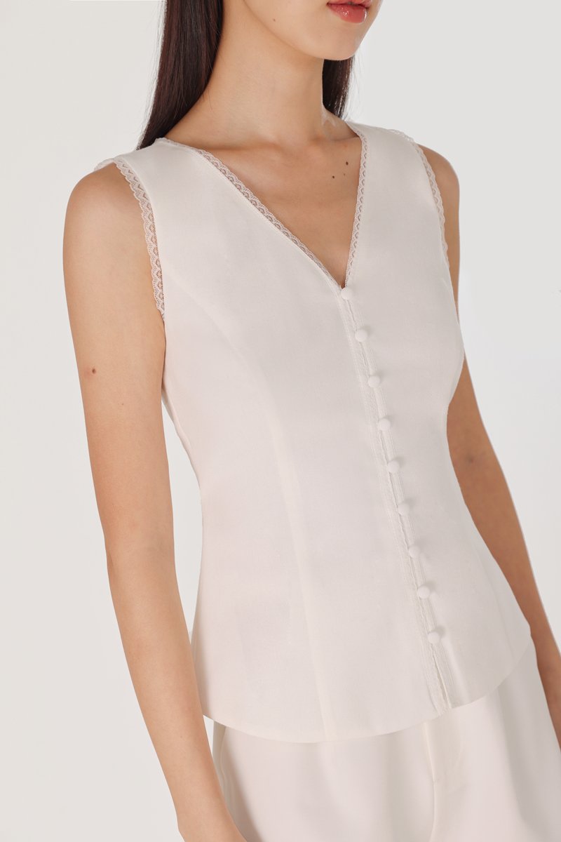 HERENA LINEN LACE TRIM BUTTON TIE-BACK VEST TOP