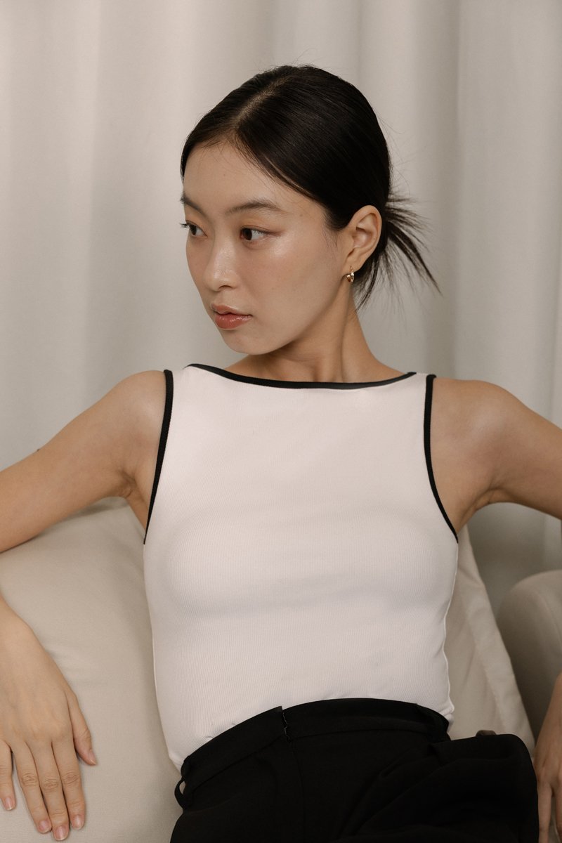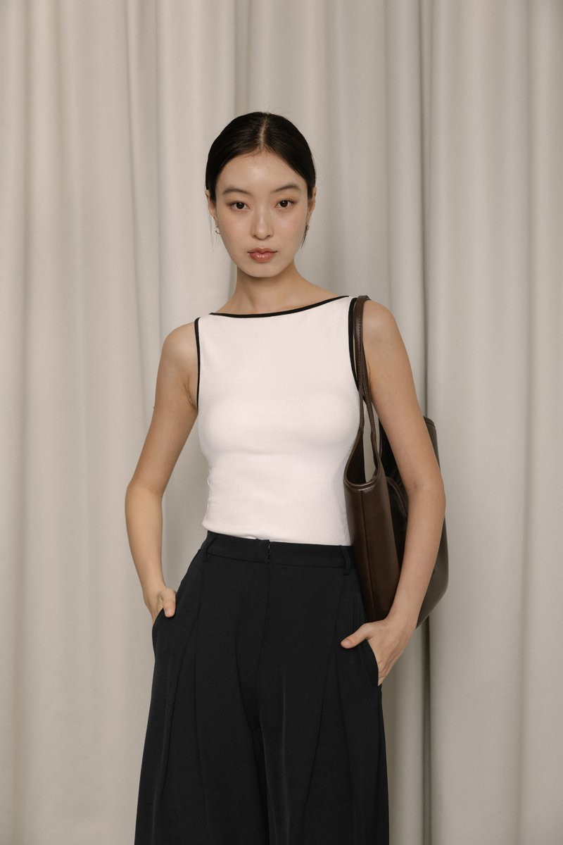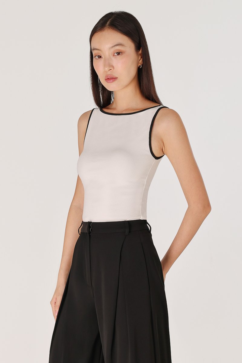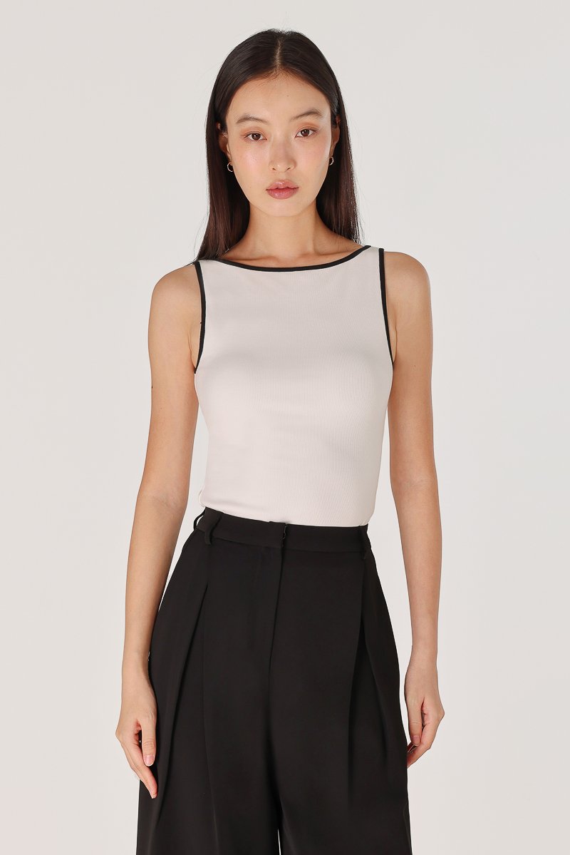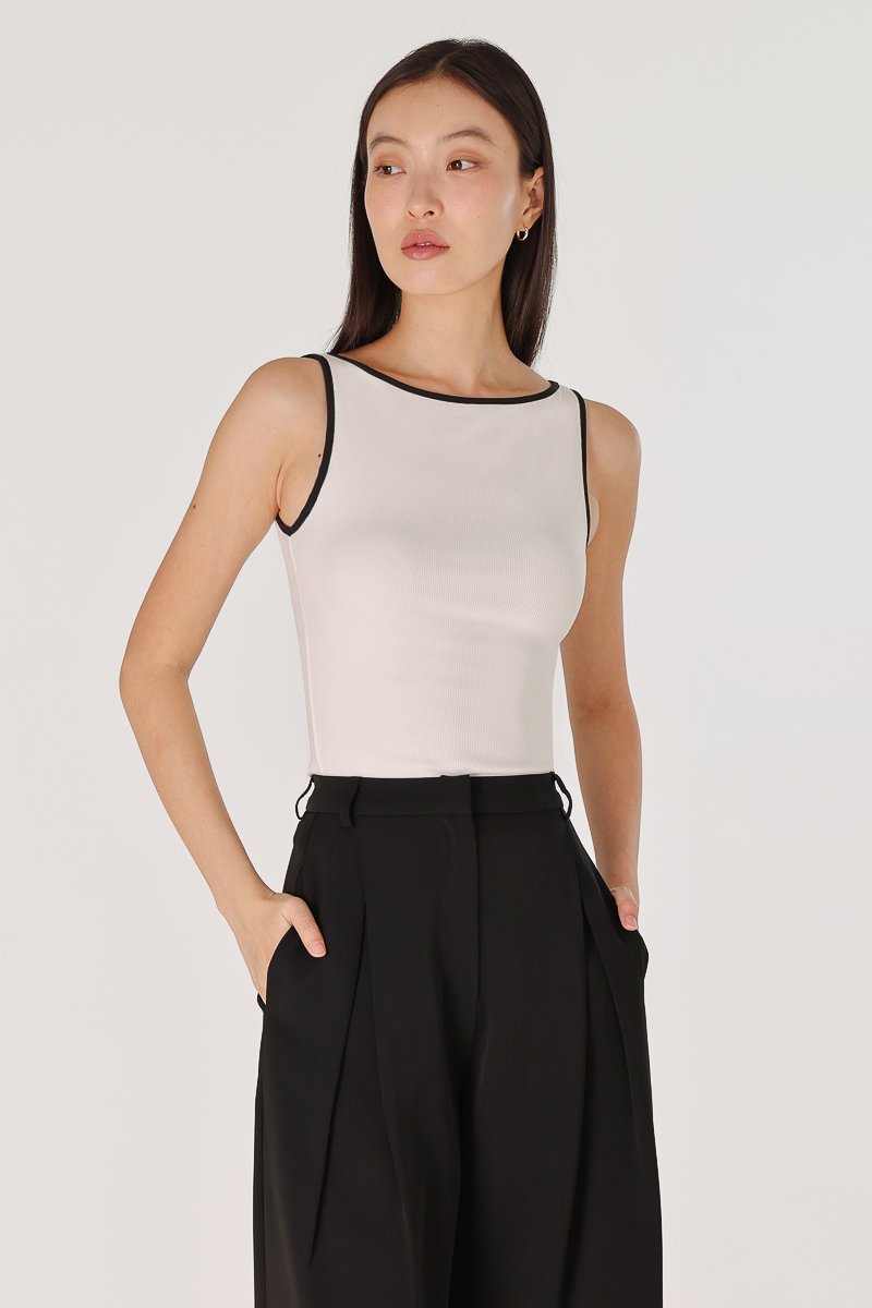 JERNELL PADDED CONTRAST TRIM RIBBED BOATNECK TOP (WHITE)