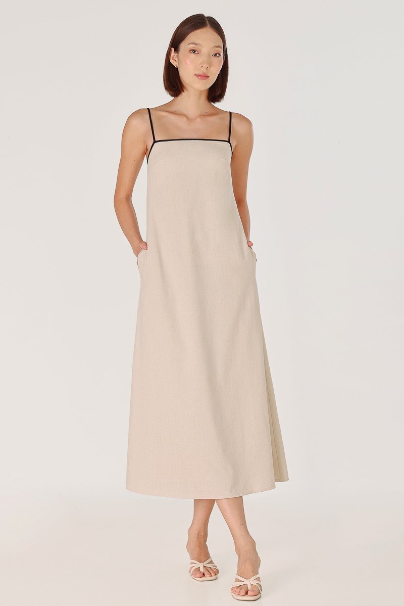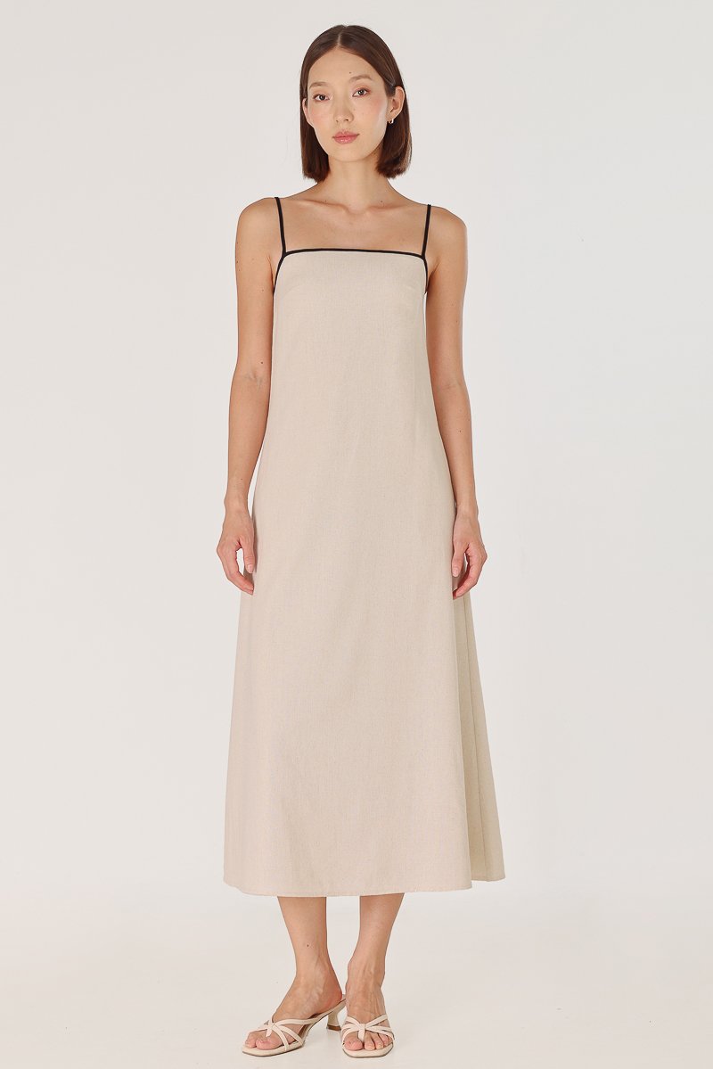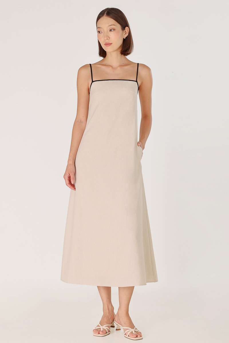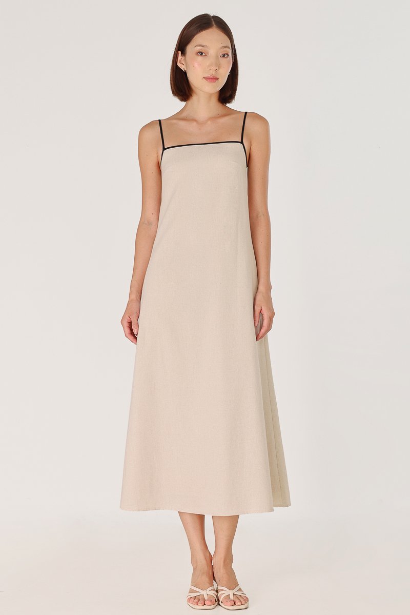 LELA PADDED LINEN CONTRAST TRIM TENT MIDAXI DRESS (NATURAL)
