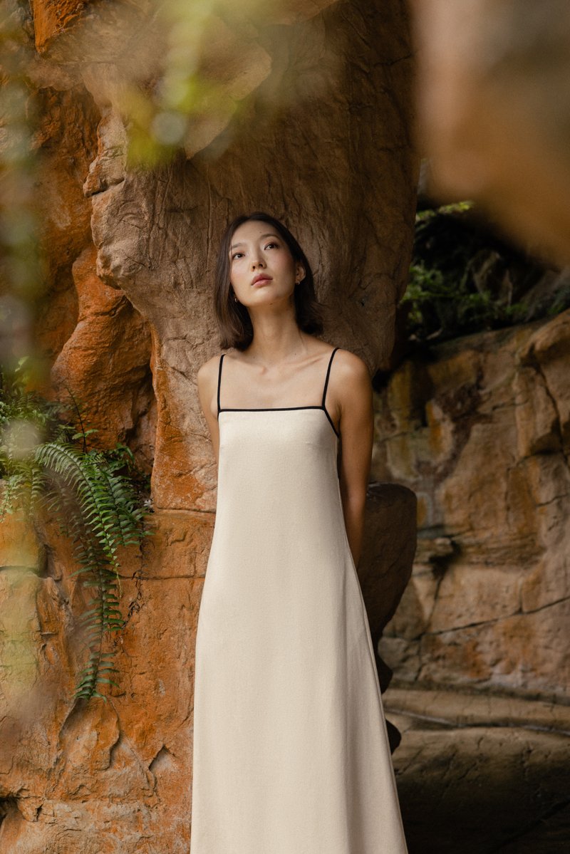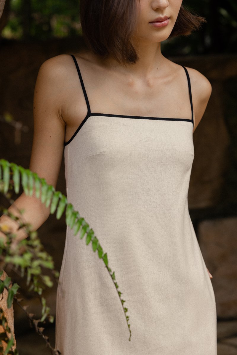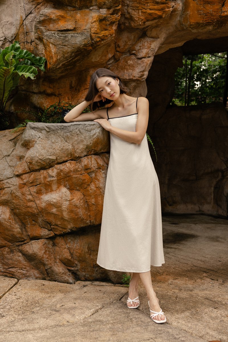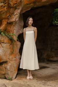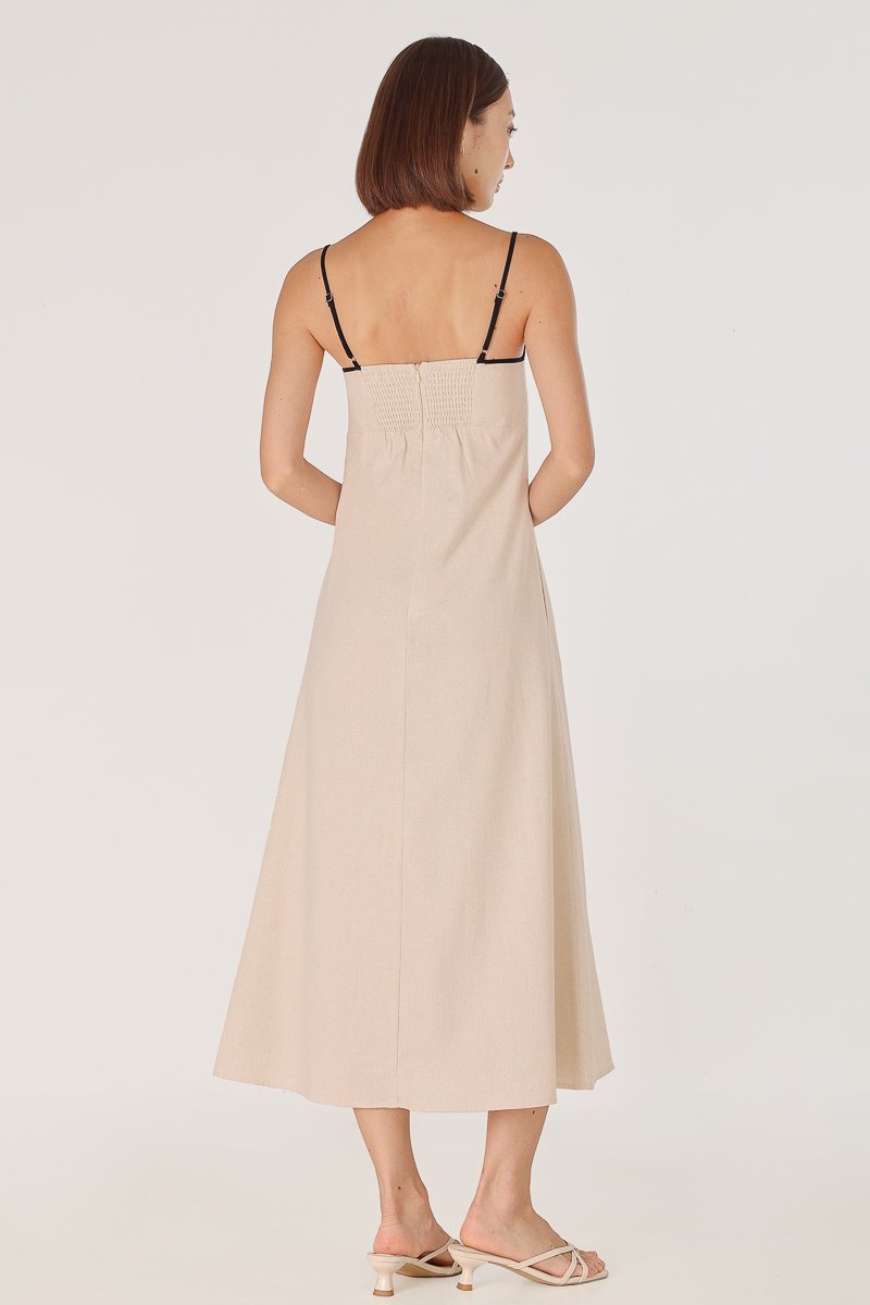 LELA PADDED LINEN CONTRAST TRIM TENT MIDAXI DRESS (NATURAL)