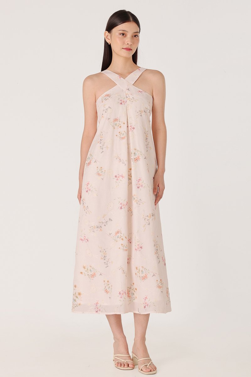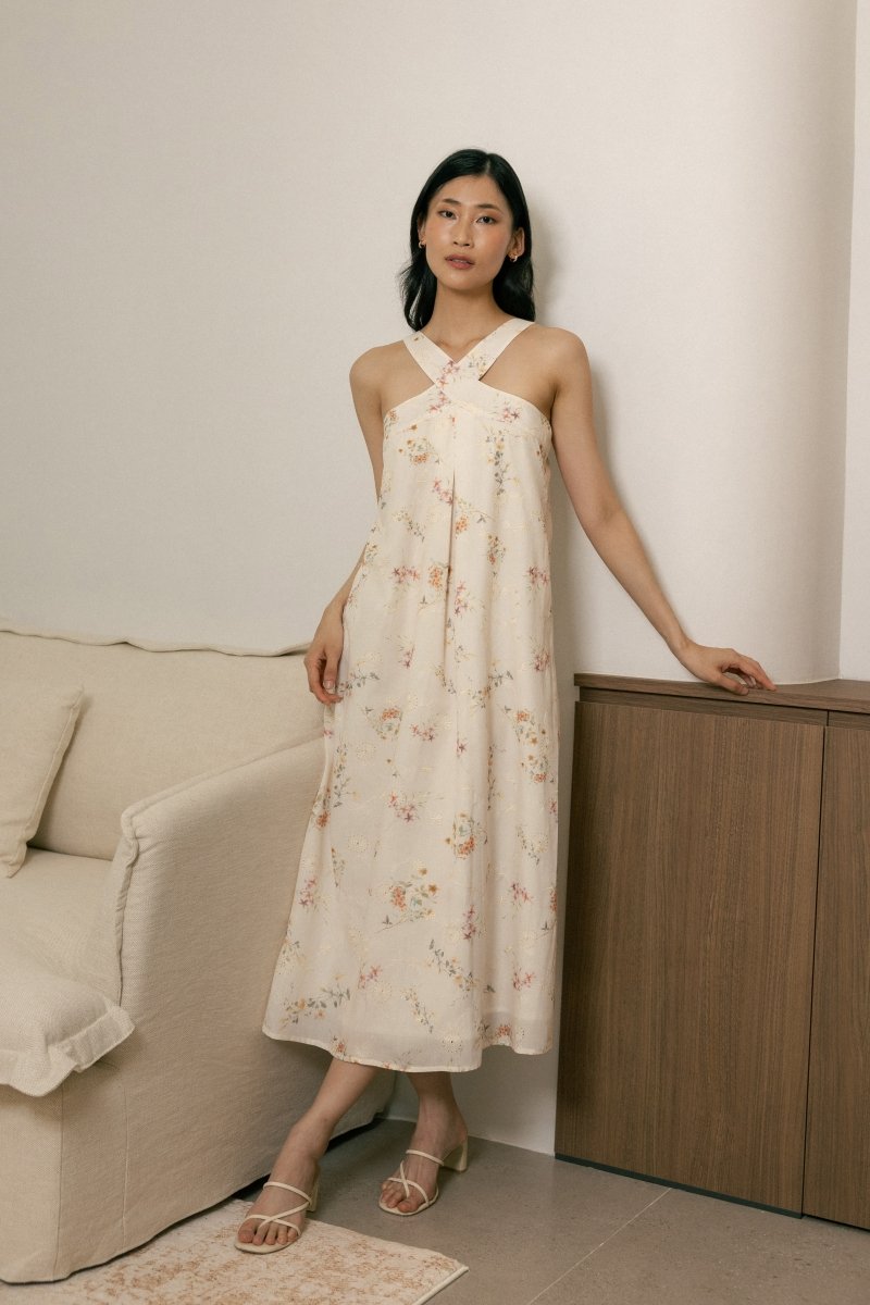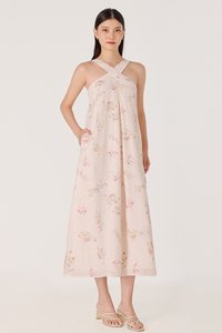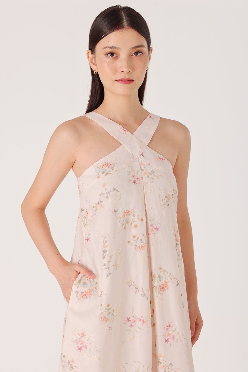 LEVINA PADDED FLORAL EMBROIDERED HALTER TENT MIDAXI DRESS
