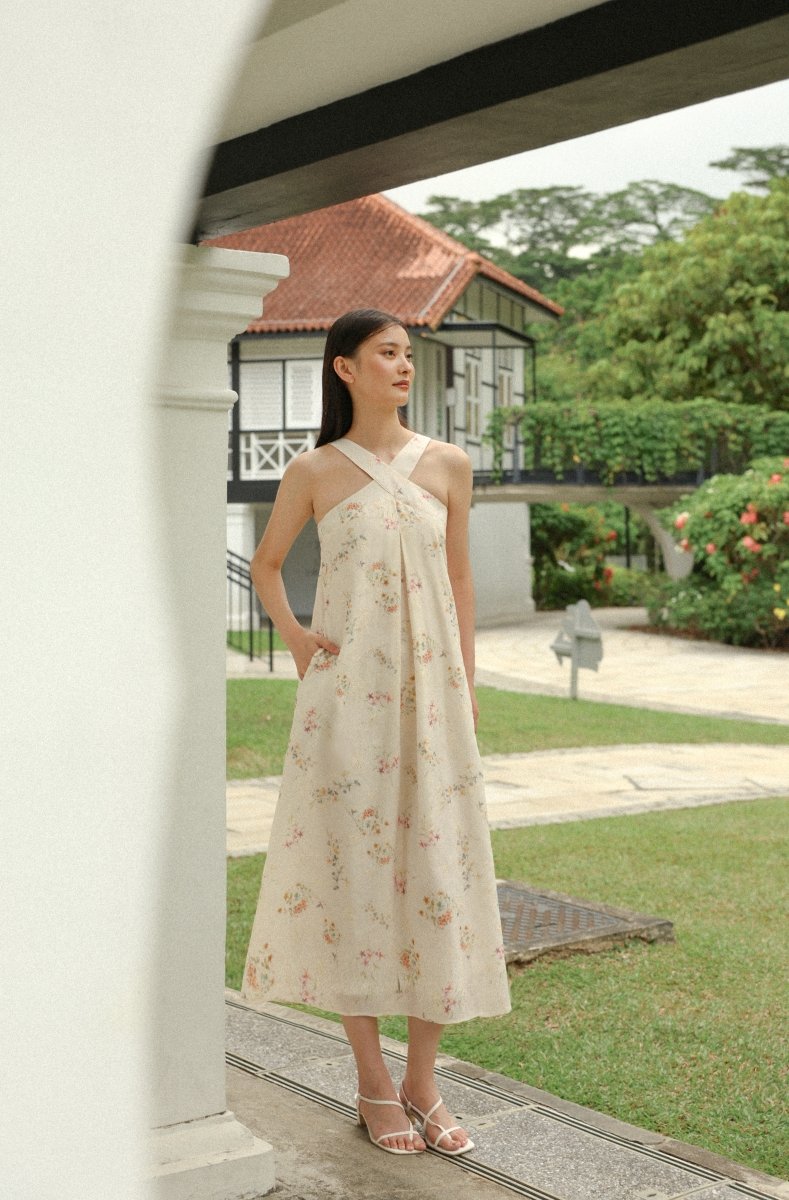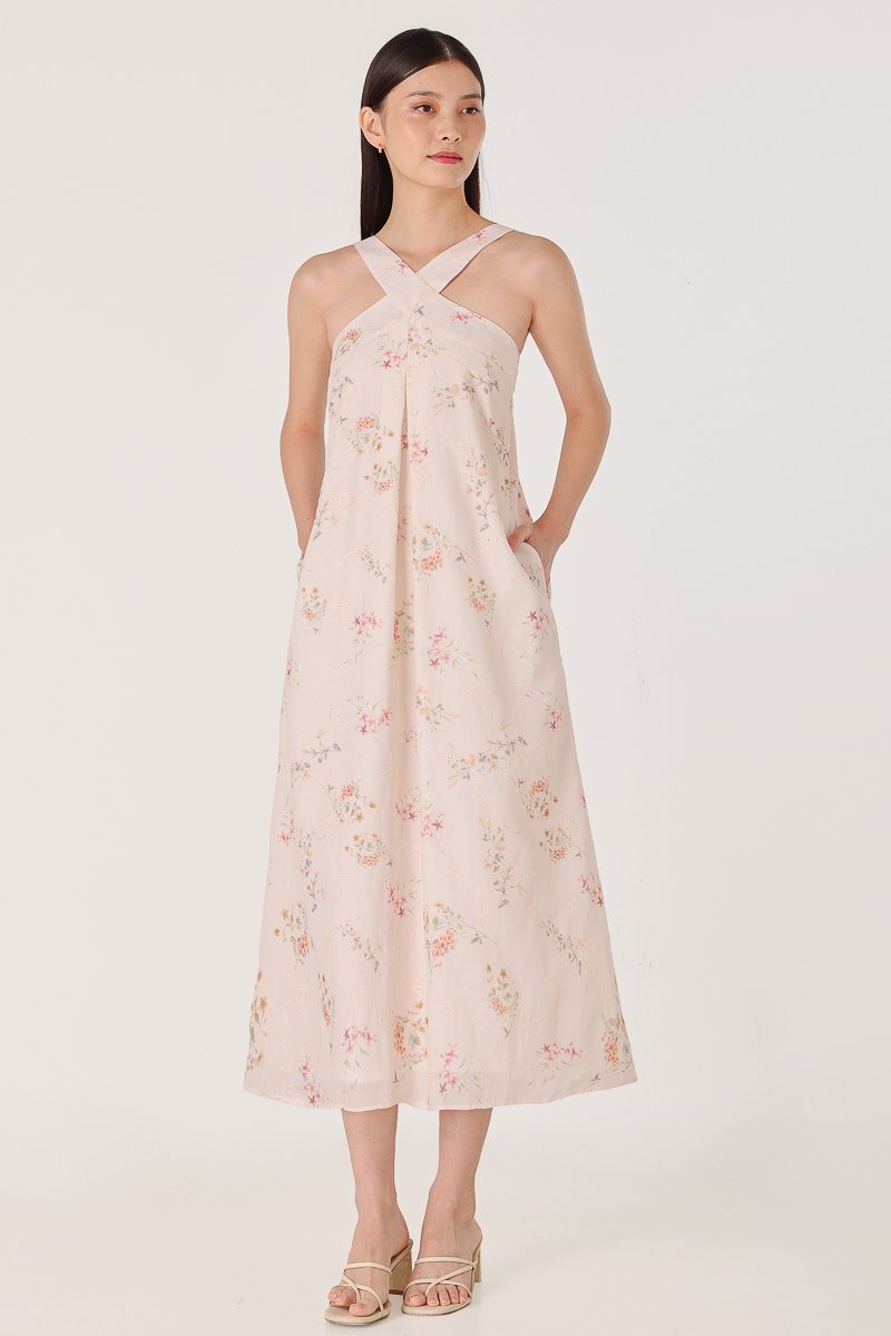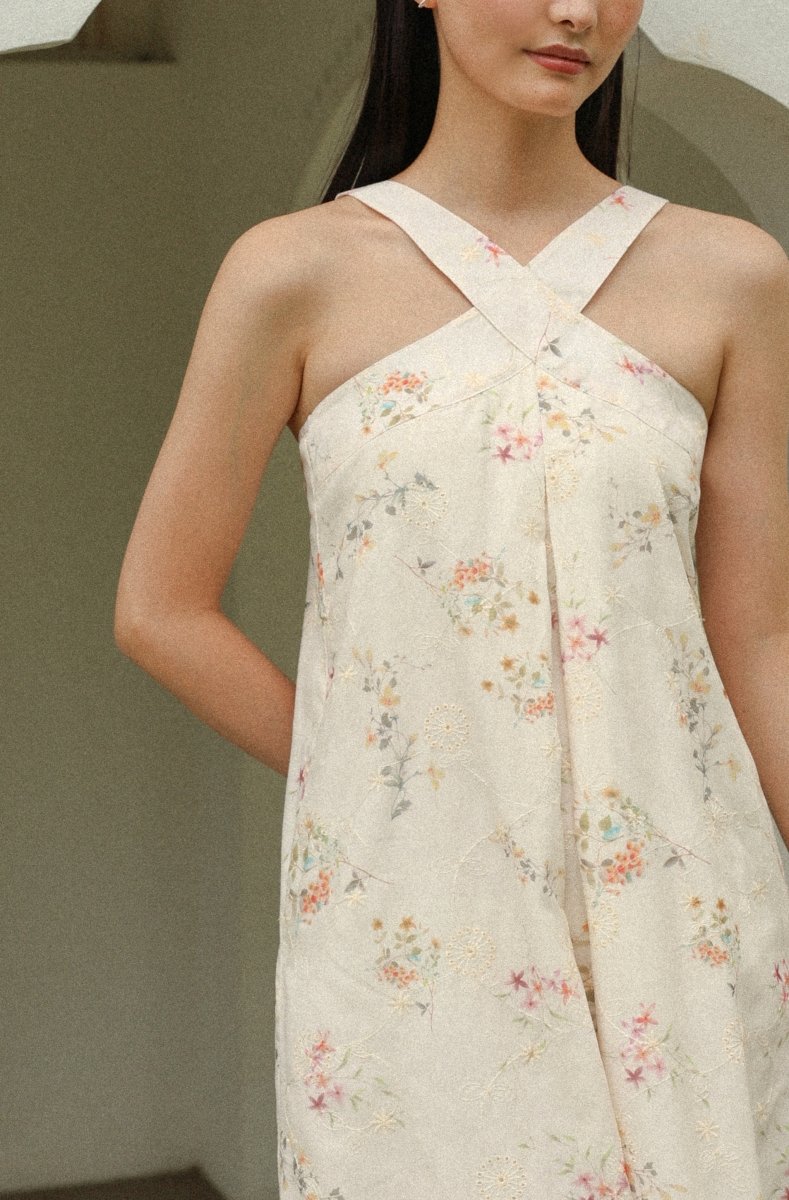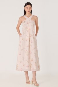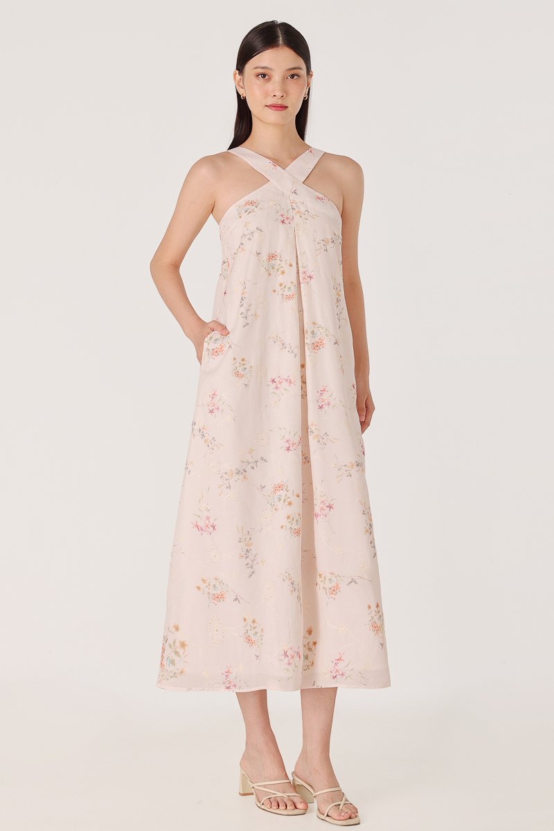 LEVINA PADDED FLORAL EMBROIDERED HALTER TENT MIDAXI DRESS