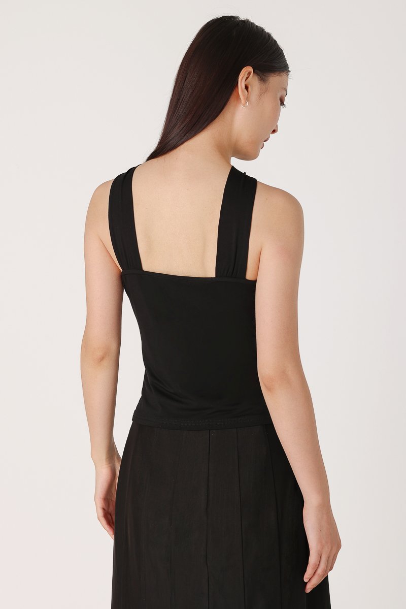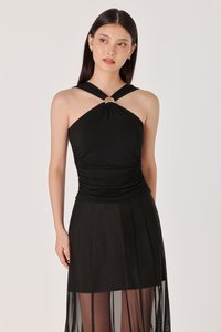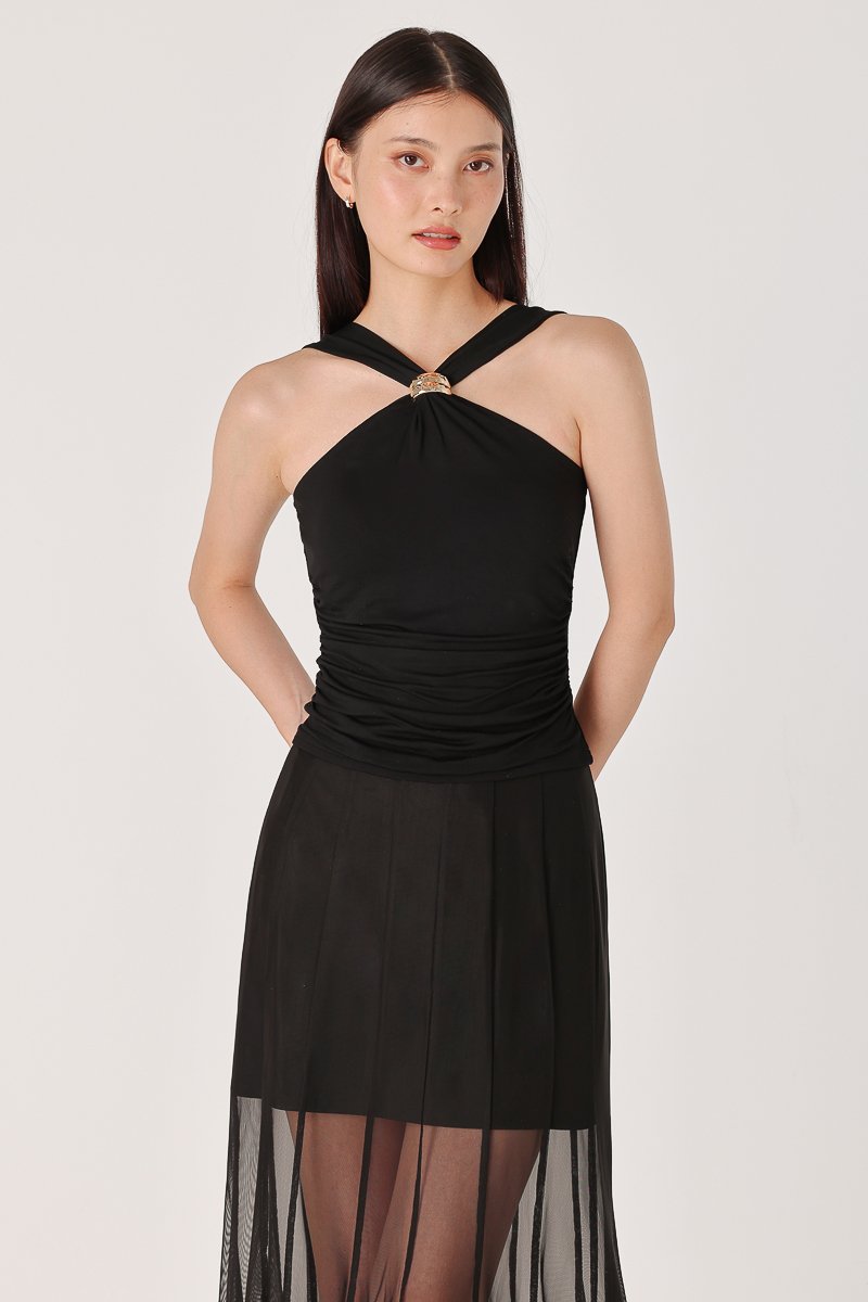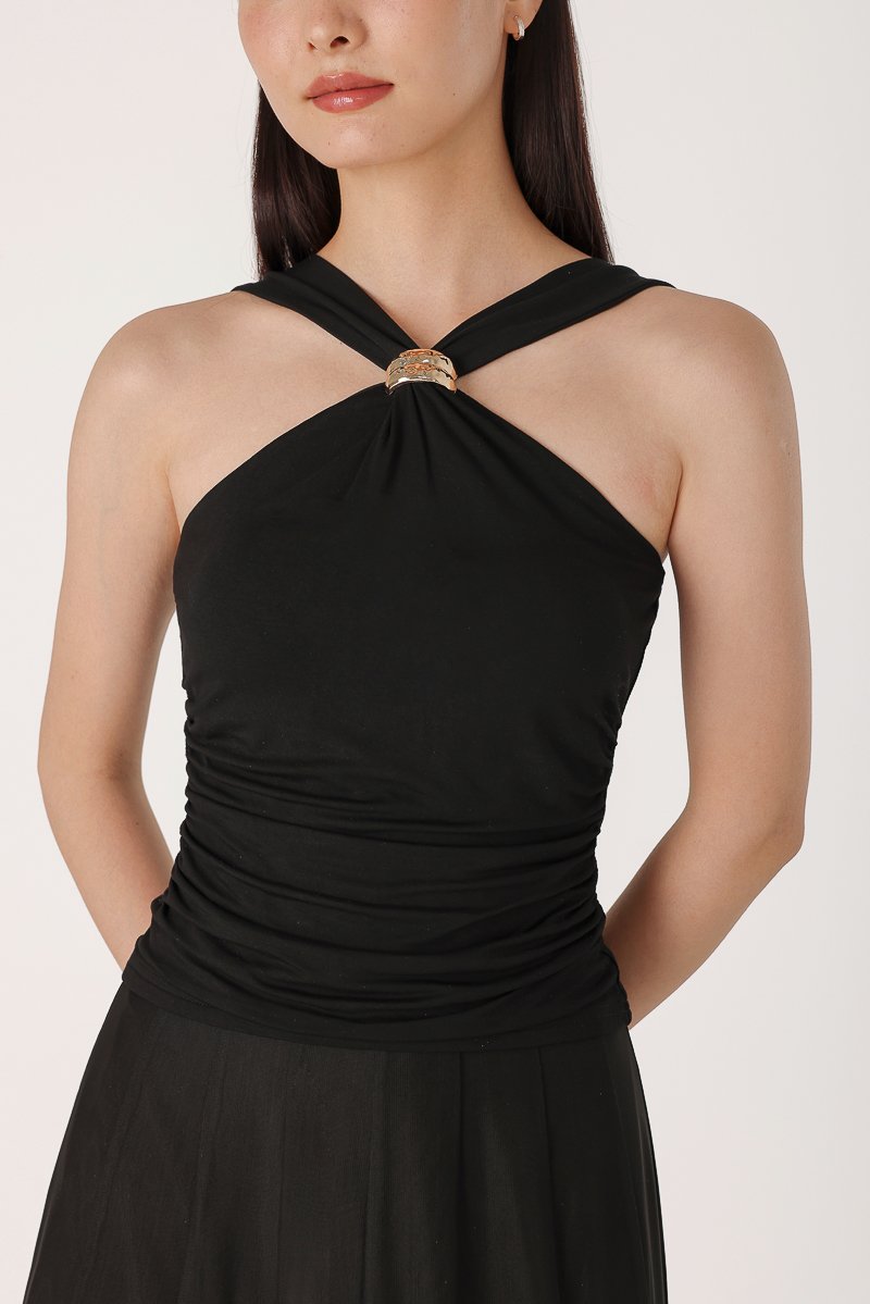LIORA PADDED METAL ORNAMENT HALTER TOP (BLACK)