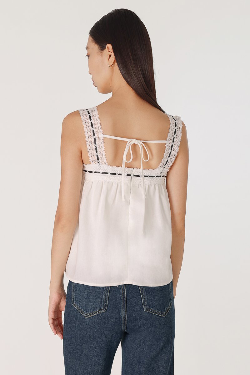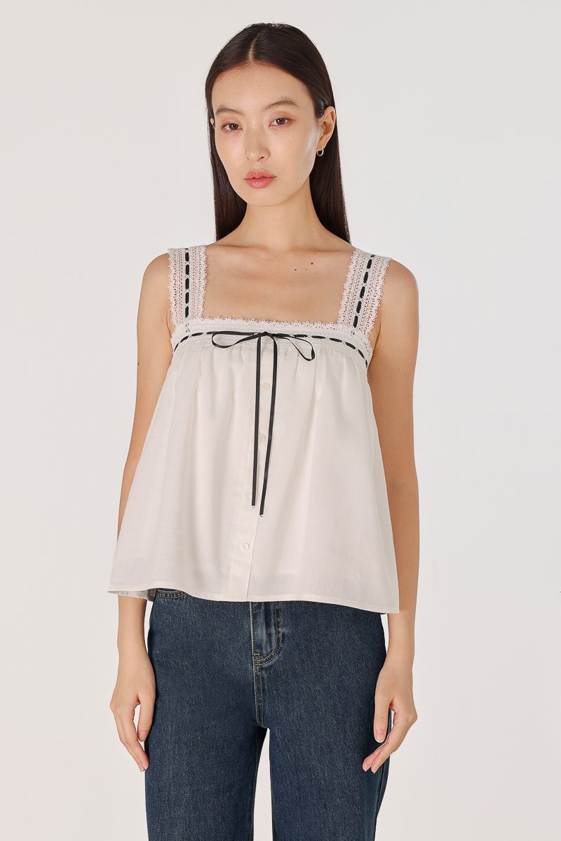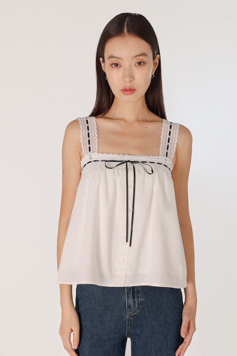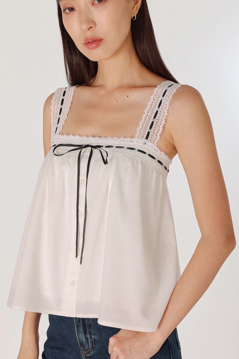LOVELLA PADDED LINEN LACE TRIM TIE RIBBON BABYDOLL TOP (WHITE)