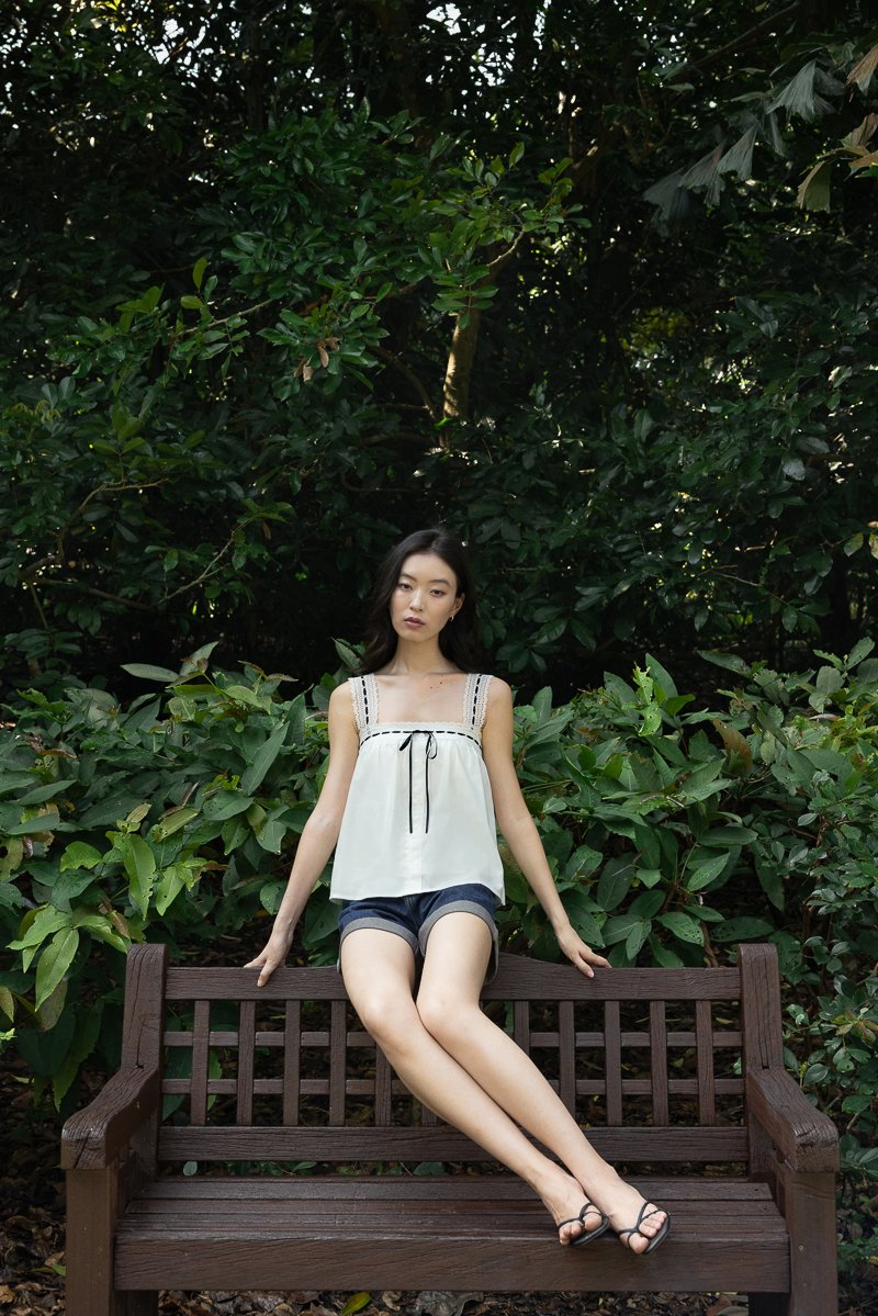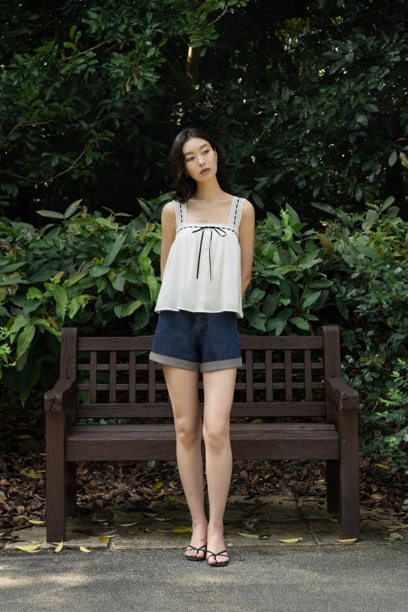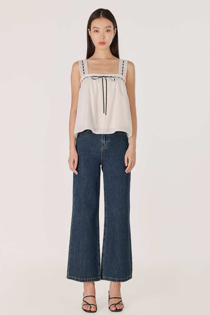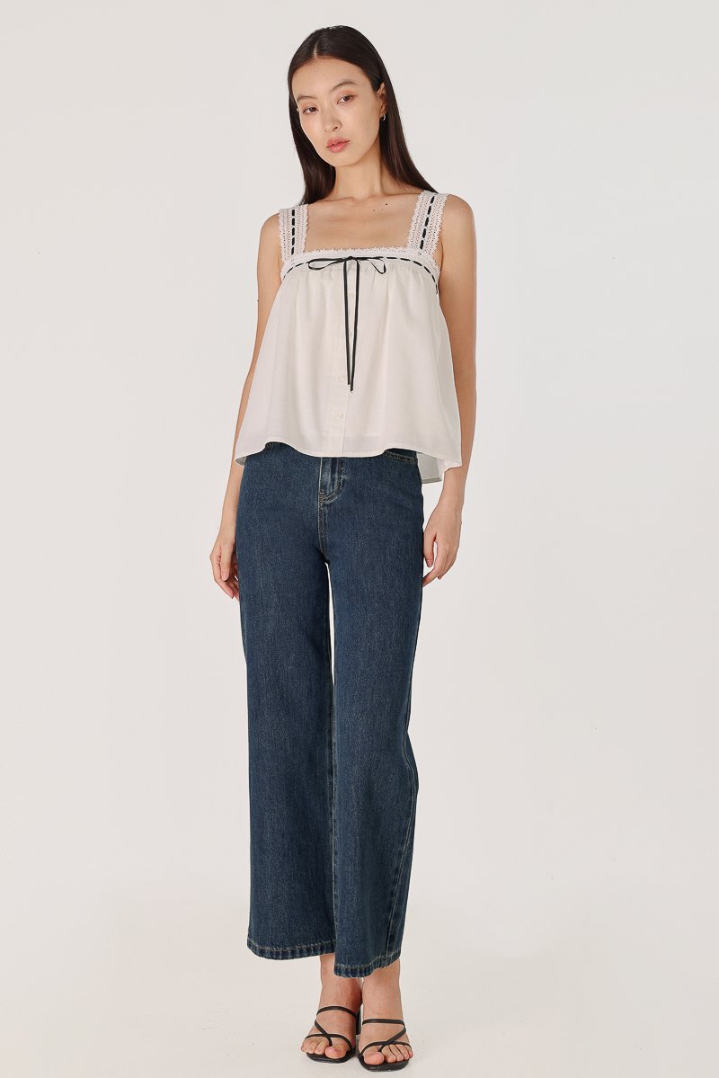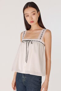 LOVELLA PADDED LINEN LACE TRIM TIE RIBBON BABYDOLL TOP (WHITE)