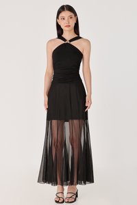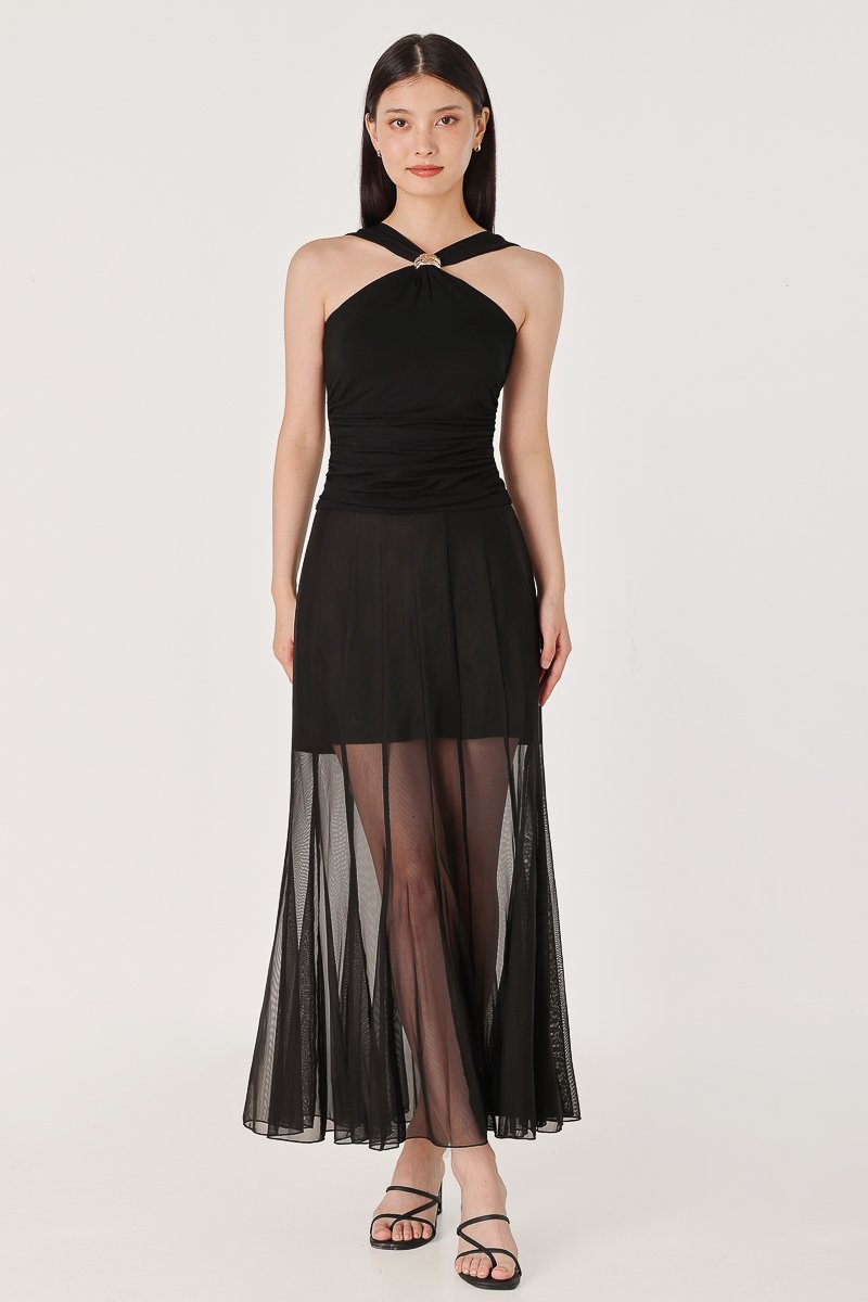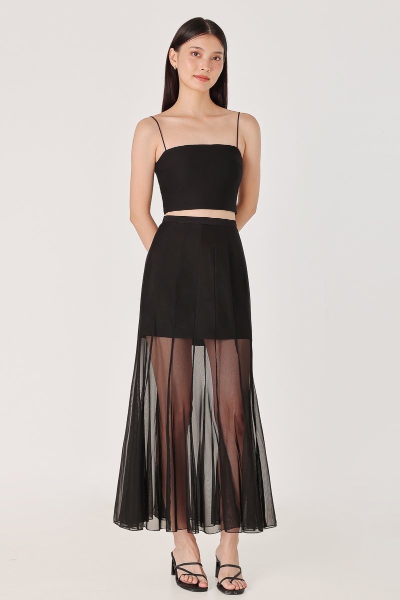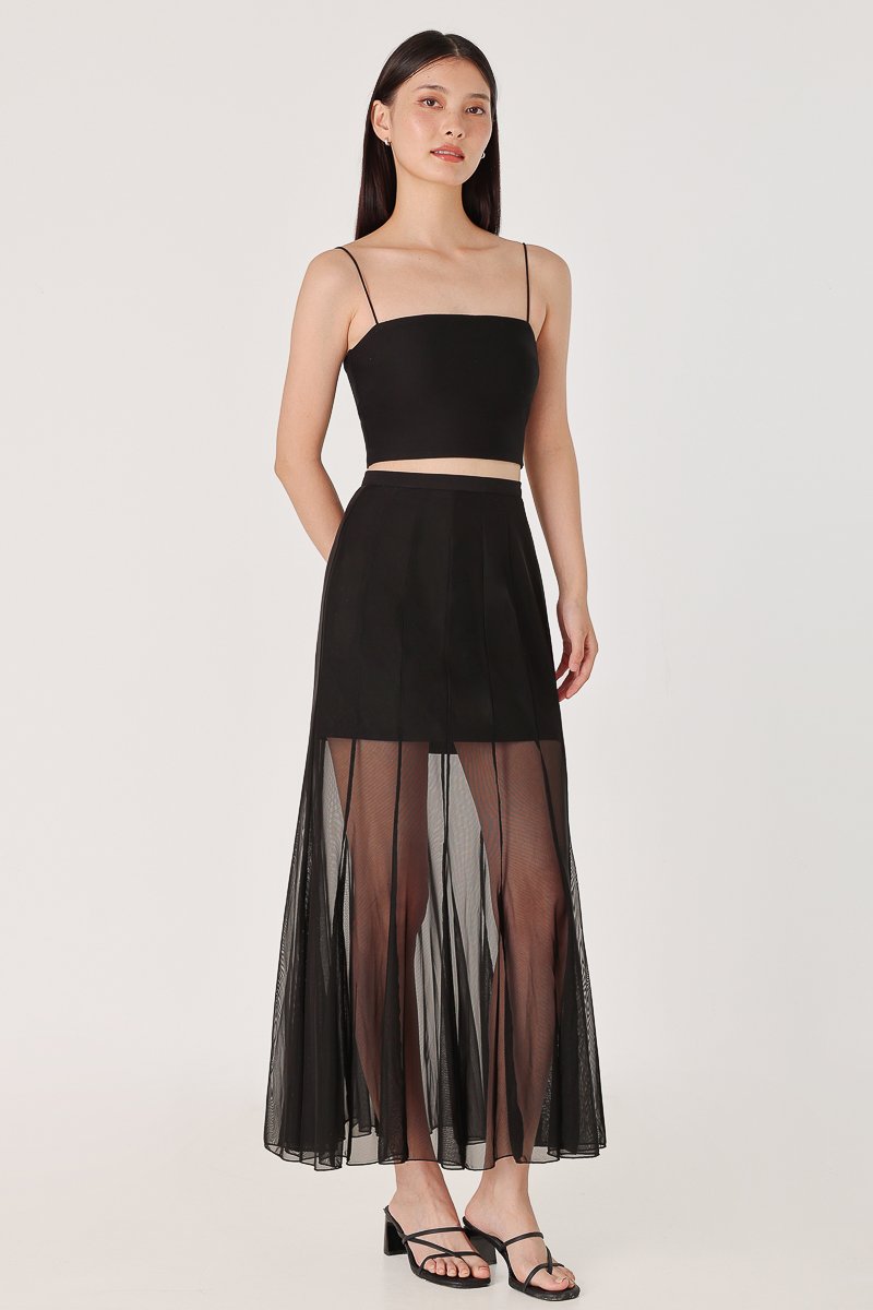 LUCILLE MESH PANELLED FLARE MAXI SKIRT - PETITE (BLACK)
