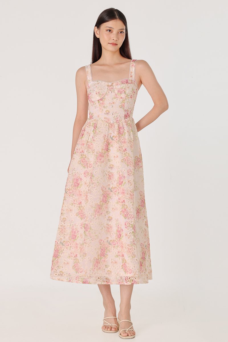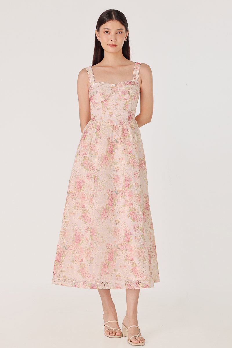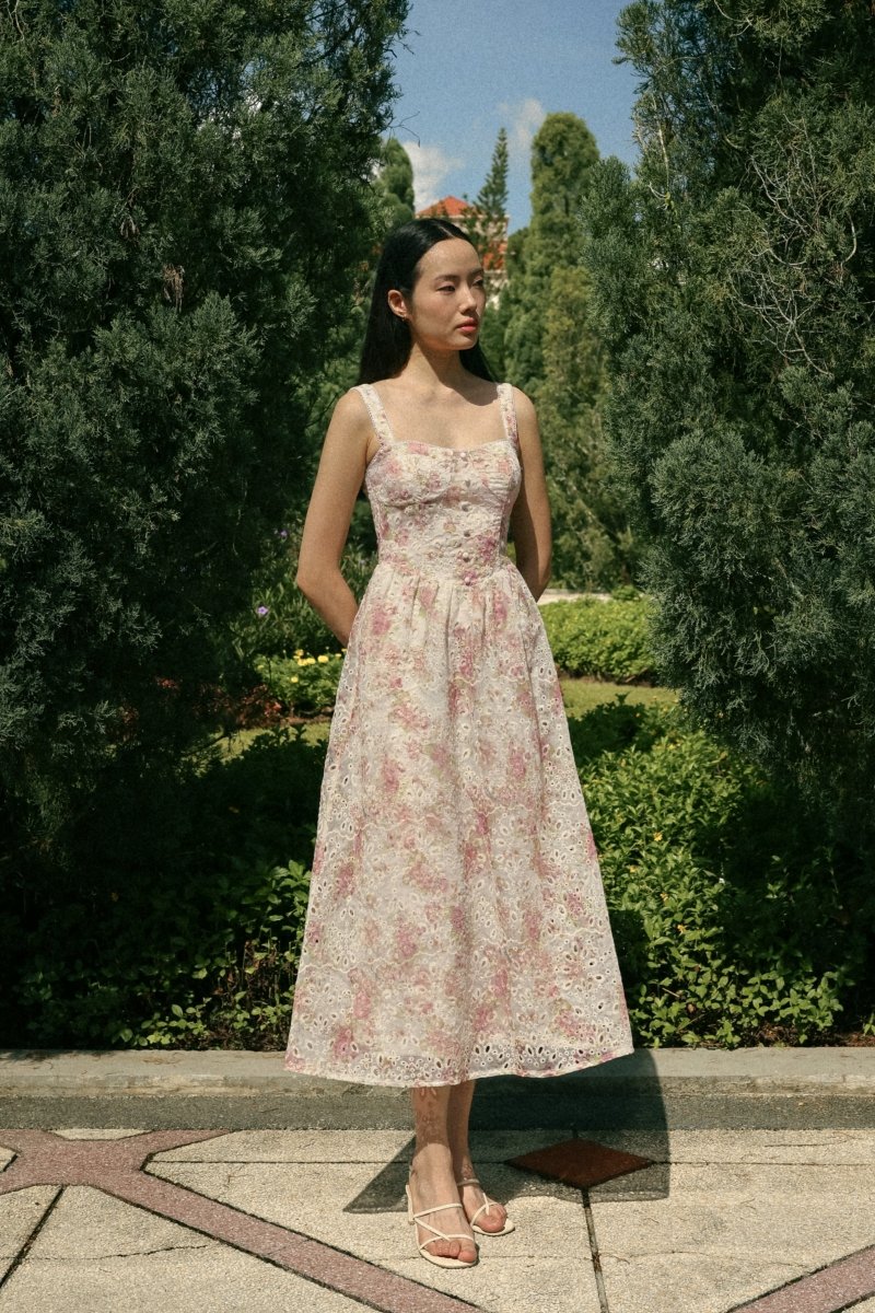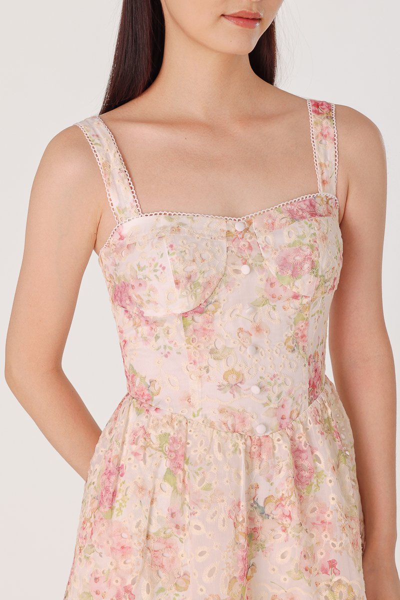 MEADOW PADDED FLORAL BRODERIE EYELET TRIM BUSTIER MIDAXI DRESS