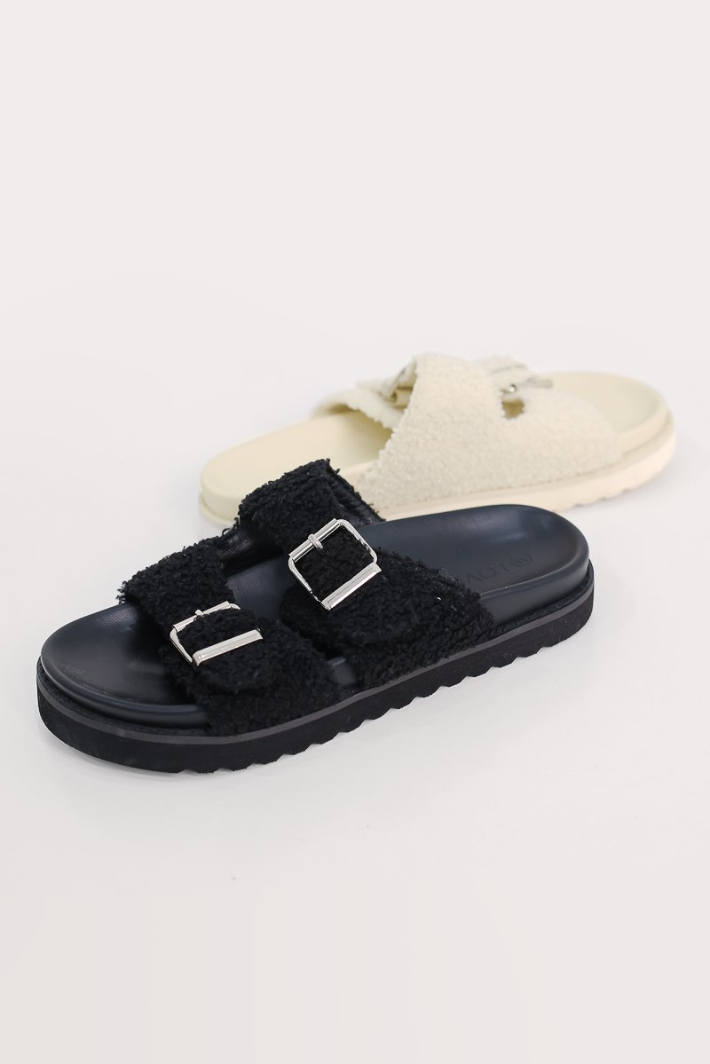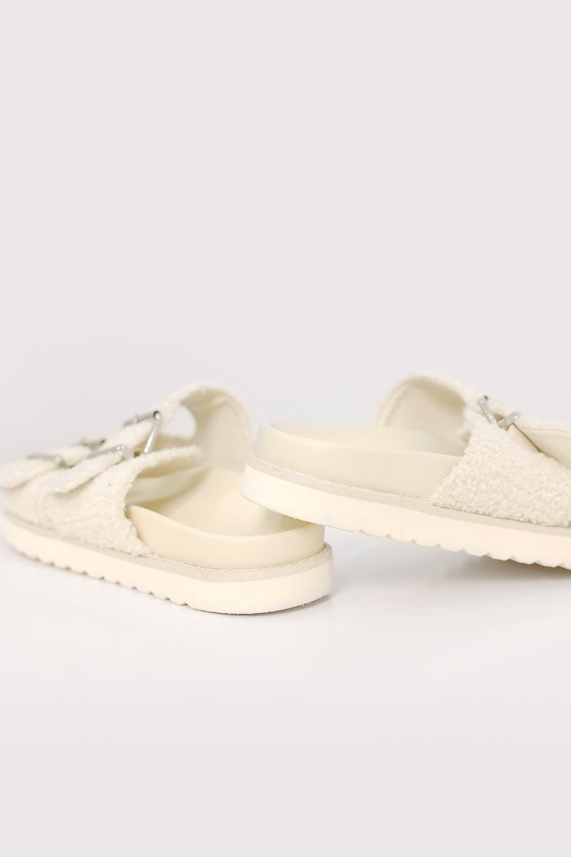 Cozy steps, stylish strides. Featuring soft faux shearling straps paired with PU soles for both comfort and durability, Milly offers double adjustable buckle straps for a secured fit. Designed for ultimate comfort with easy adjustability.