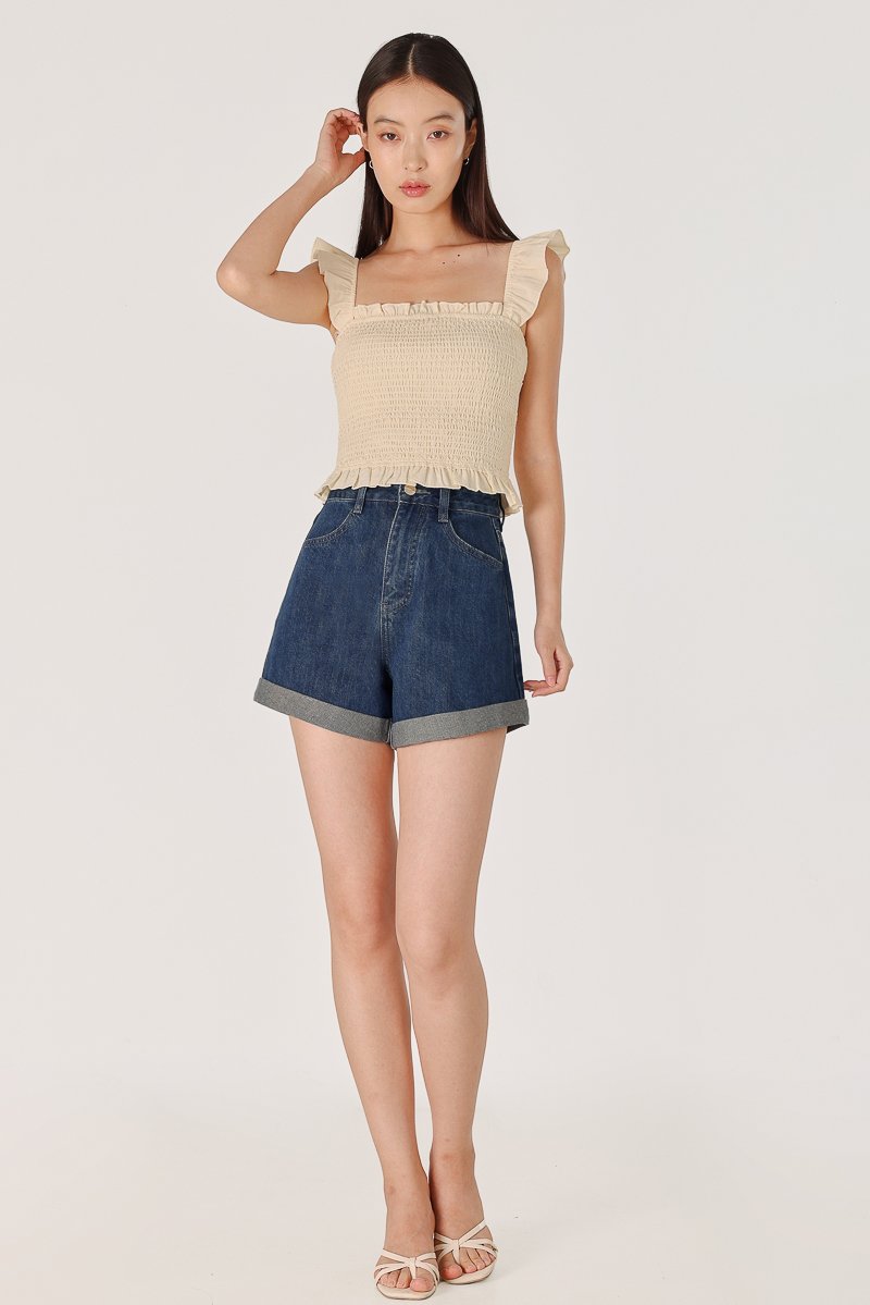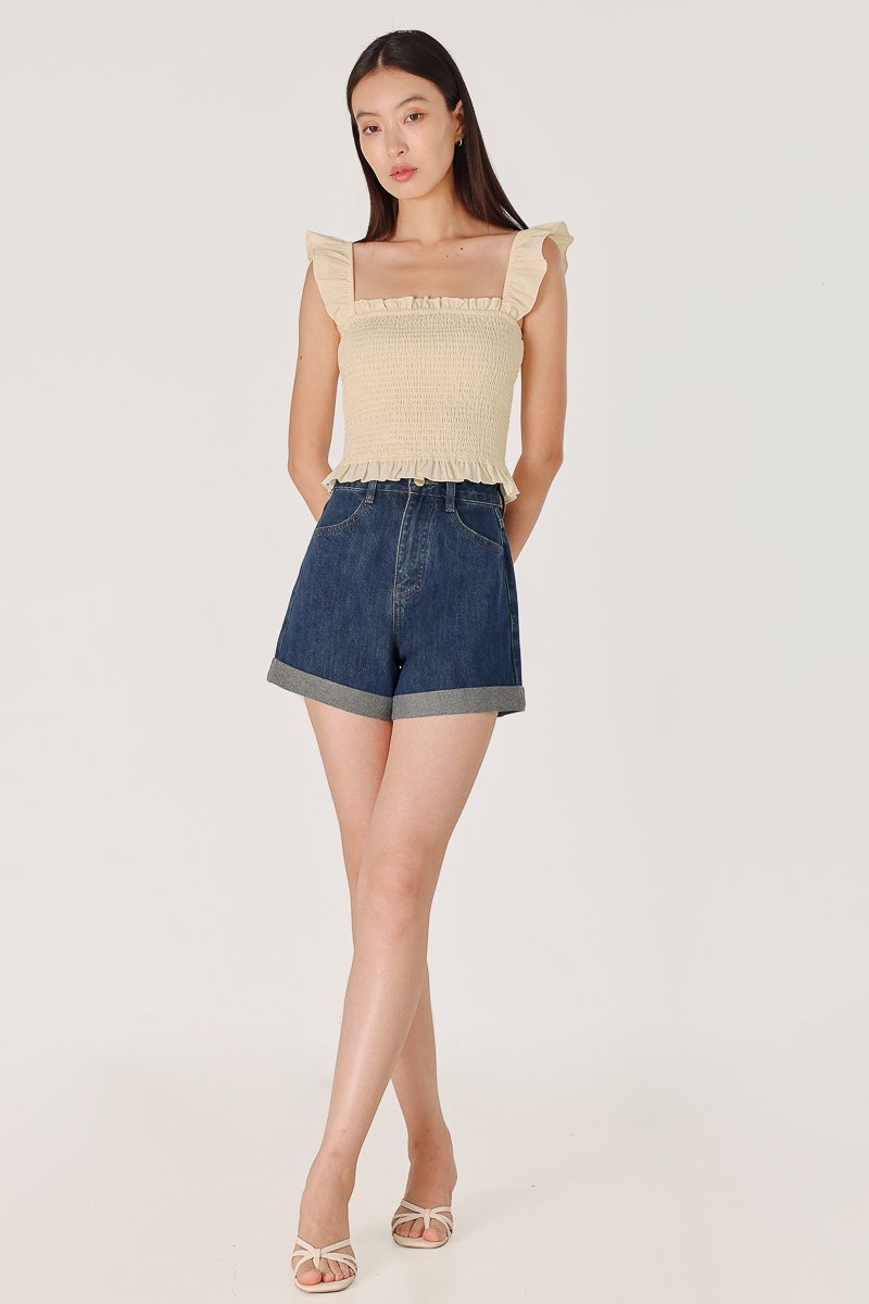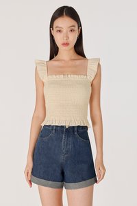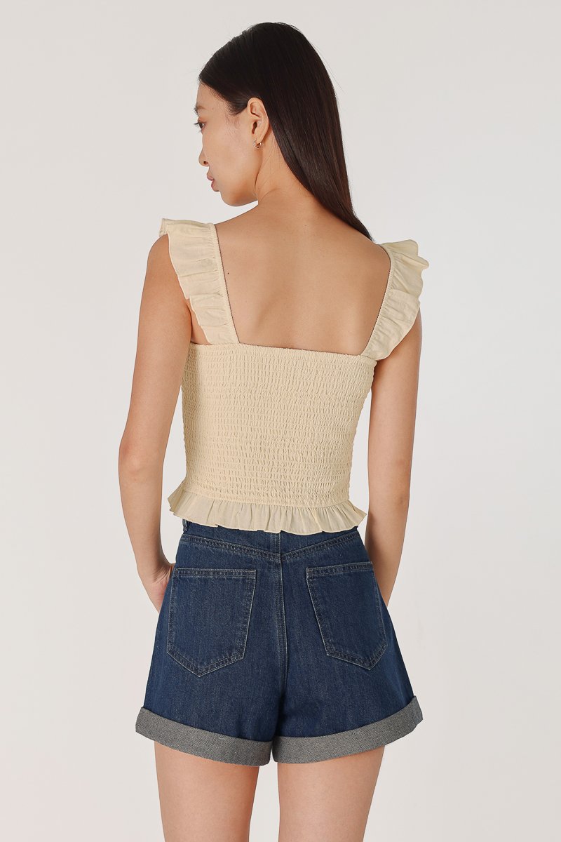 MINDY PADDED LINEN EMBROIDERED RUFFLES SMOCKED TOP (YELLOW)