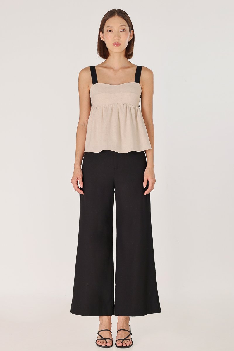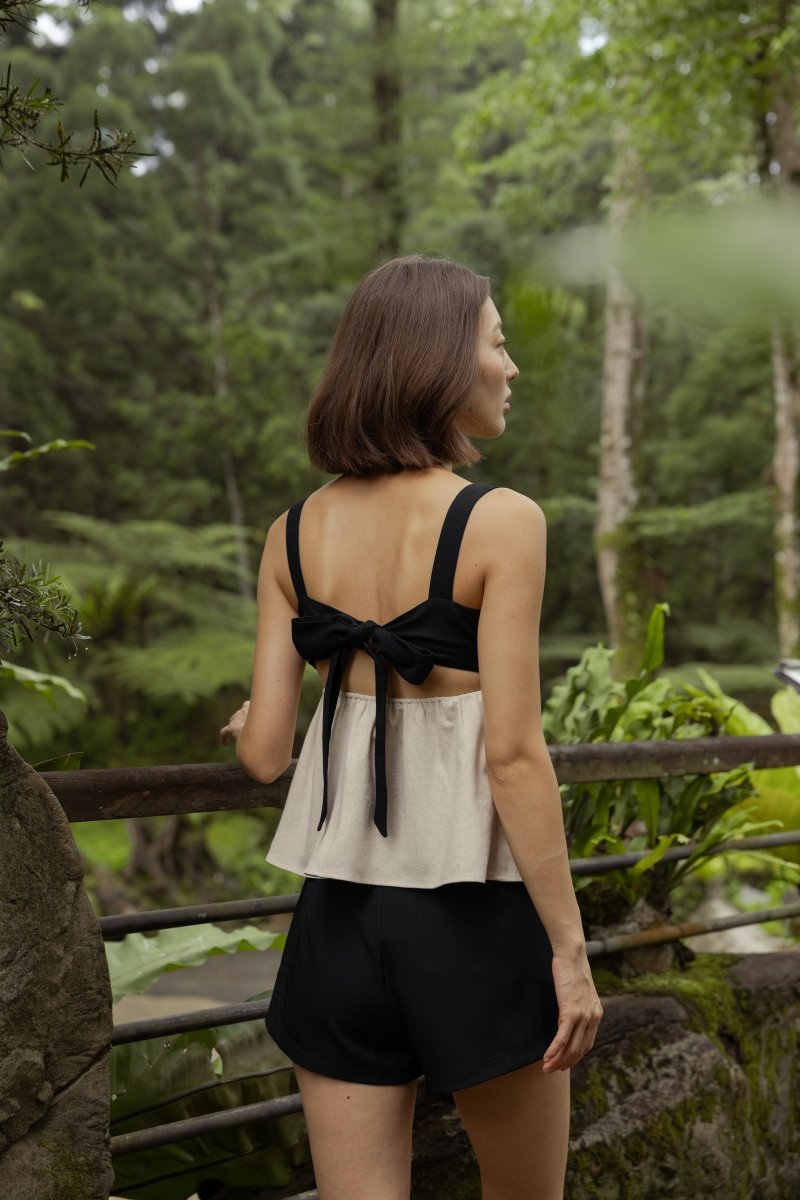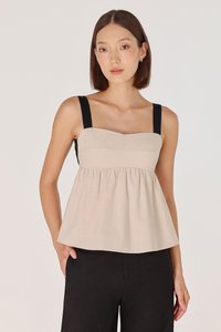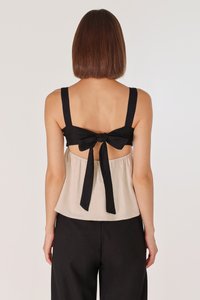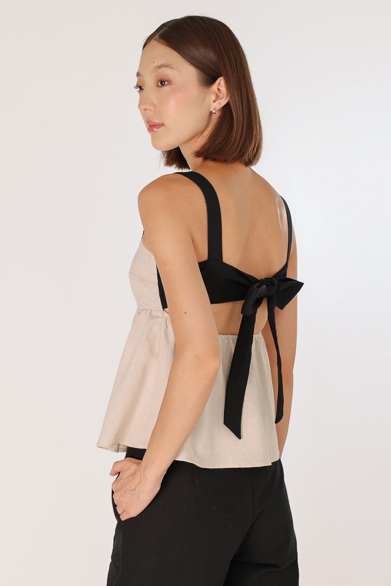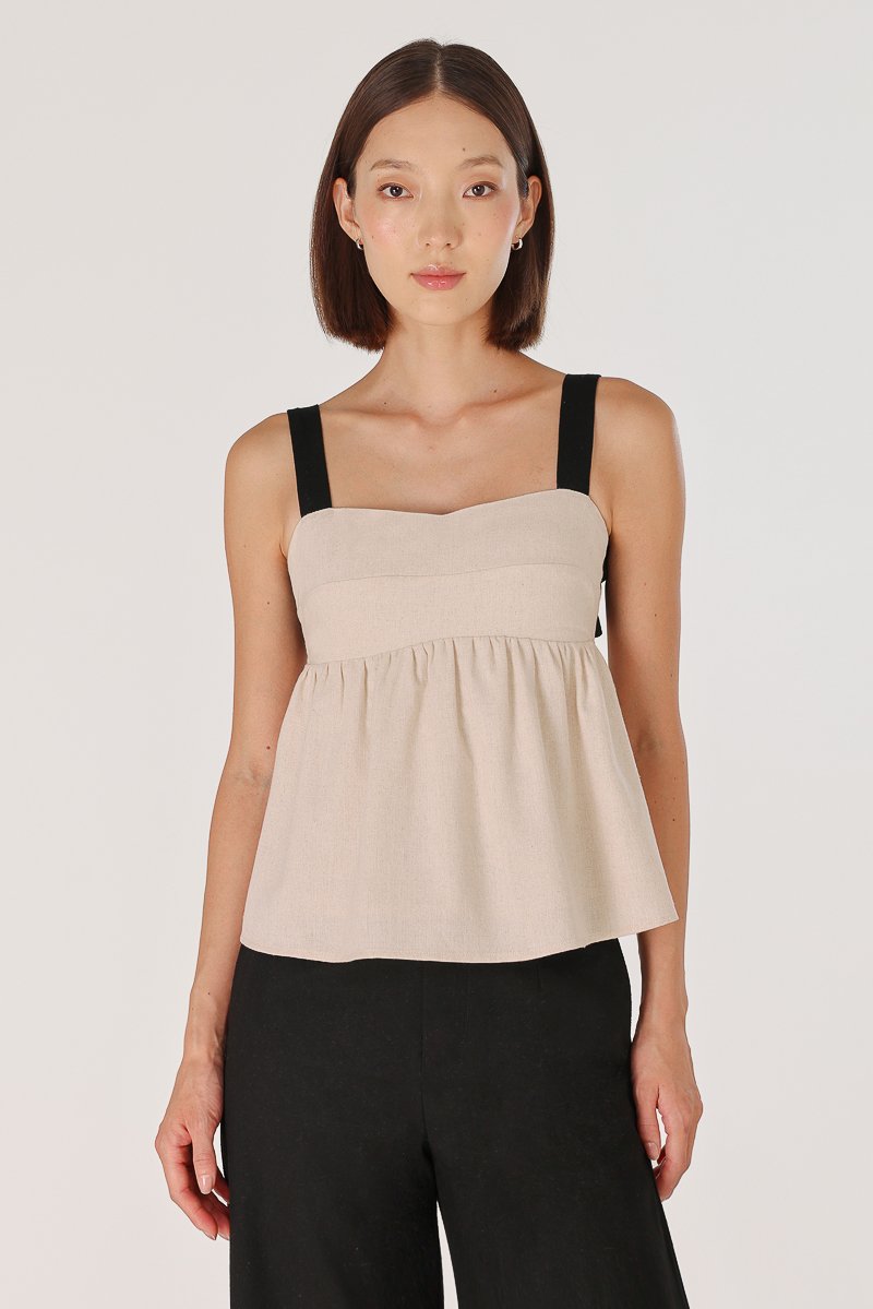 ORLENA PADDED LINEN CONTRAST STRAP RIBBON TIE-BACK TOP (NATURAL)