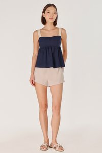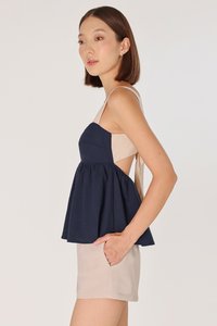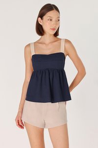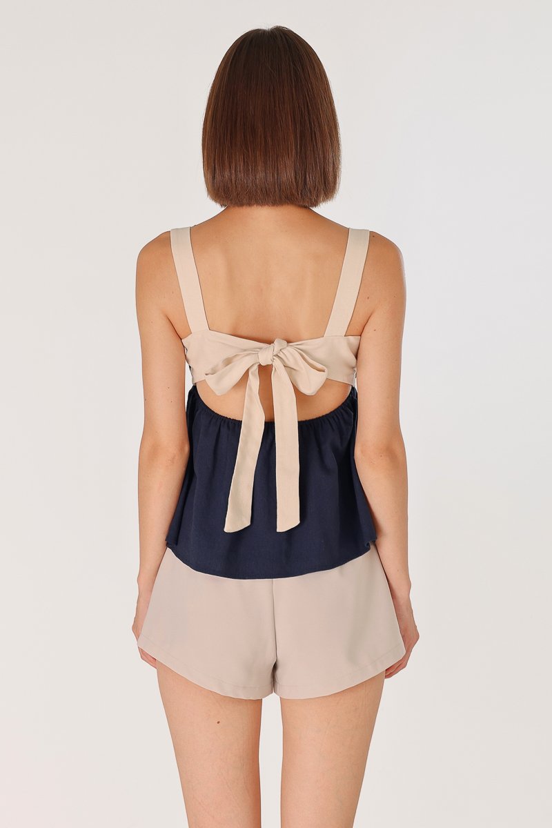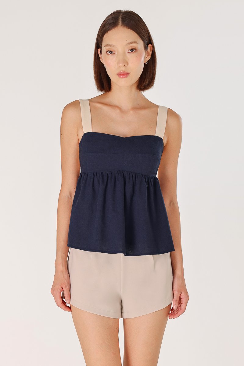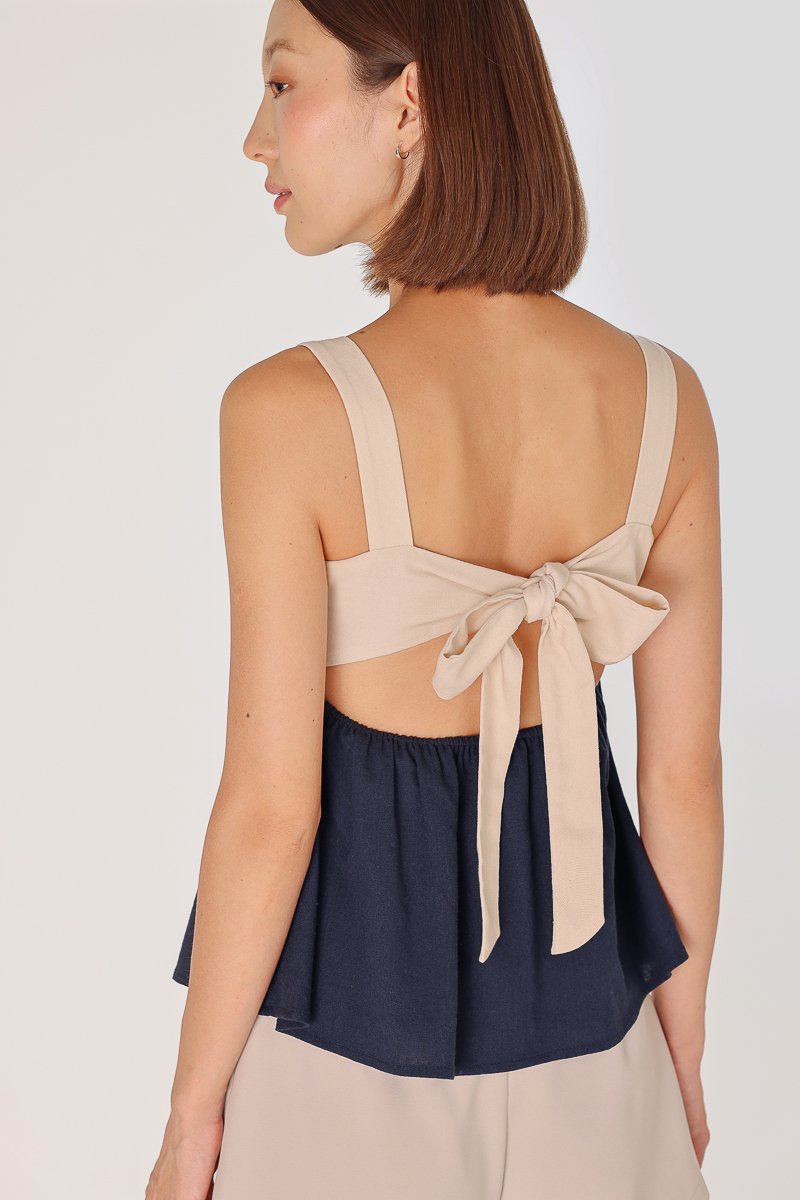ORLENA PADDED LINEN CONTRAST STRAP RIBBON TIE-BACK TOP (NAVY)