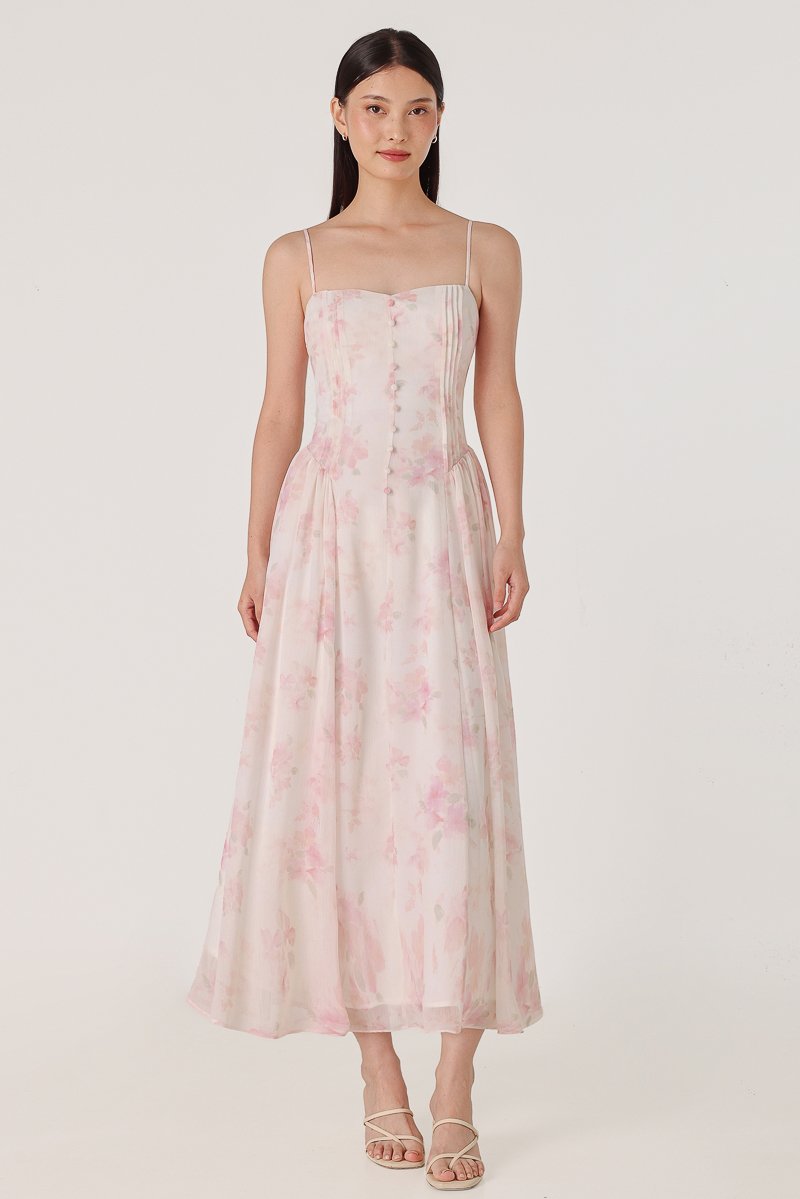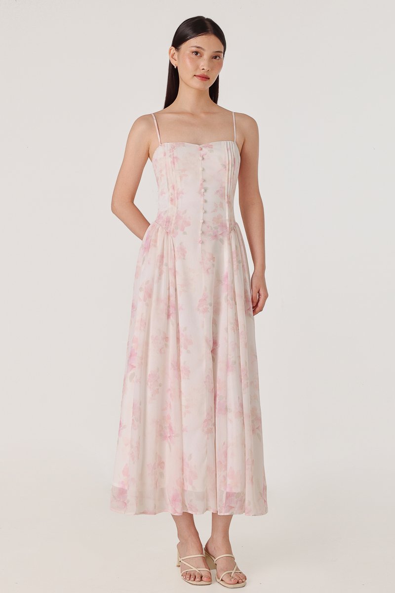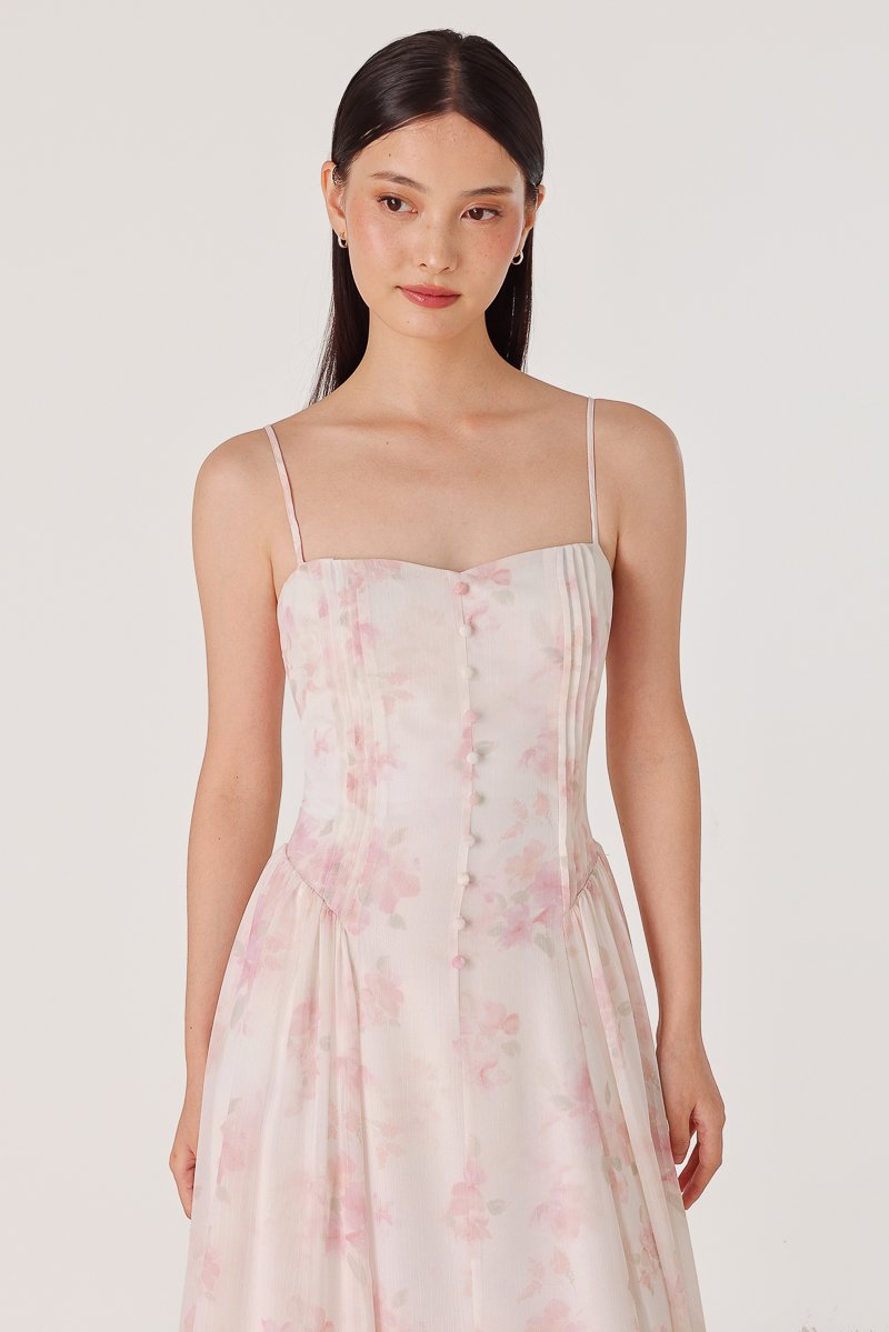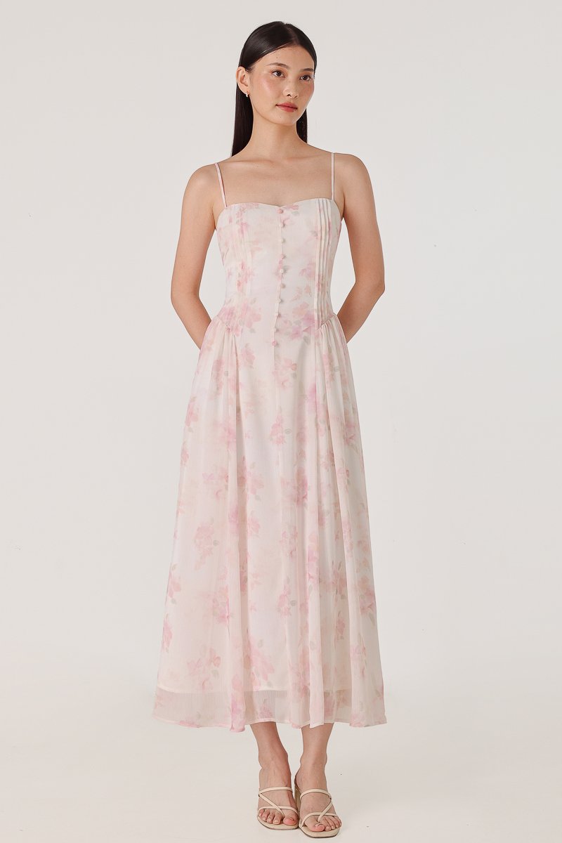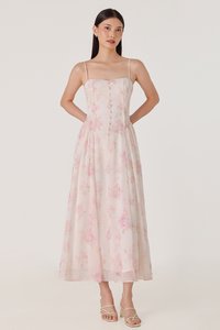 PEONY PADDED CHIFFON FLORAL BASQUE WAIST BUTTON MIDAXI DRESS