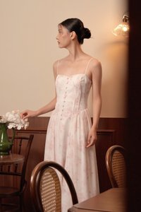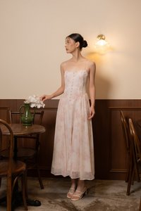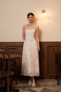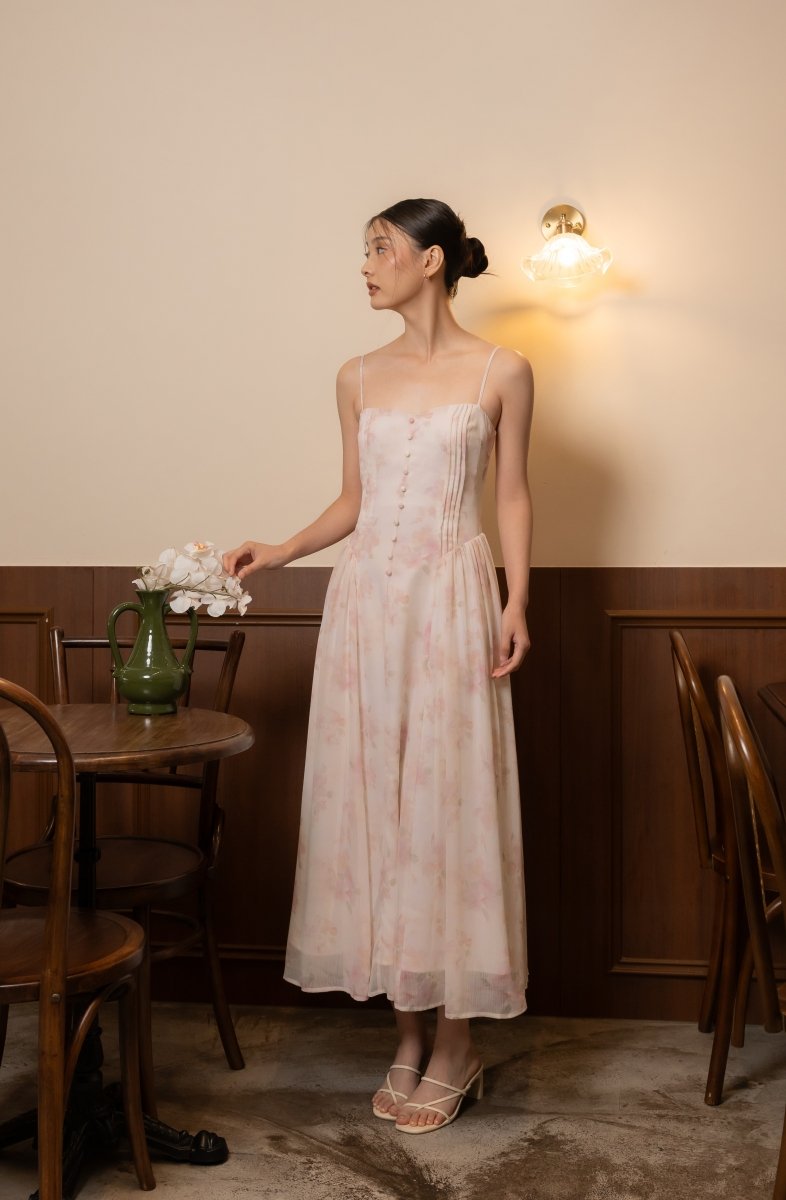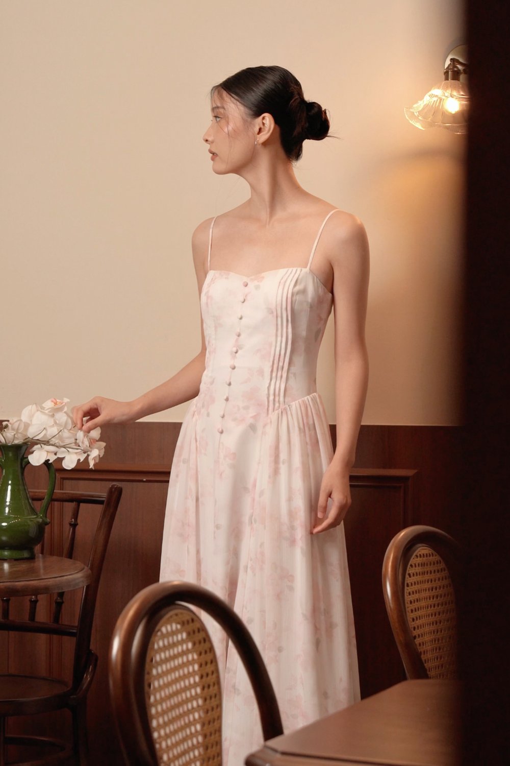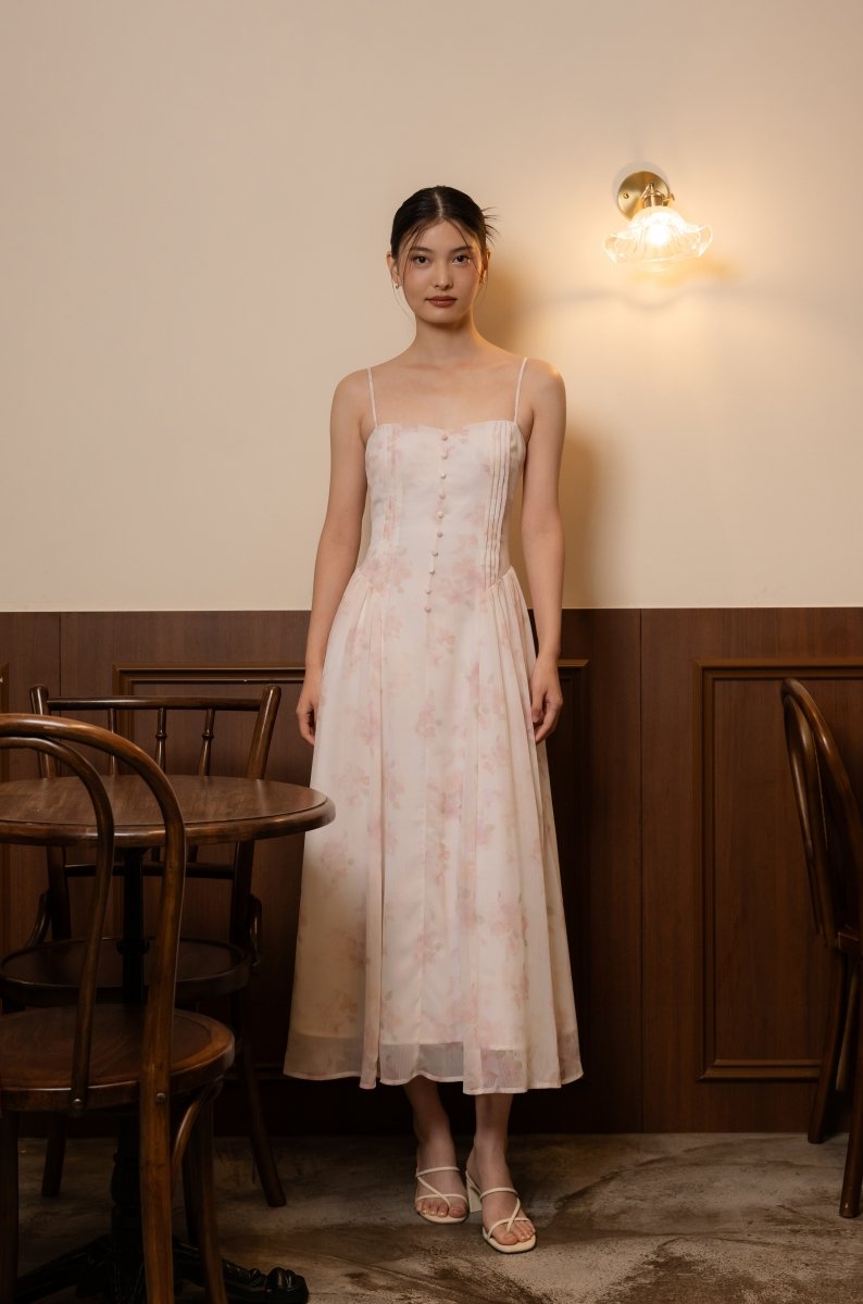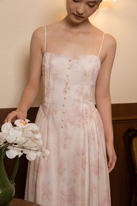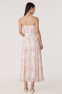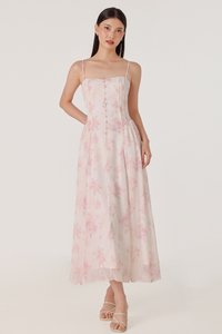 PEONY PADDED CHIFFON FLORAL BASQUE WAIST BUTTON MIDAXI DRESS