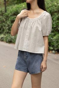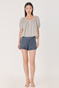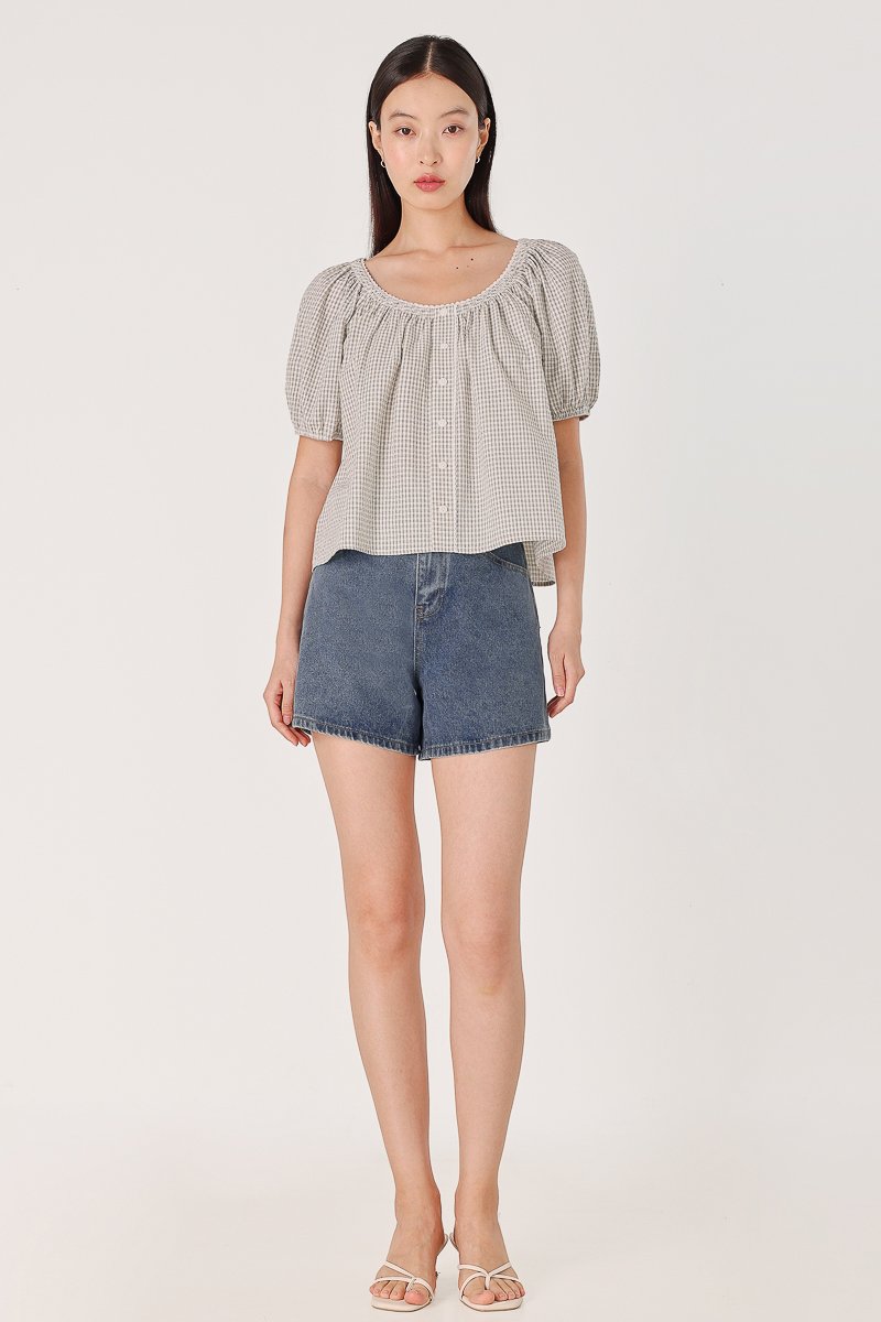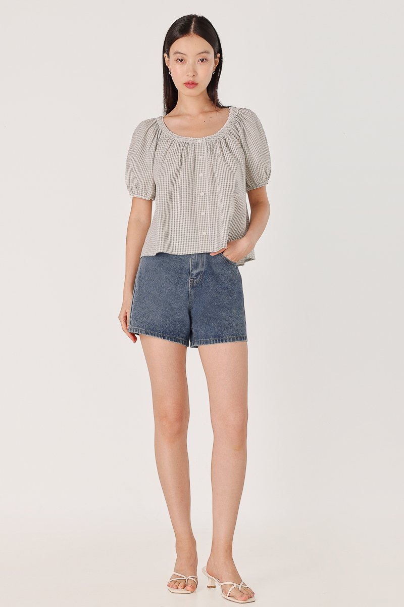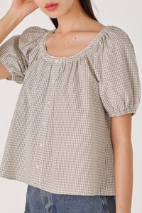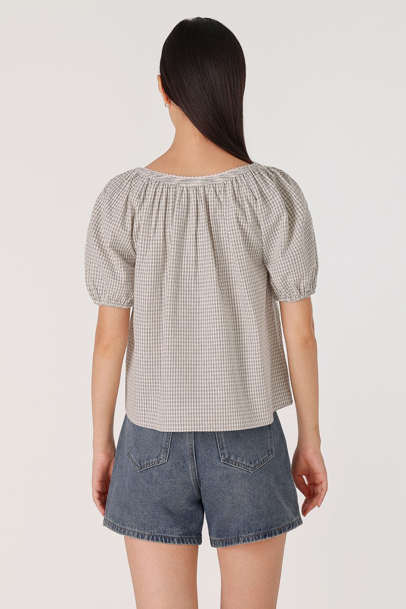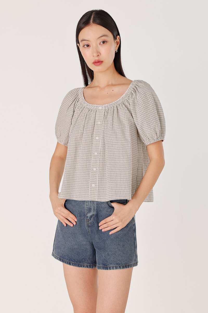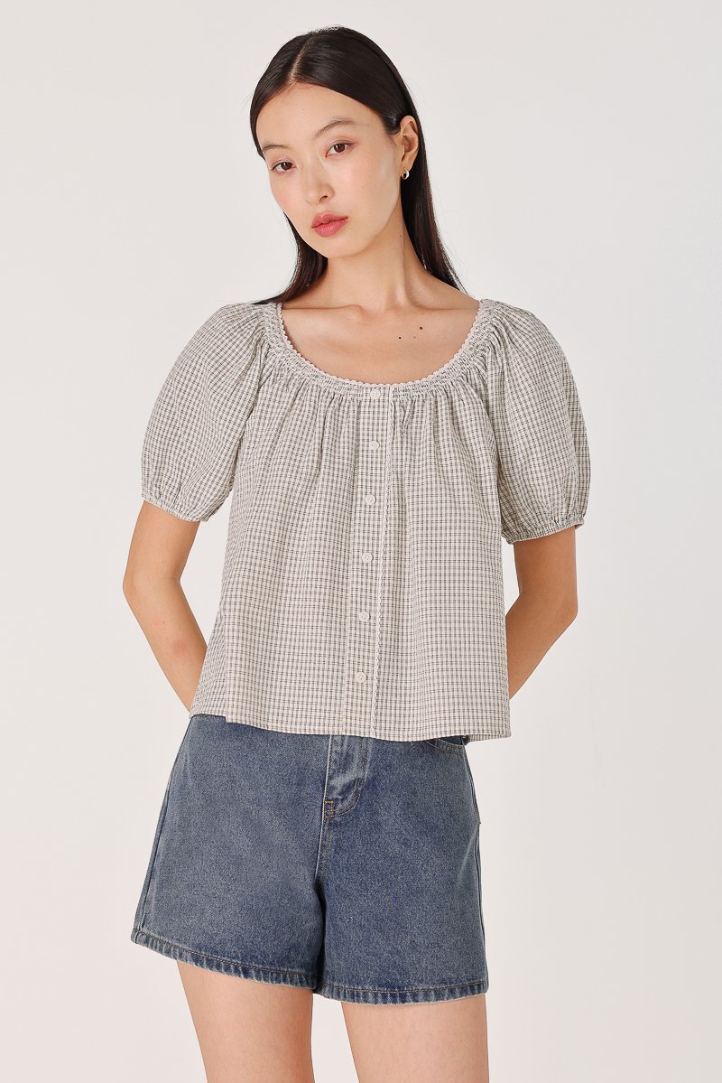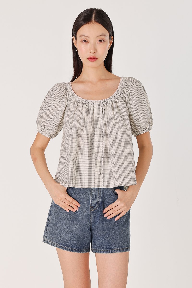 PIPER CHECKERED SMOCKED-NECK EYELET TRIM BUTTON BLOUSE (WHITE)