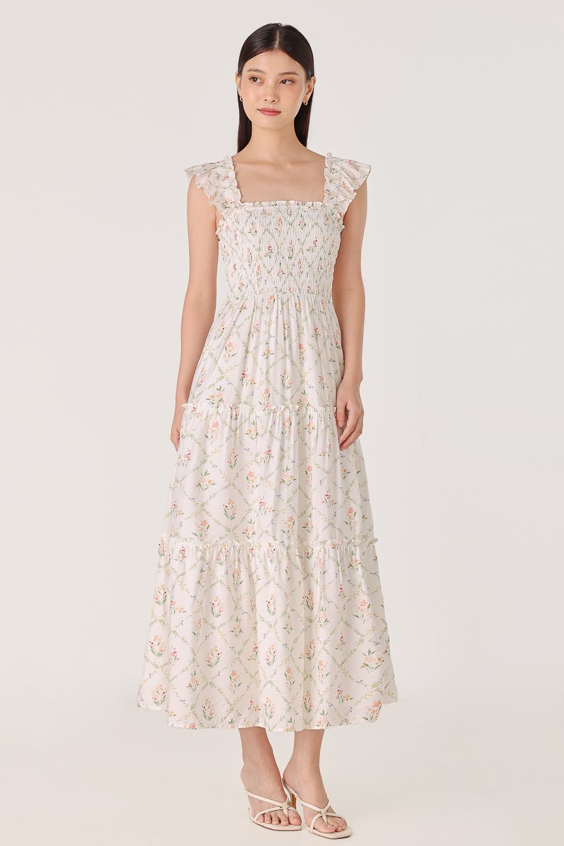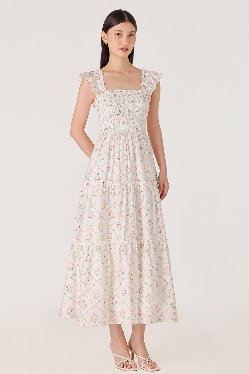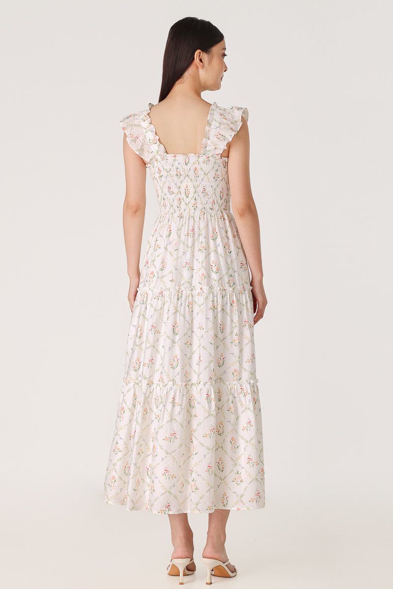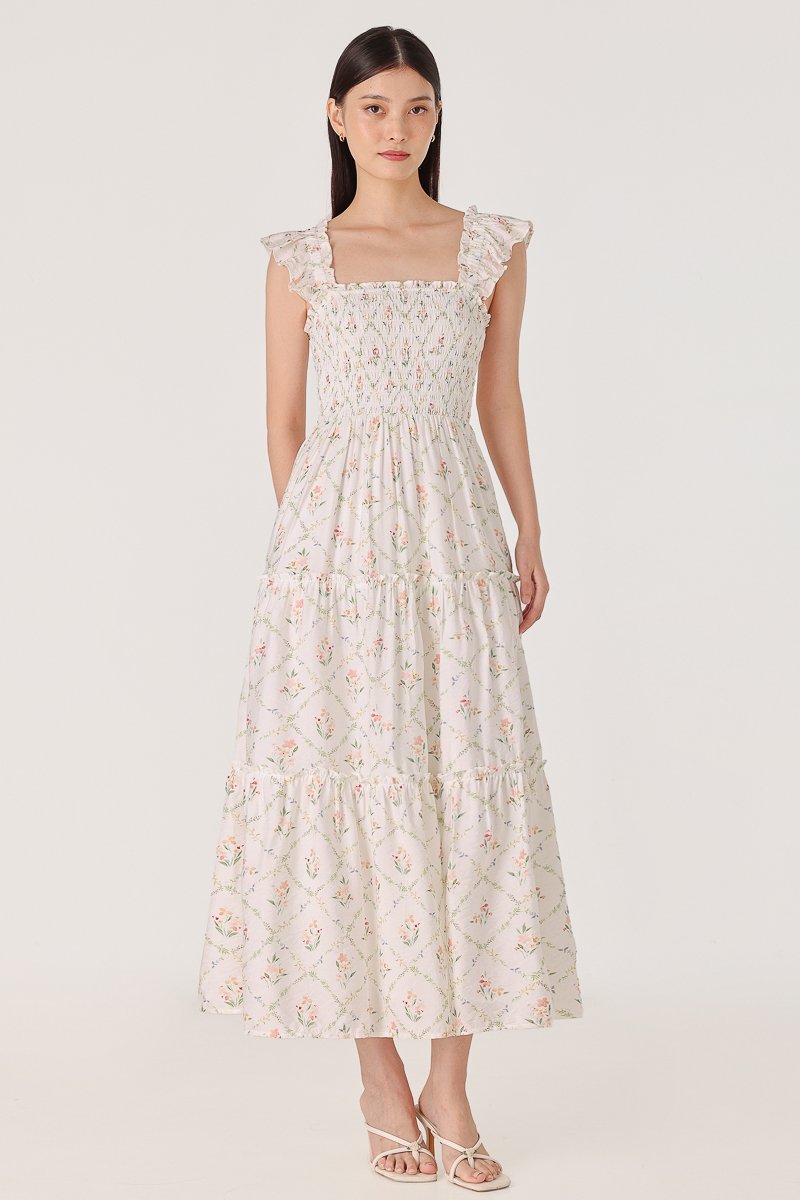 PRIMROSE PADDED FLORAL SMOCKED FLARE RUFFLE TIERED MAXI DRESS