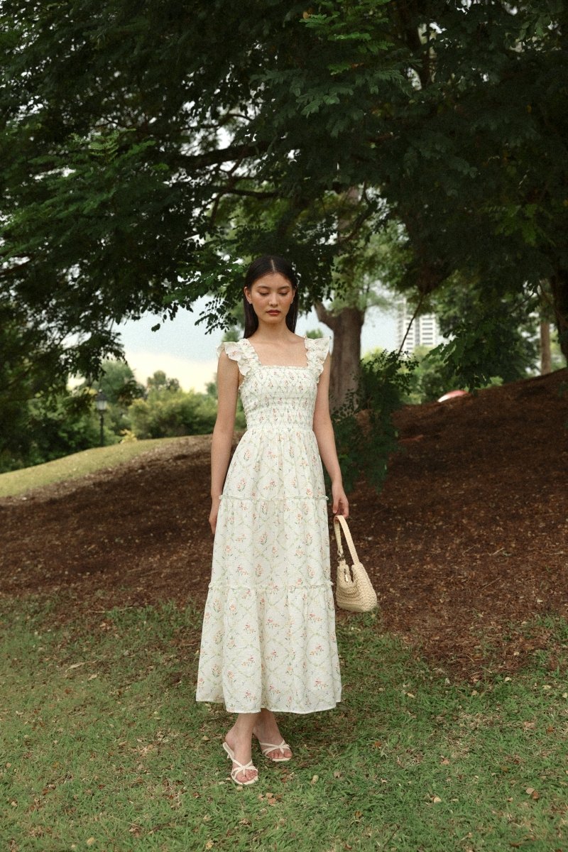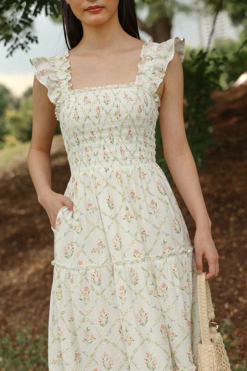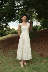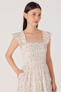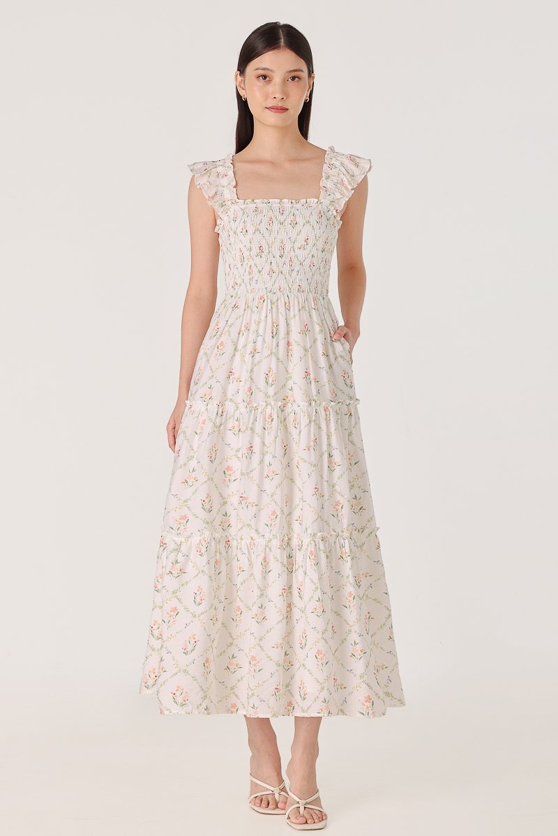 PRIMROSE PADDED FLORAL SMOCKED FLARE RUFFLE TIERED MAXI DRESS