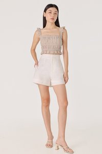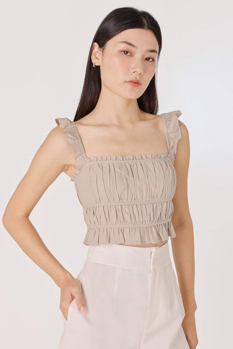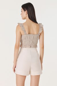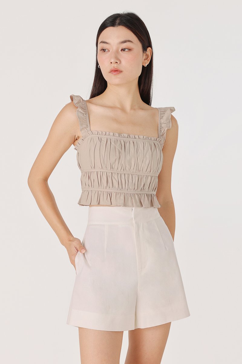 HADLEY PADDED LINEN RUFFLE STRAP RUCHED TOP (BONE)