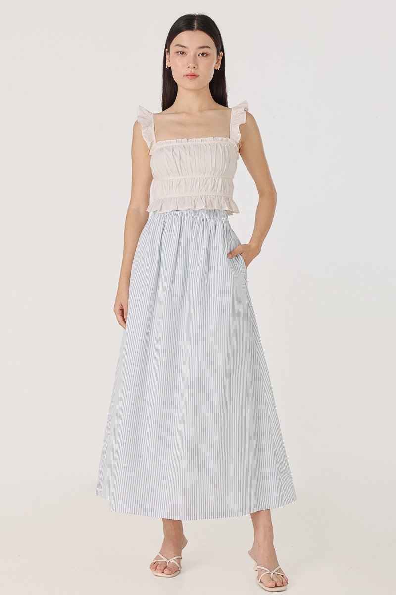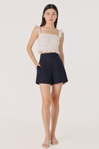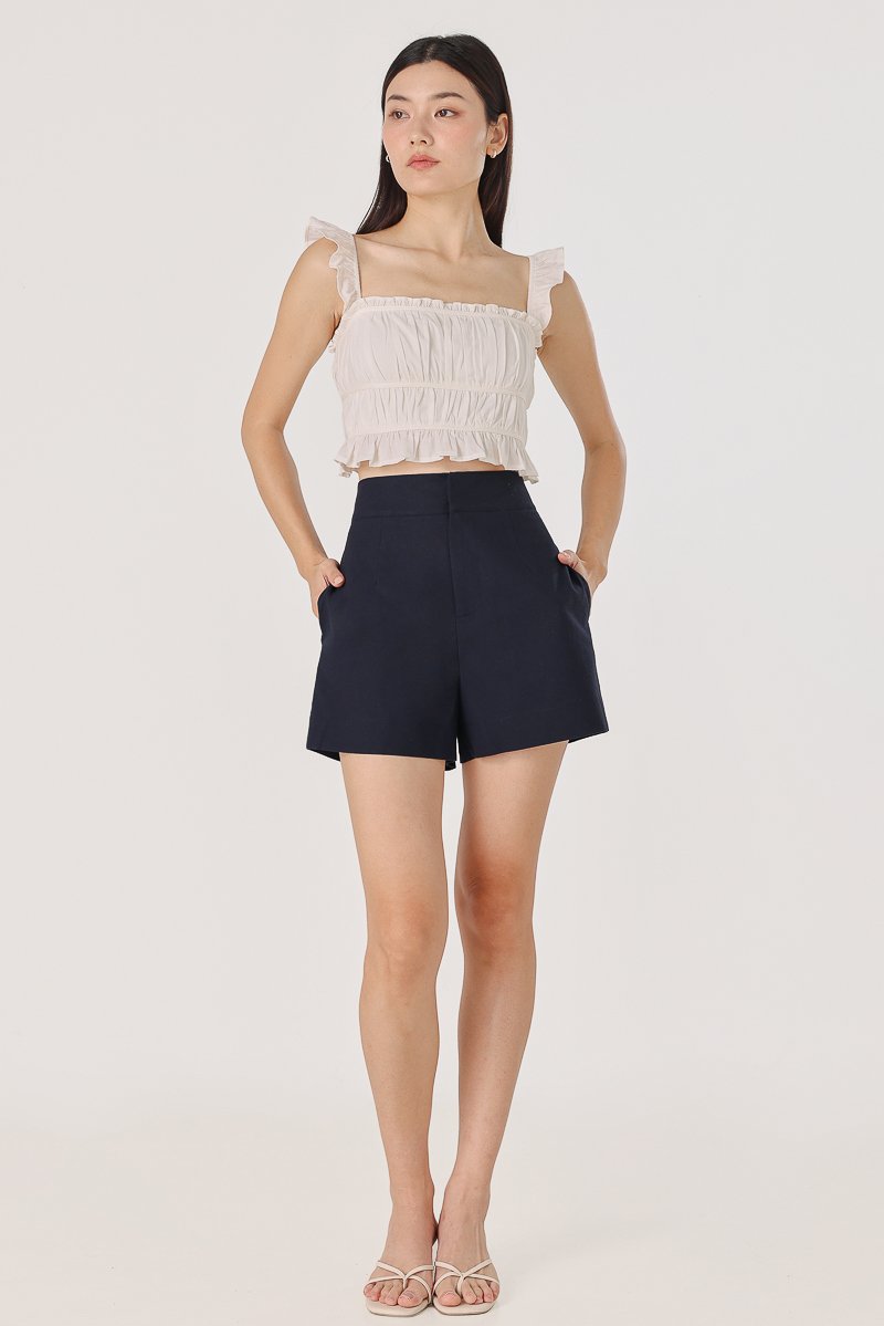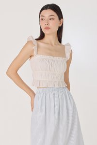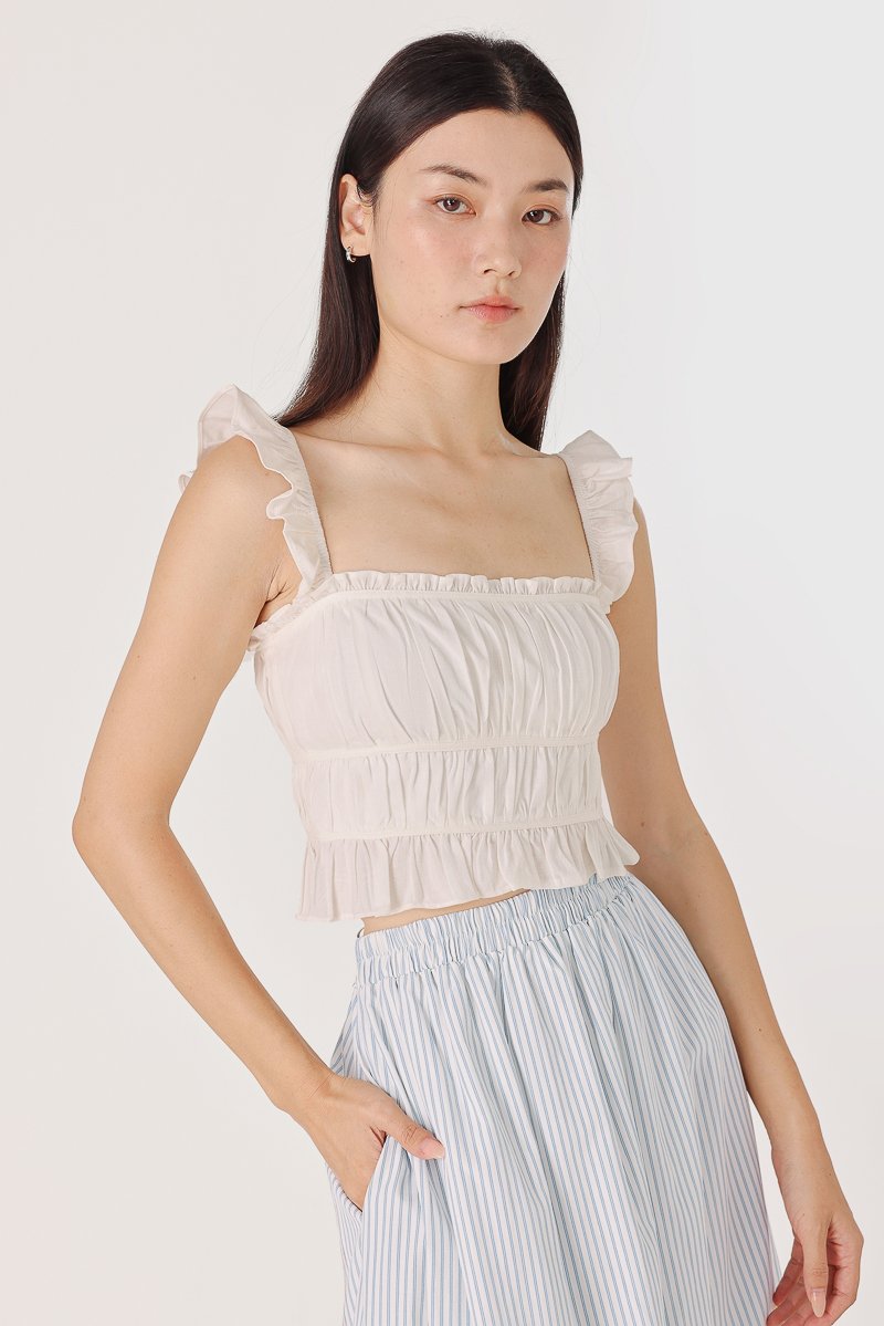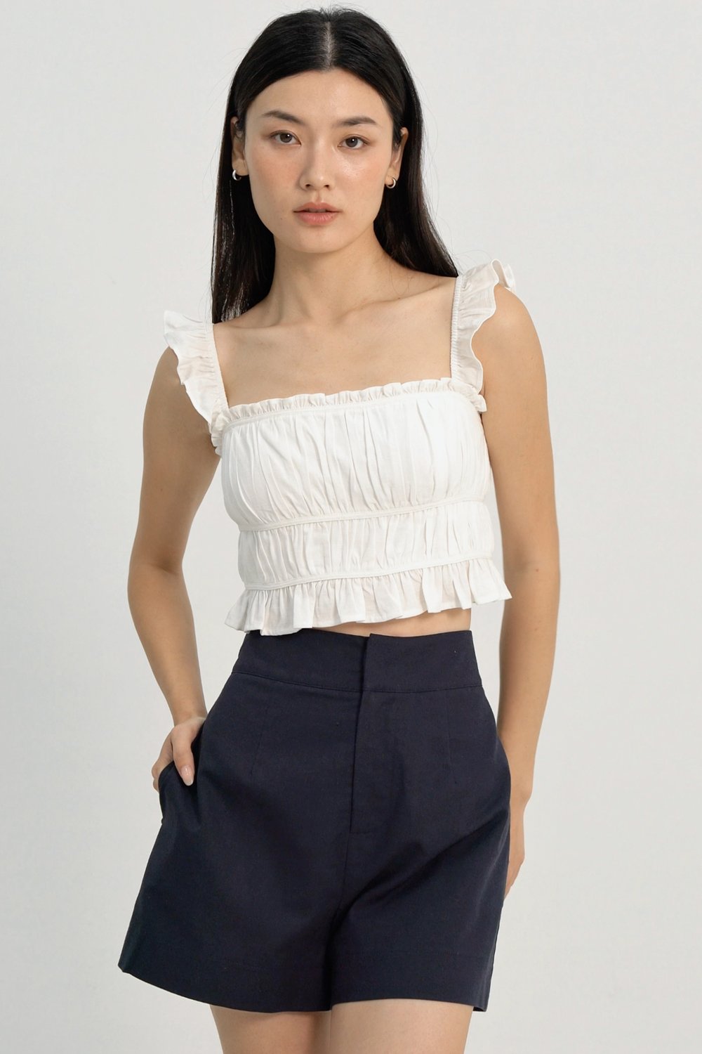 HADLEY PADDED LINEN RUFFLE STRAP RUCHED TOP (WHITE)