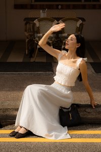 Model Du Yue UK6, 173.5cm (PTP 15.25", Waist 11.5") wears size S for tops/dresses/outerwears/one-pieces and size XS for bottoms.
