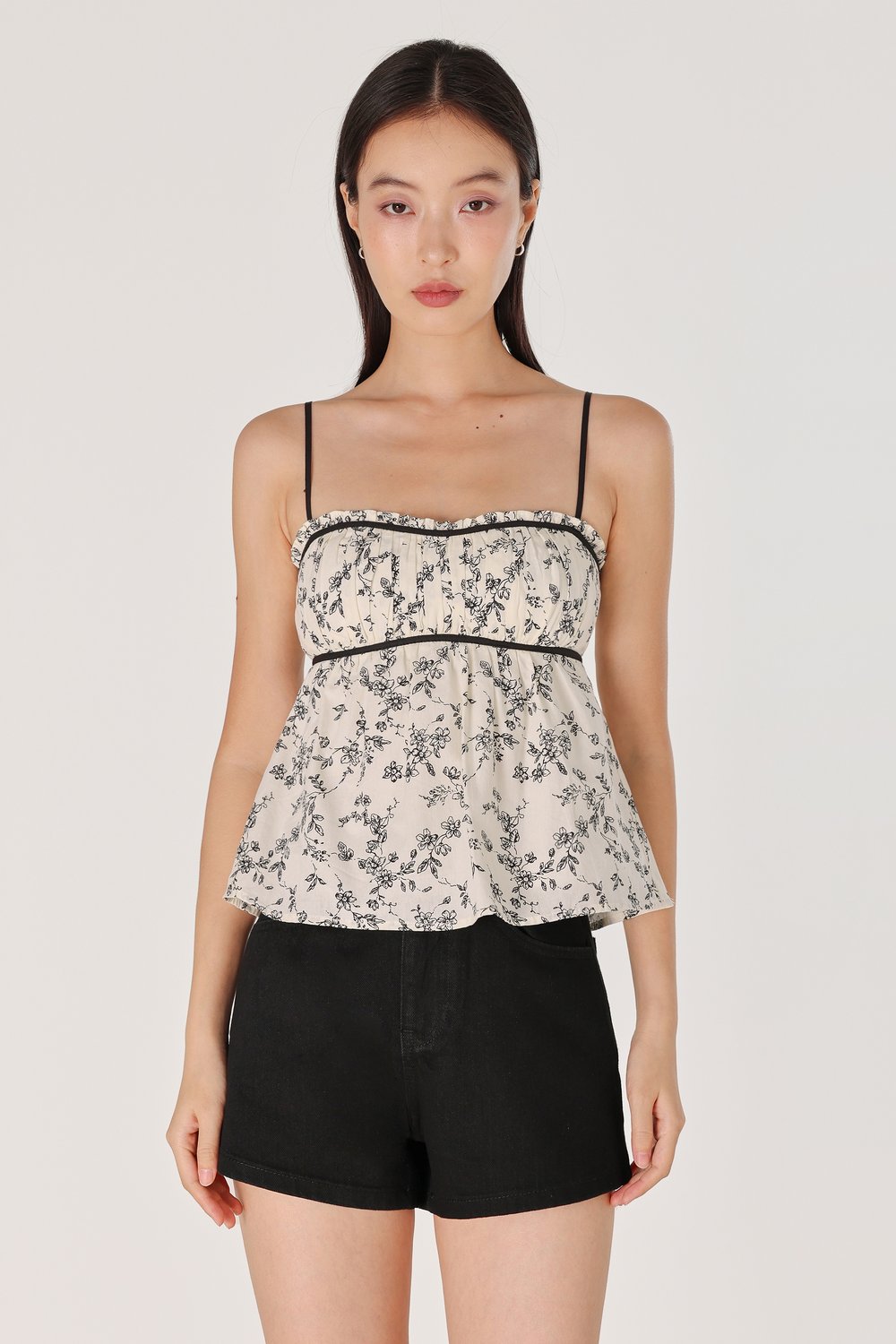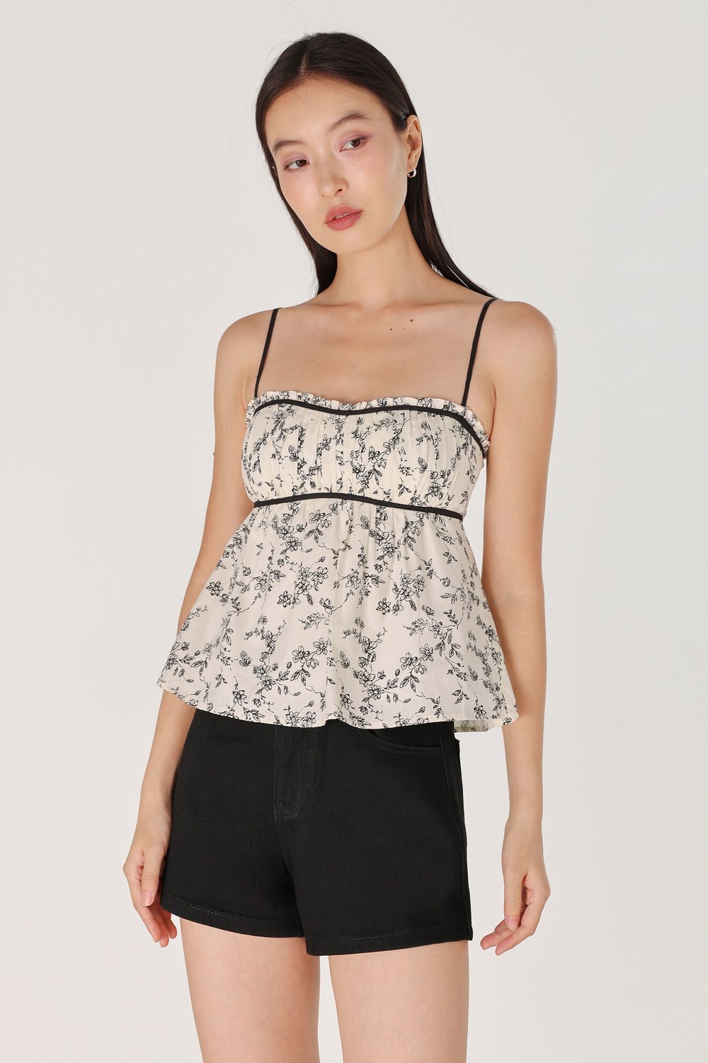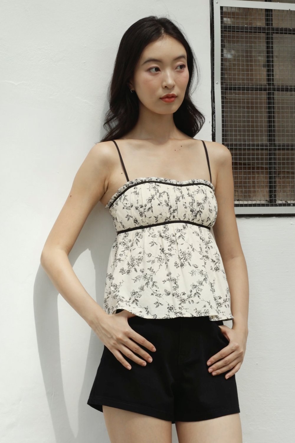 ROSANNE PADDED FLORAL RUCHED CONTRAST TRIM RUFFLE BABYDOLL TOP